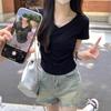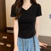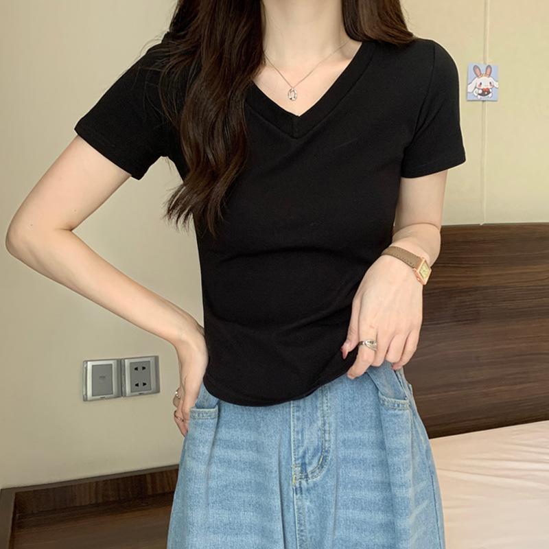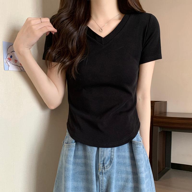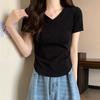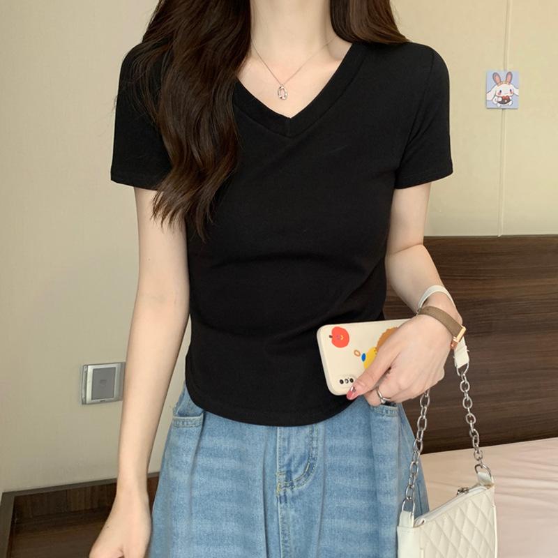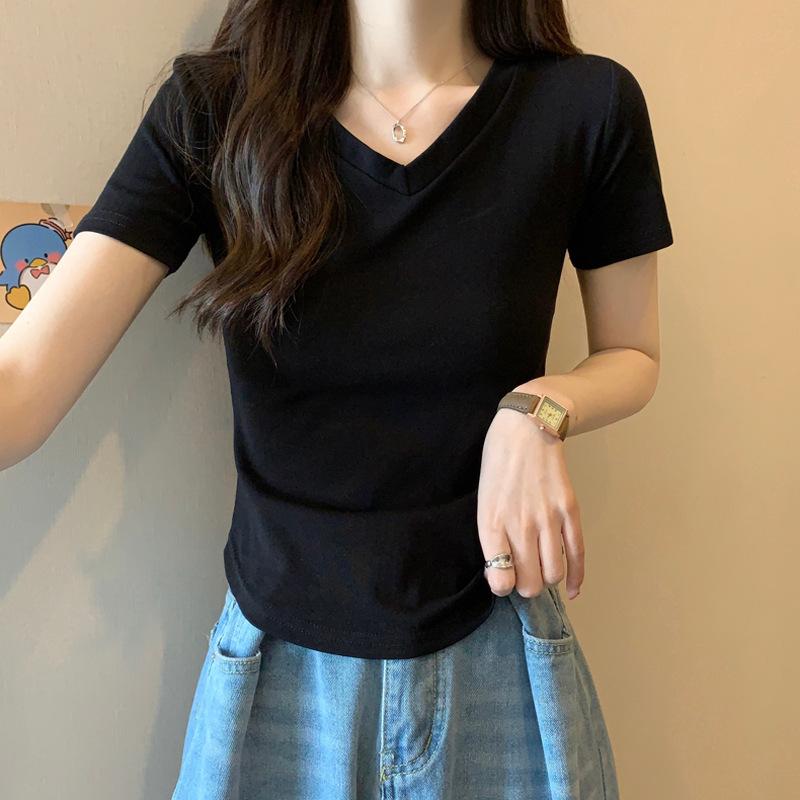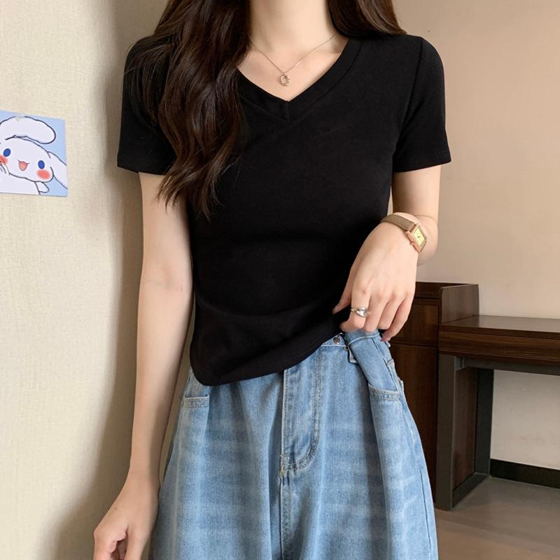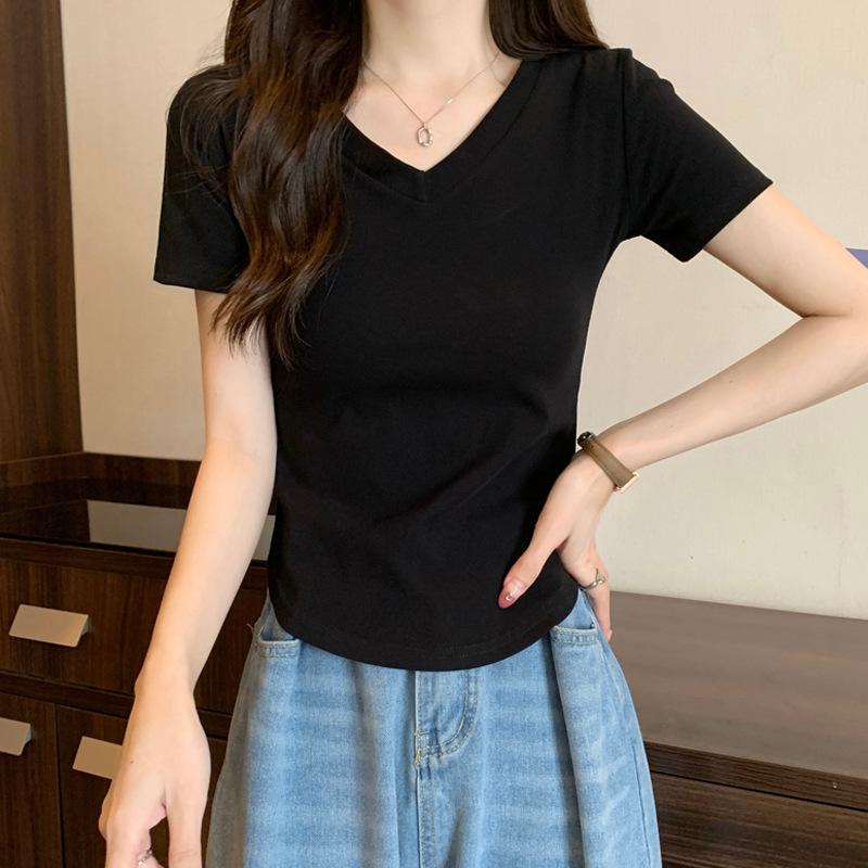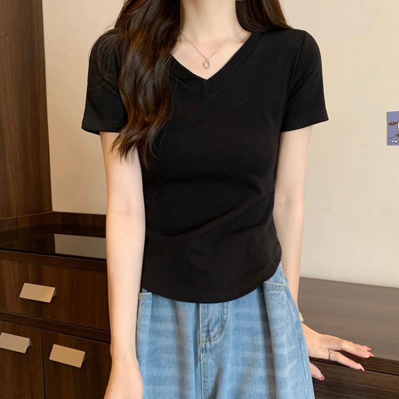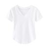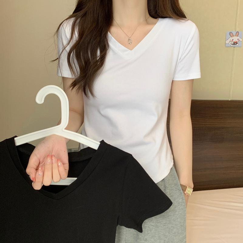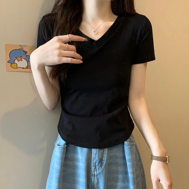 Playera Blanca de Algodón Puro con Cuello en V para Mujer de Manga Corta 2024 Nuevo Verano Básica Top de Manga Corta con Hombro Derecho Descubierto para Personas Pequeñas