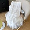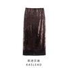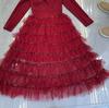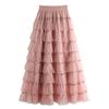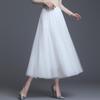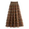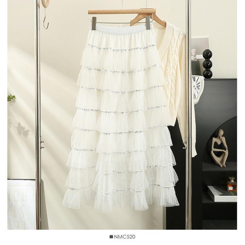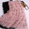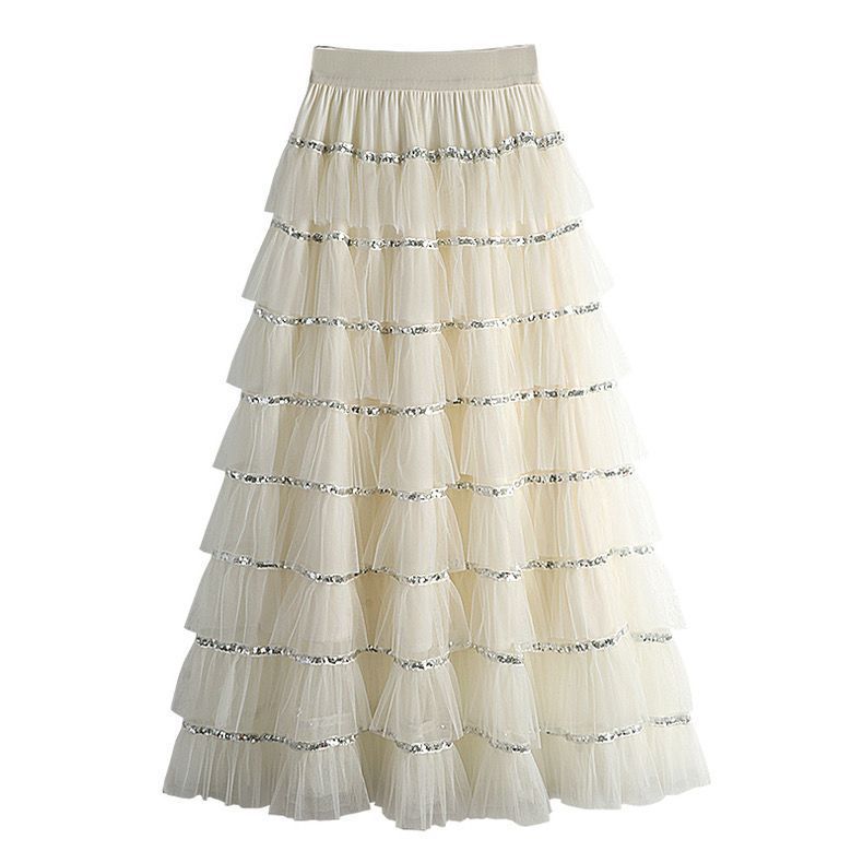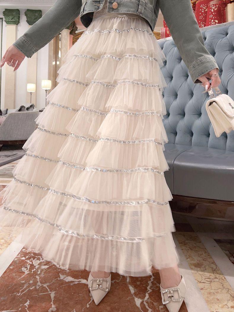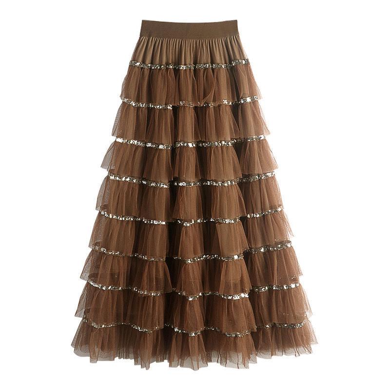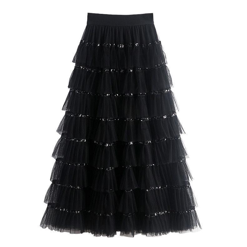 Falda de Pastel de Malla con Lentejuelas Pesadas para Mujer Primavera y Verano Nuevo Dulce Cintura Alta Ajustada Largo Medio