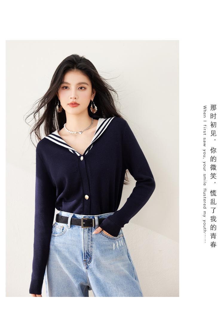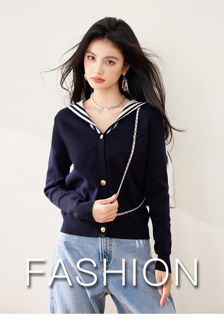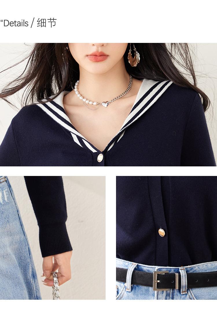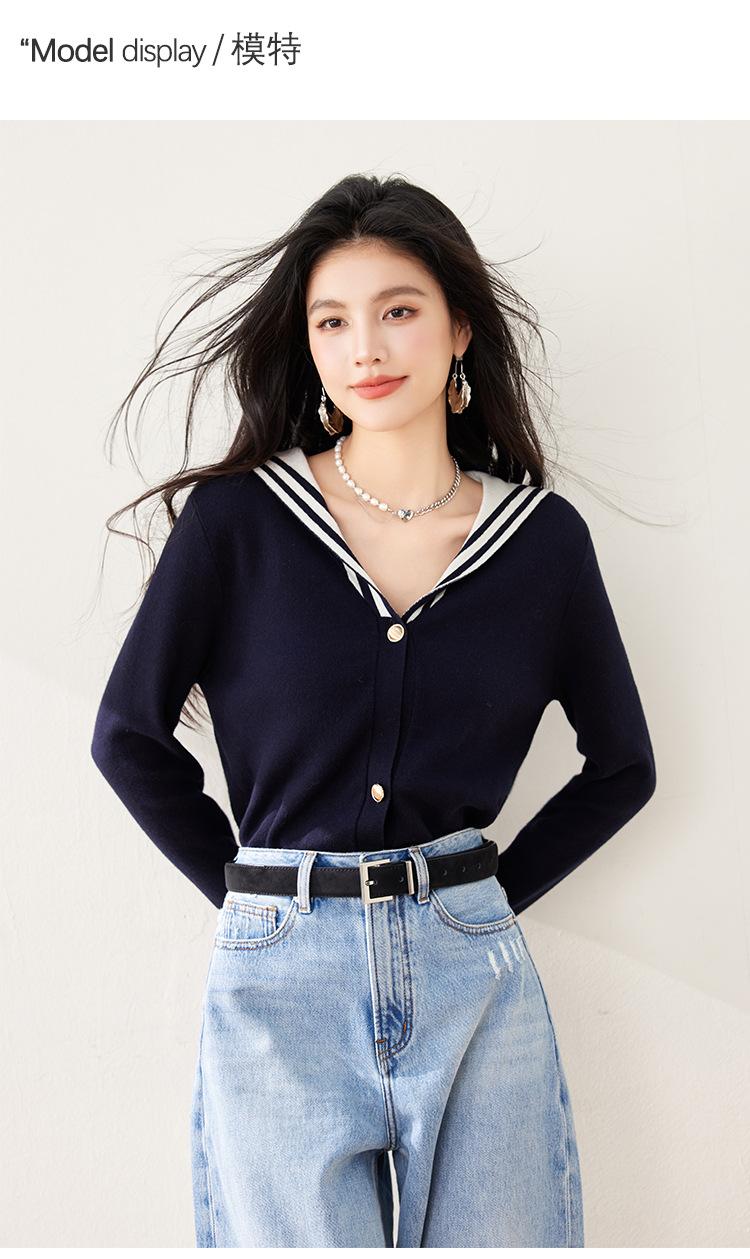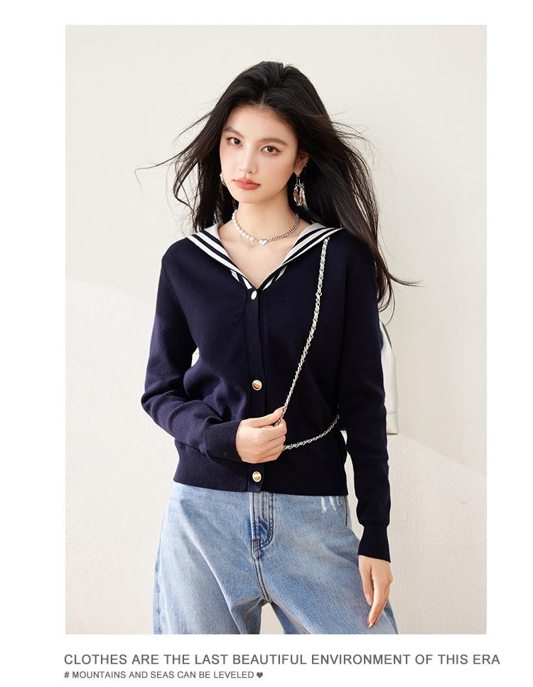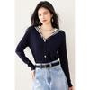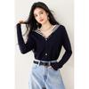 Suéter estilo Chanel francés, primavera 2025, nuevo cárdigan de punto con cuello azul marino y costuras en contraste para mujer