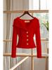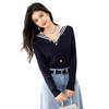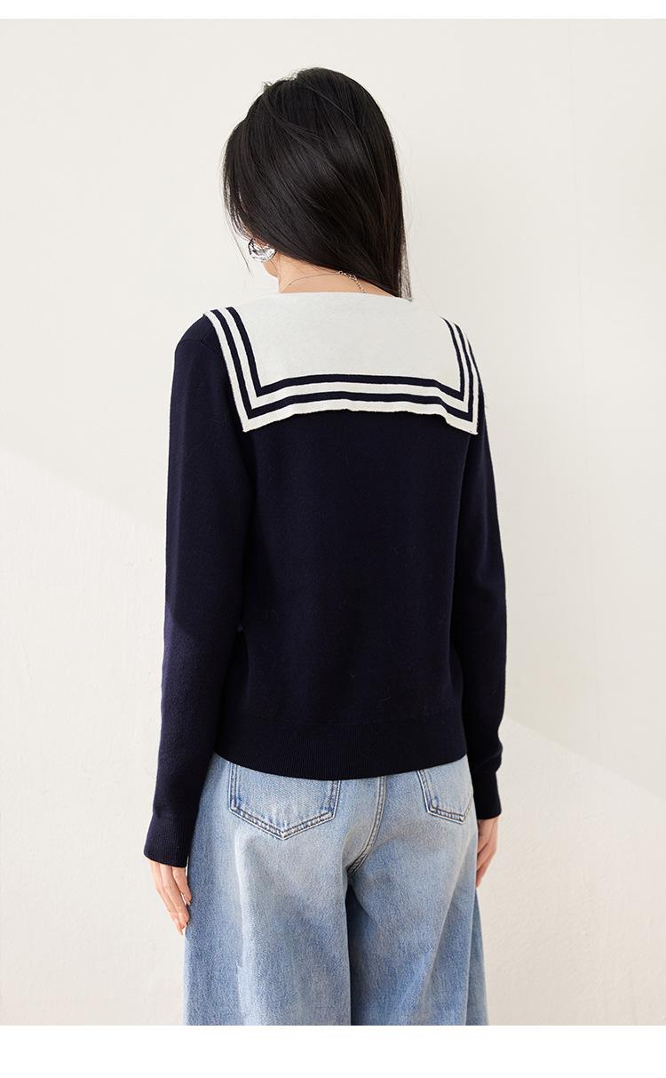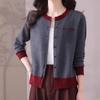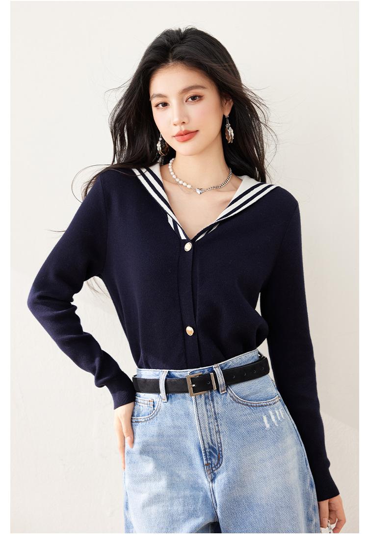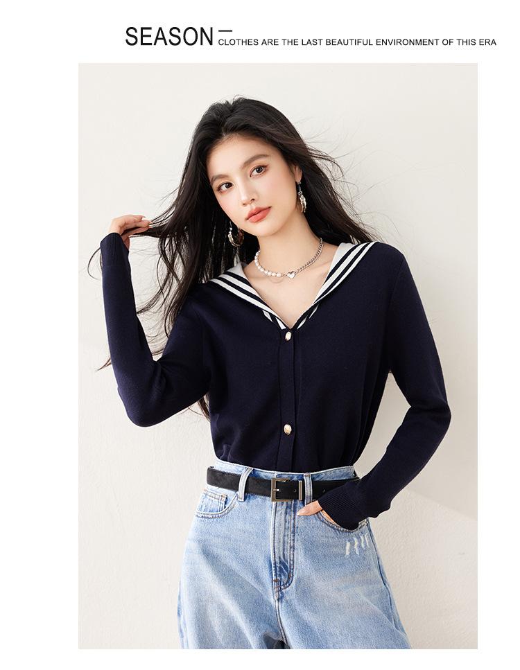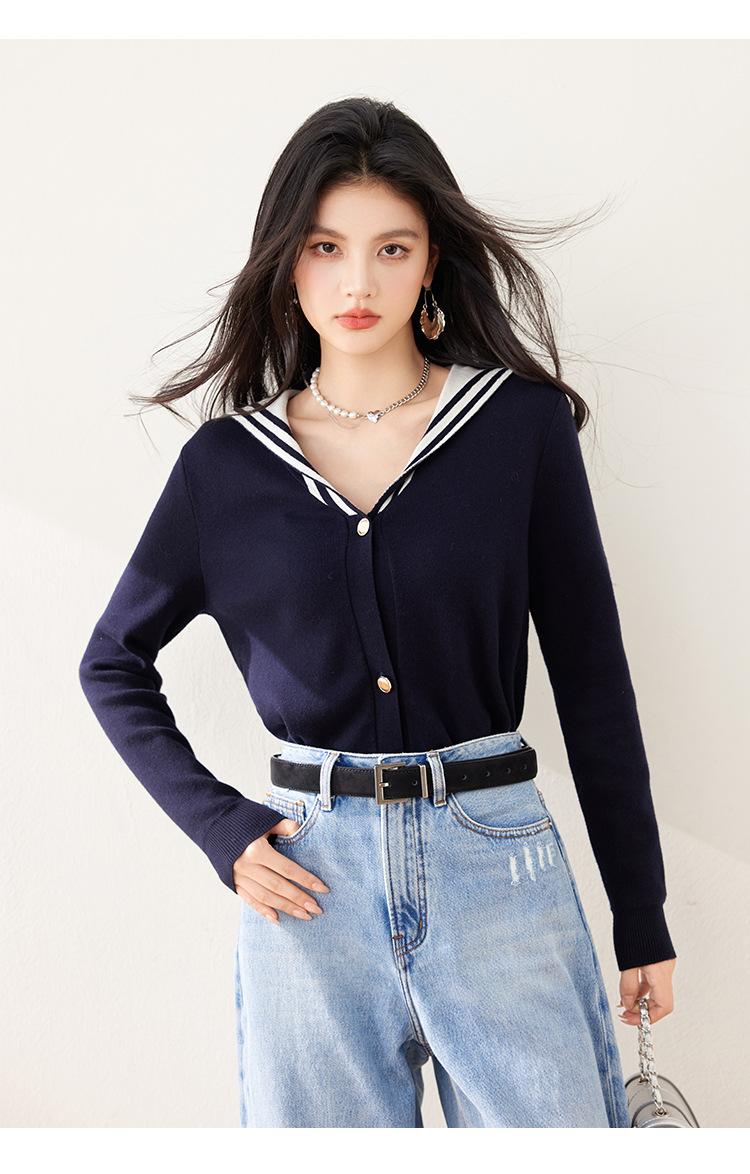 Suéter estilo Chanel francés, primavera 2025, nuevo cárdigan de punto con cuello azul marino y costuras en contraste para mujer