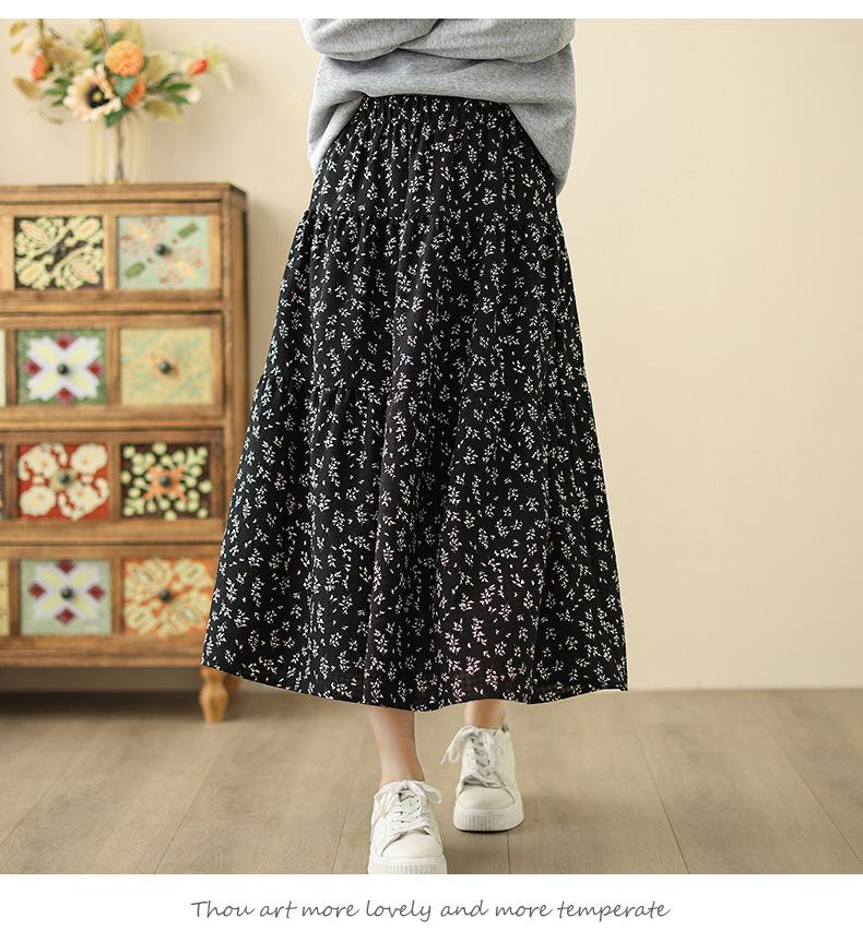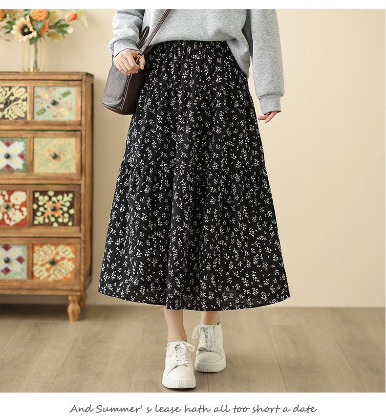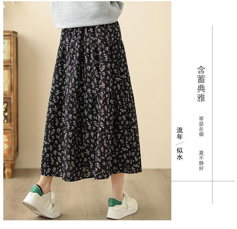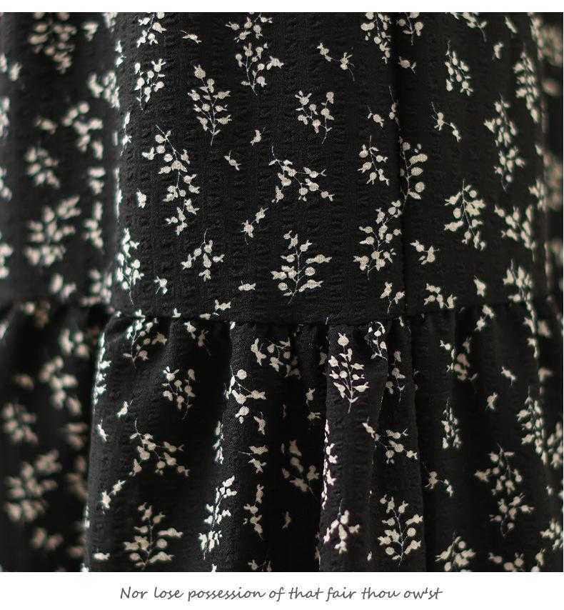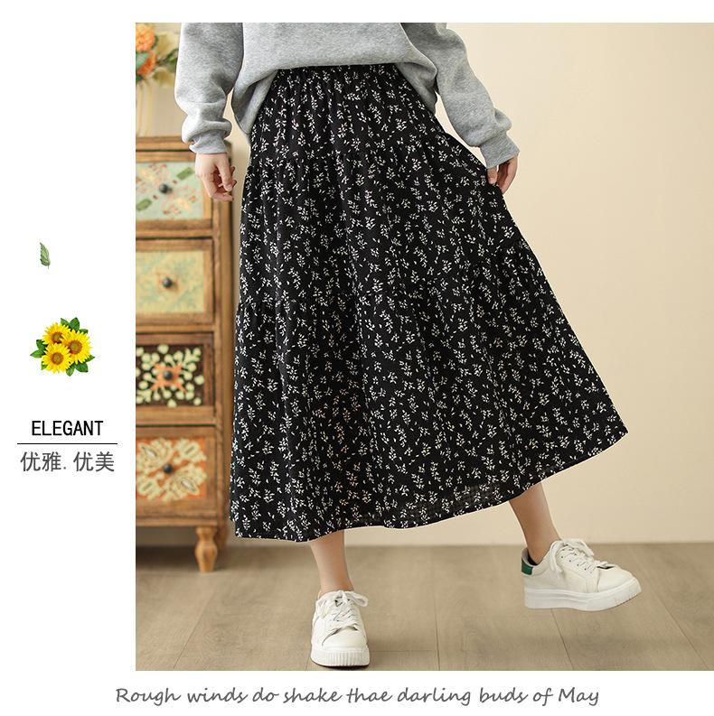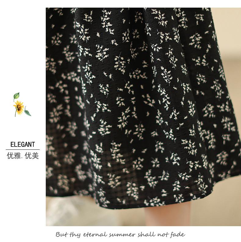 Falda floral negra 2025 para mujer, primavera y otoño, estilo retro francés, corta, drapeada, de longitud media, de corte A.
