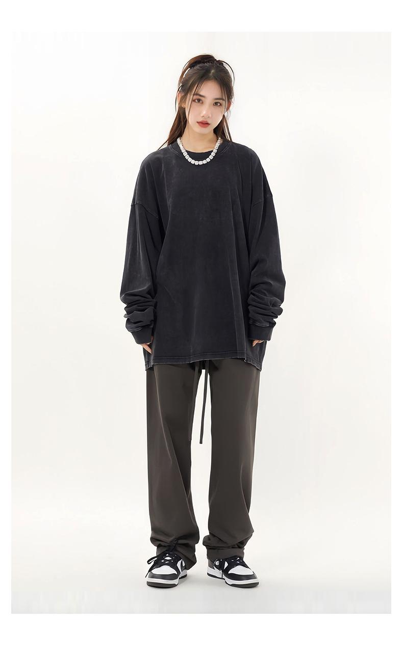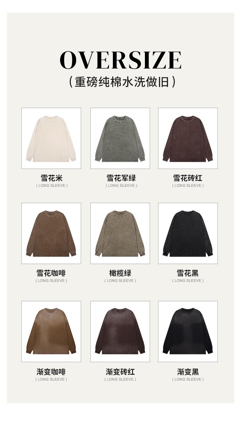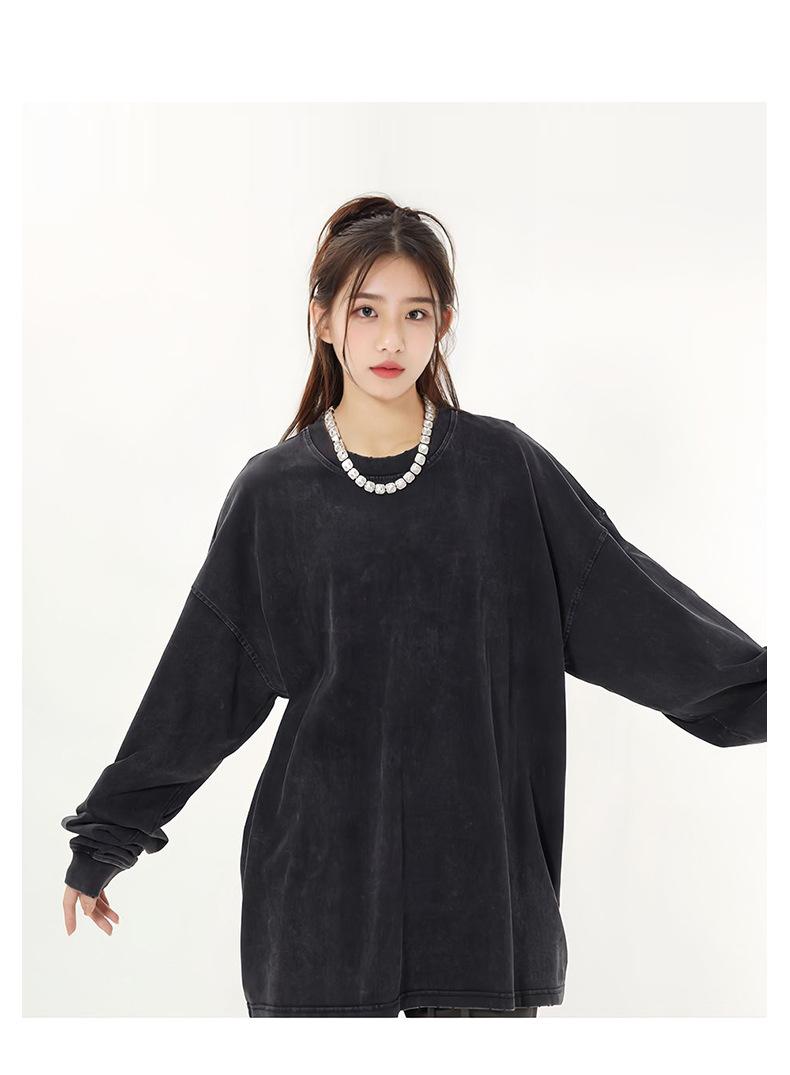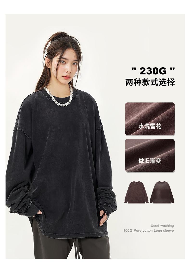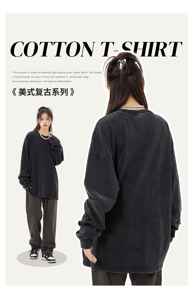 Camiseta de manga larga de hombro caído de marca de moda pesada retro desgastada para mujer, versátil, oversize, estilo europeo y americano ins, camiseta básica para pareja
