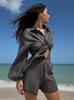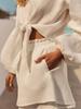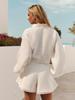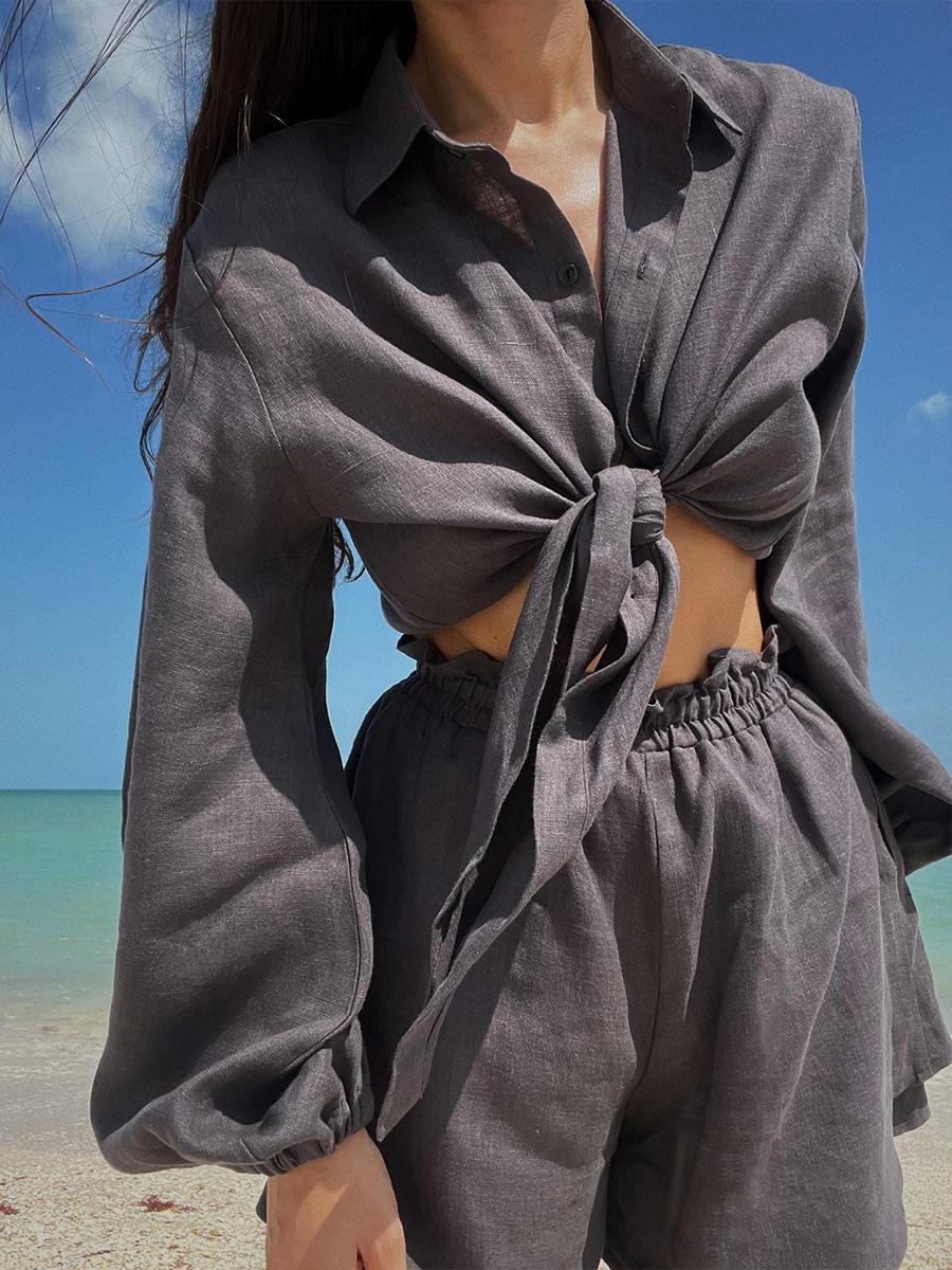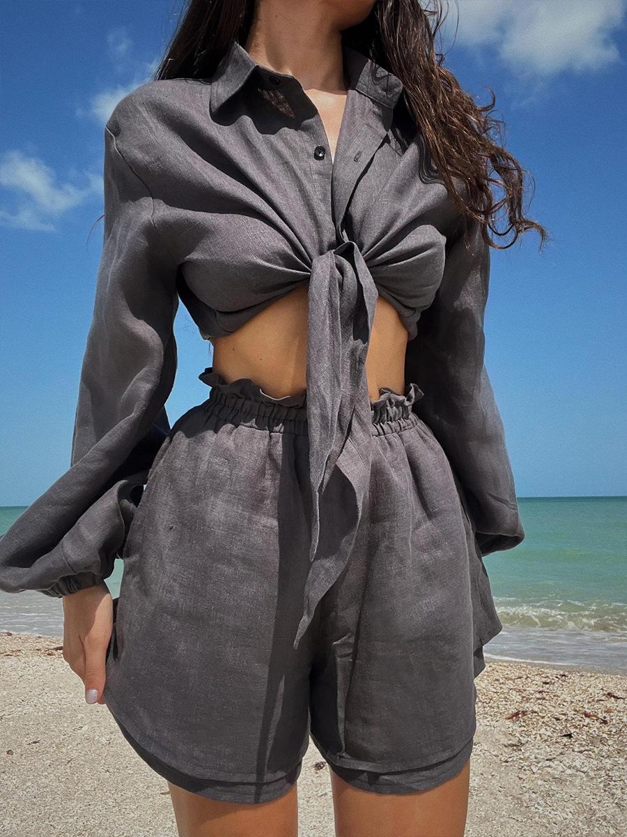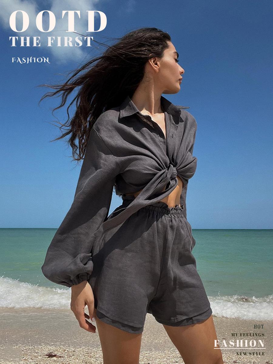 Top de manga abullonada de algodón puro transfronterizo, traje de shorts falsos de dos piezas, Europa y Estados Unidos 2025 primavera nuevo traje casual para mujer