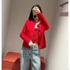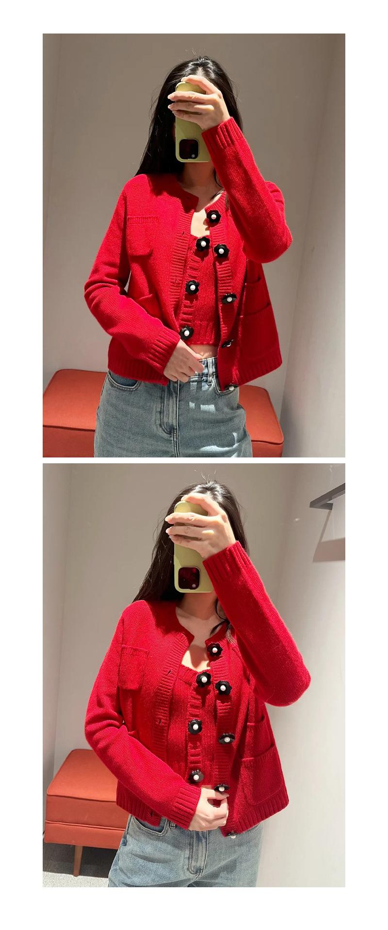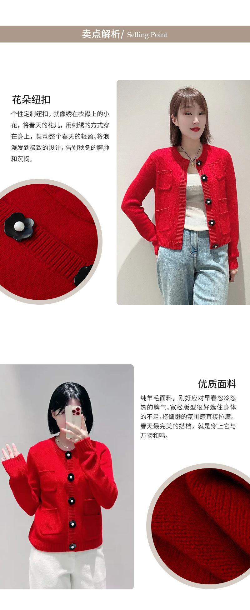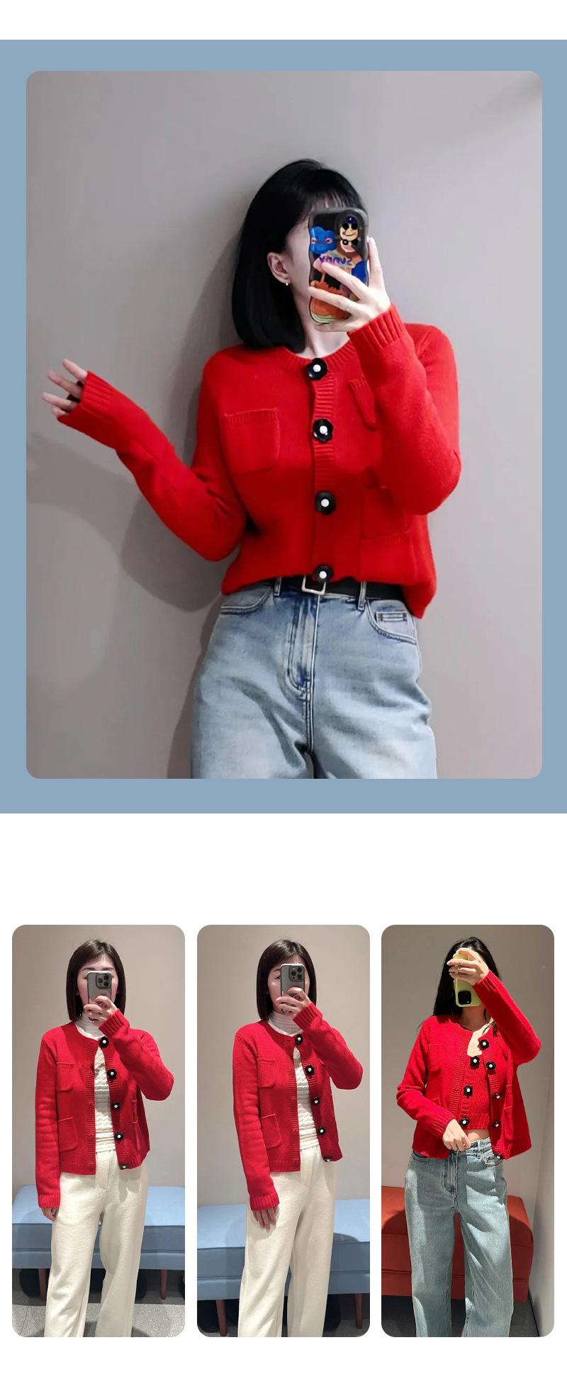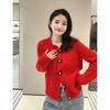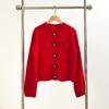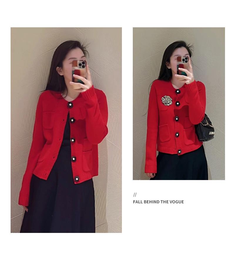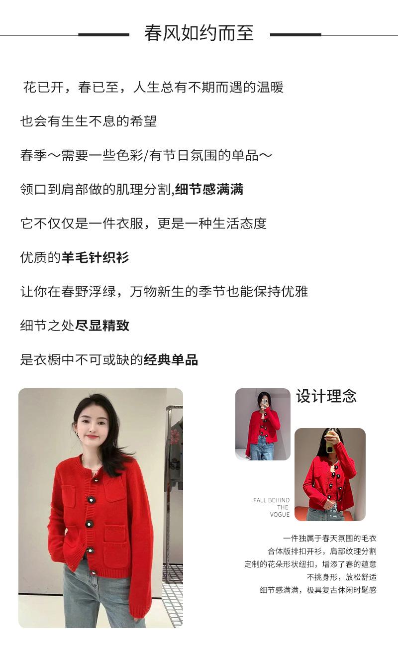 Abrigo de lana con botones de flores y cuello redondo rojo, cárdigan de punto suelto para mujer, primavera 2025, nuevo