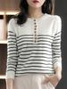 Camiseta de Punto de Algodón de Primavera 2025 para Mujer de Manga Larga con Cuello Redondo, Suéter a Rayas Blancas y Negras, Top Corto Básico para Ropa Exterior