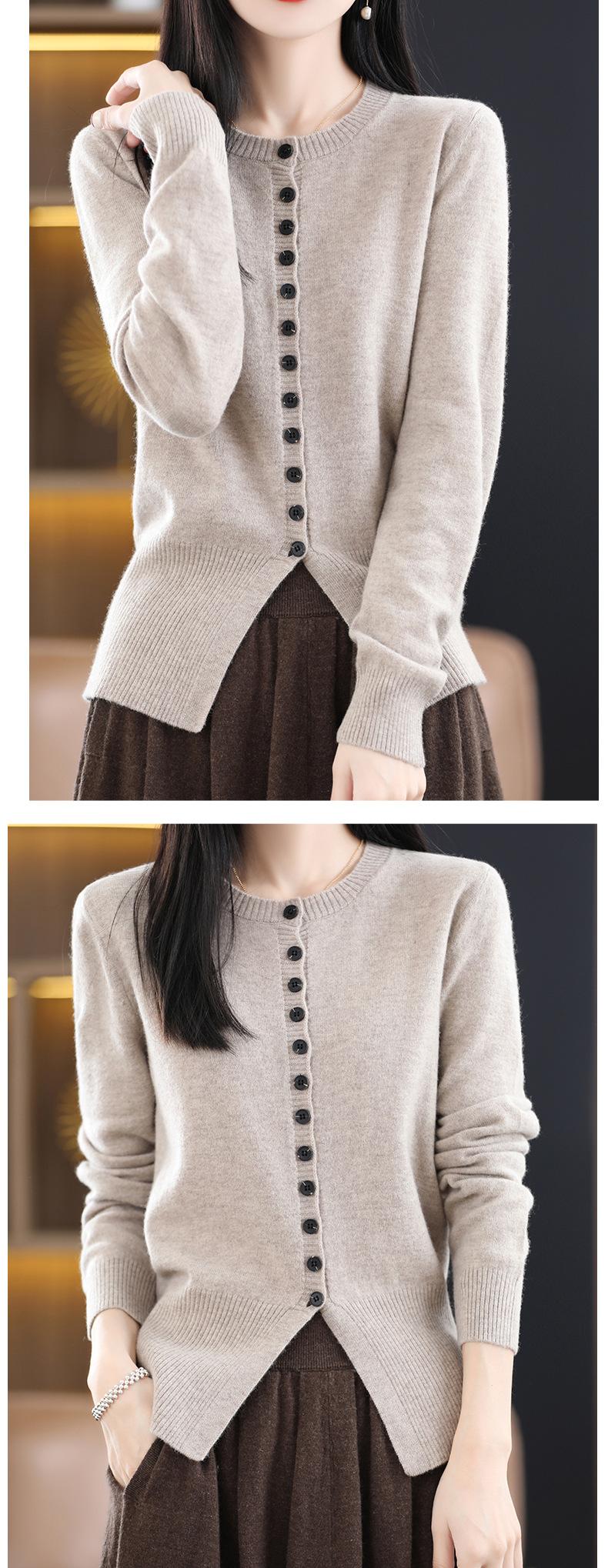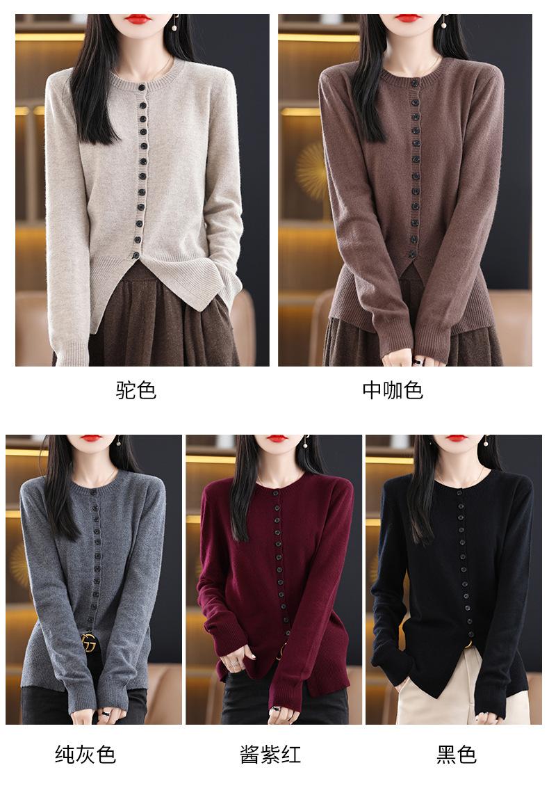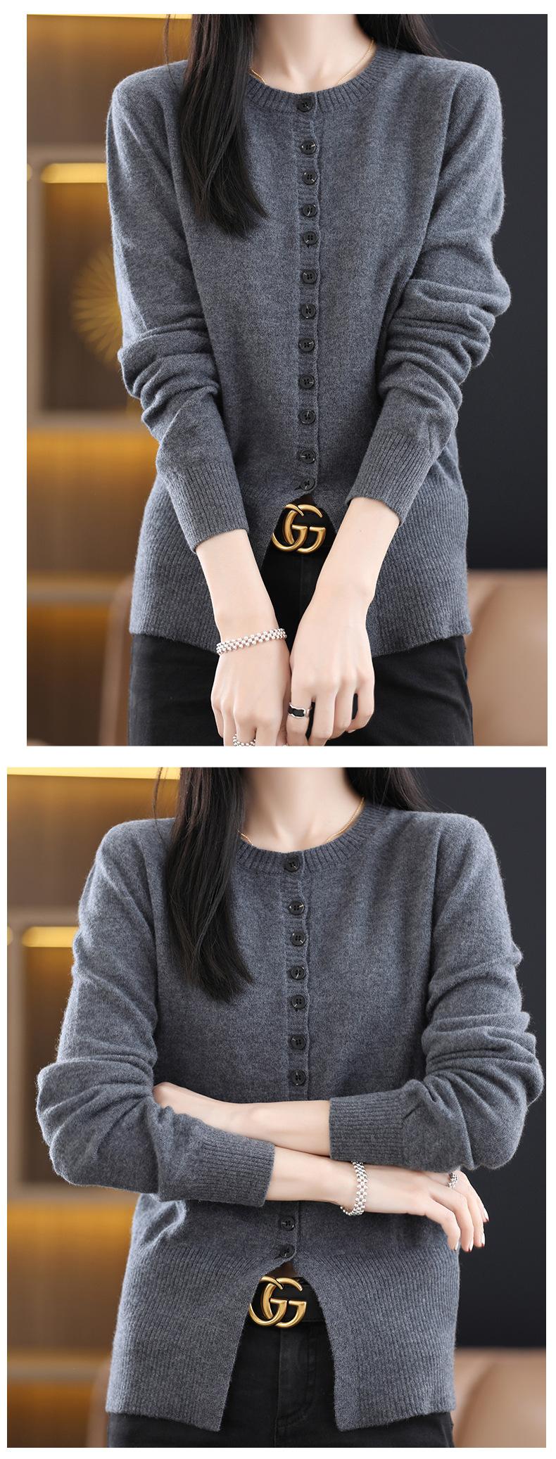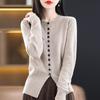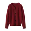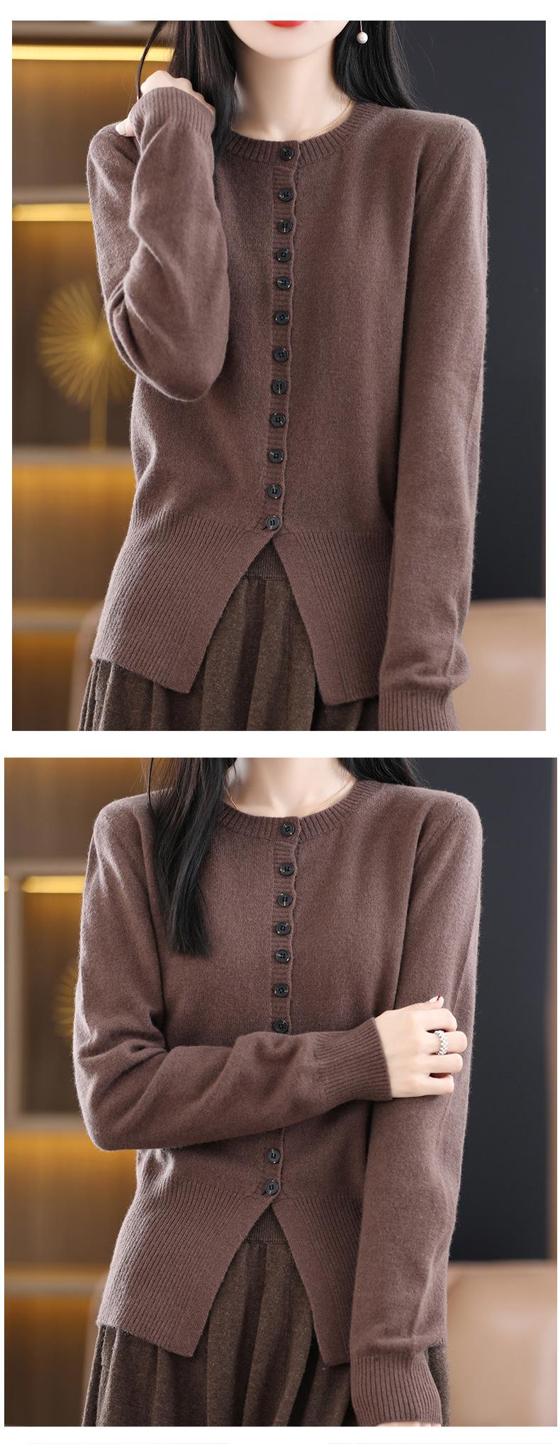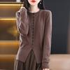 Nuevo cárdigan de punto de lana pura con cuello redondo para mujer, color liso, elegante, informal, sencillo, a la moda, con abertura y botonadura sencilla.