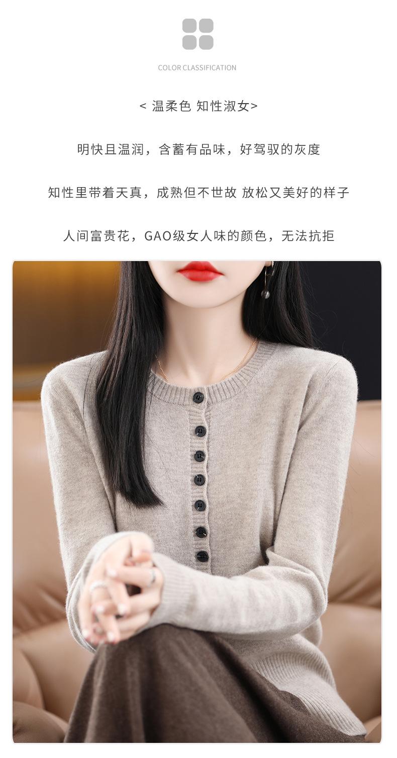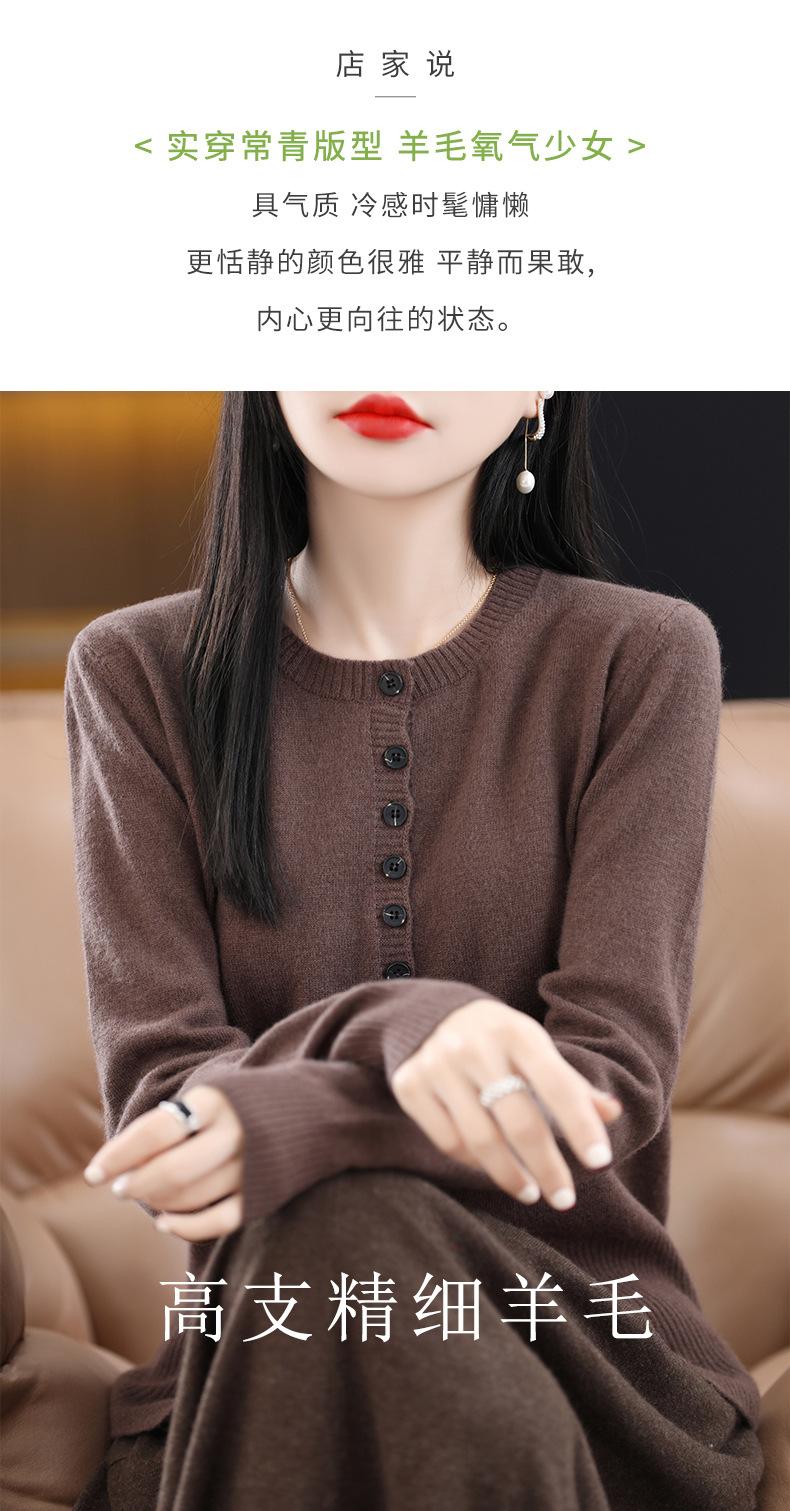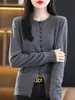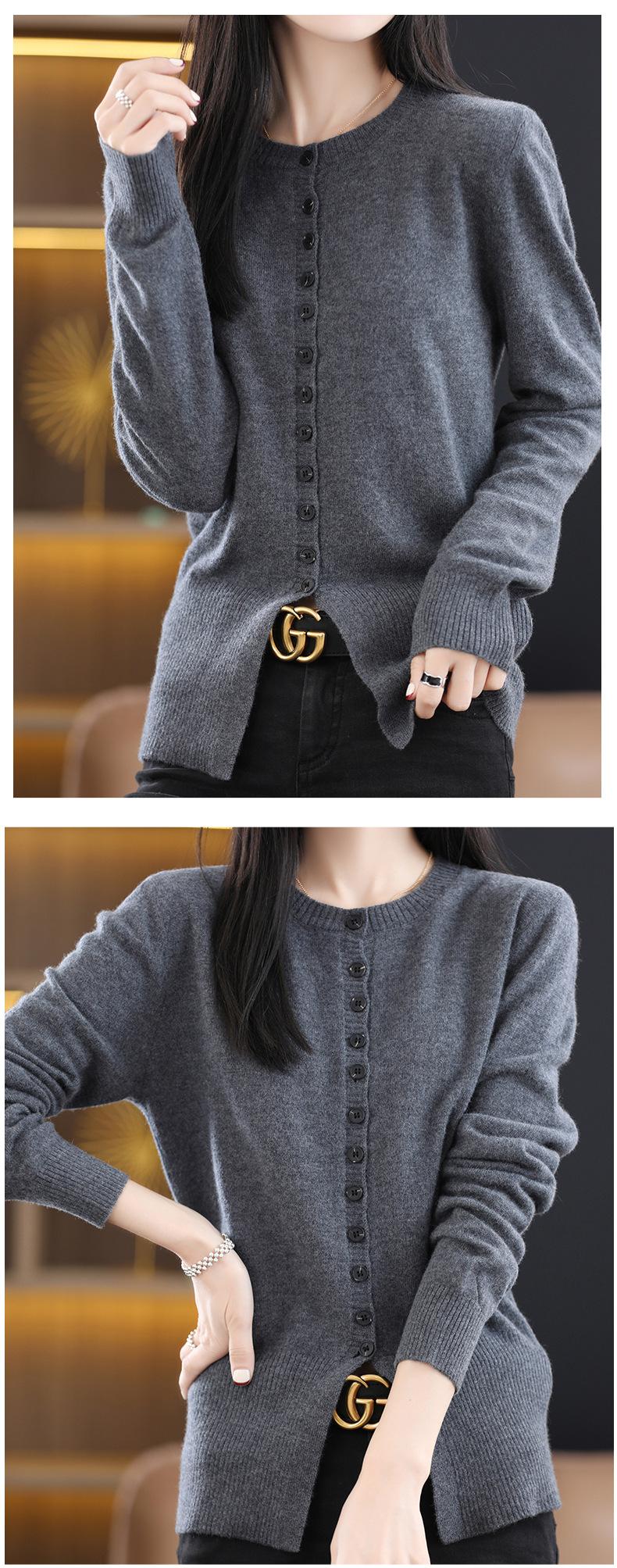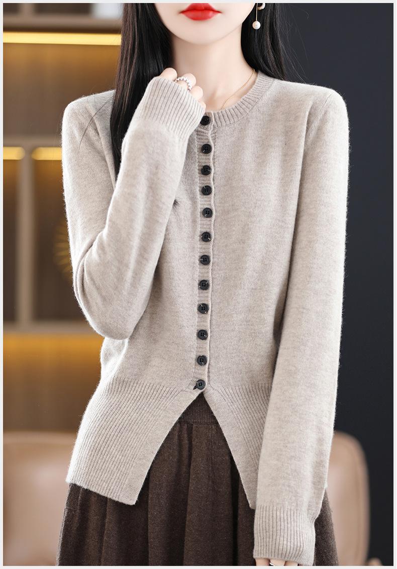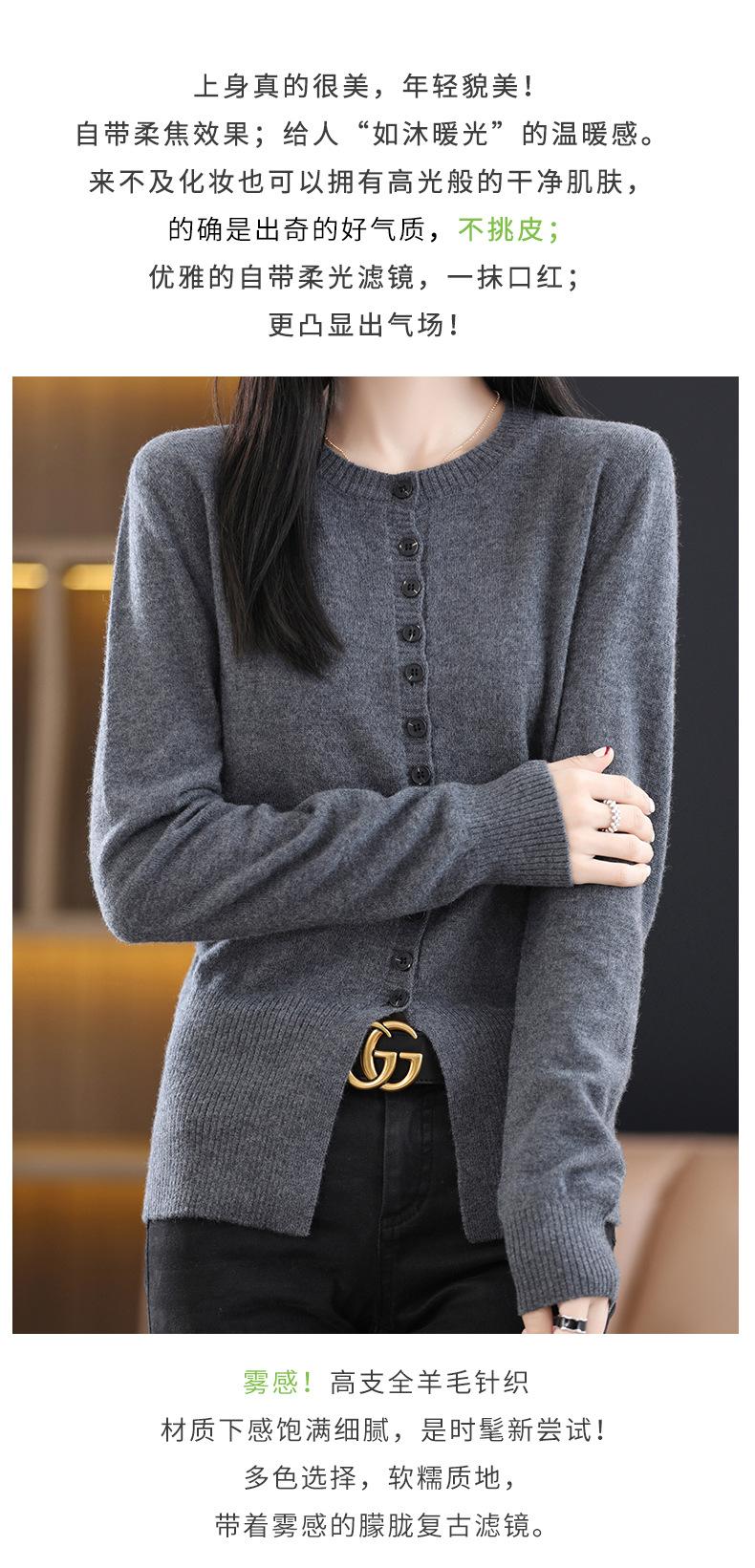 Nuevo cárdigan de punto de lana pura con cuello redondo para mujer, color liso, elegante, informal, sencillo, a la moda, con abertura y botonadura sencilla.