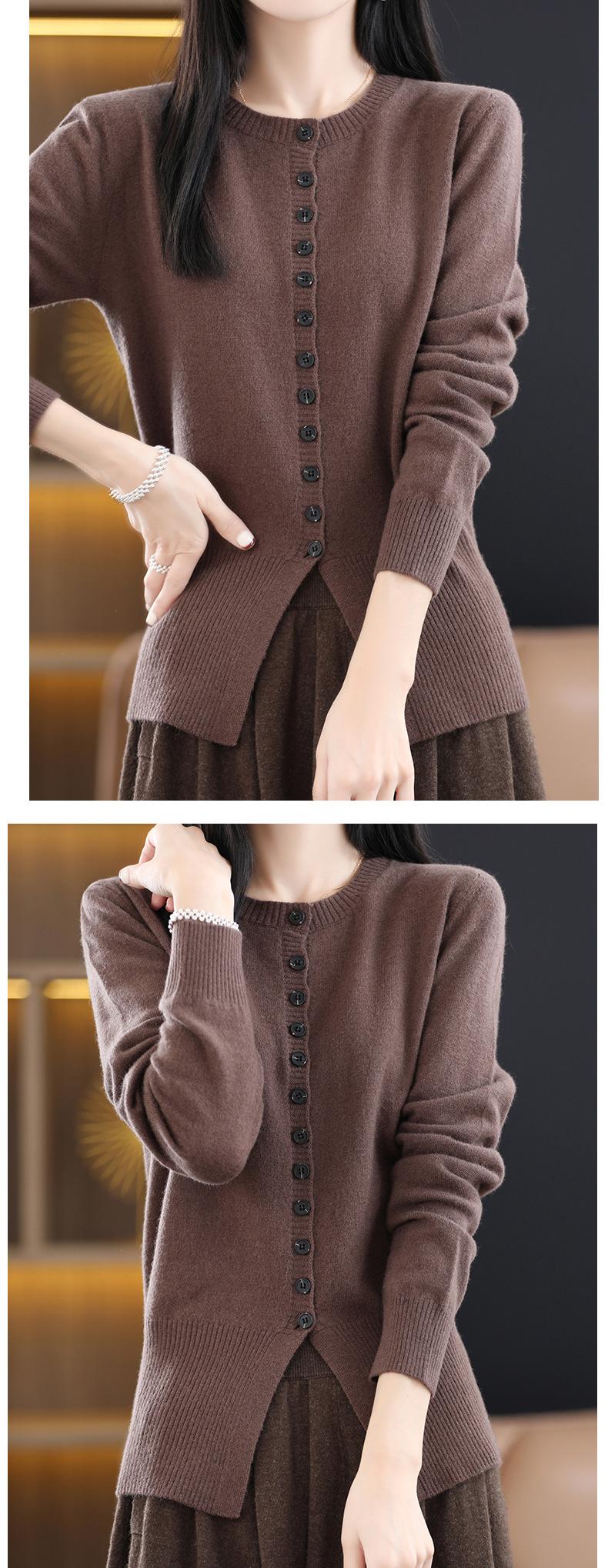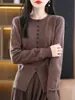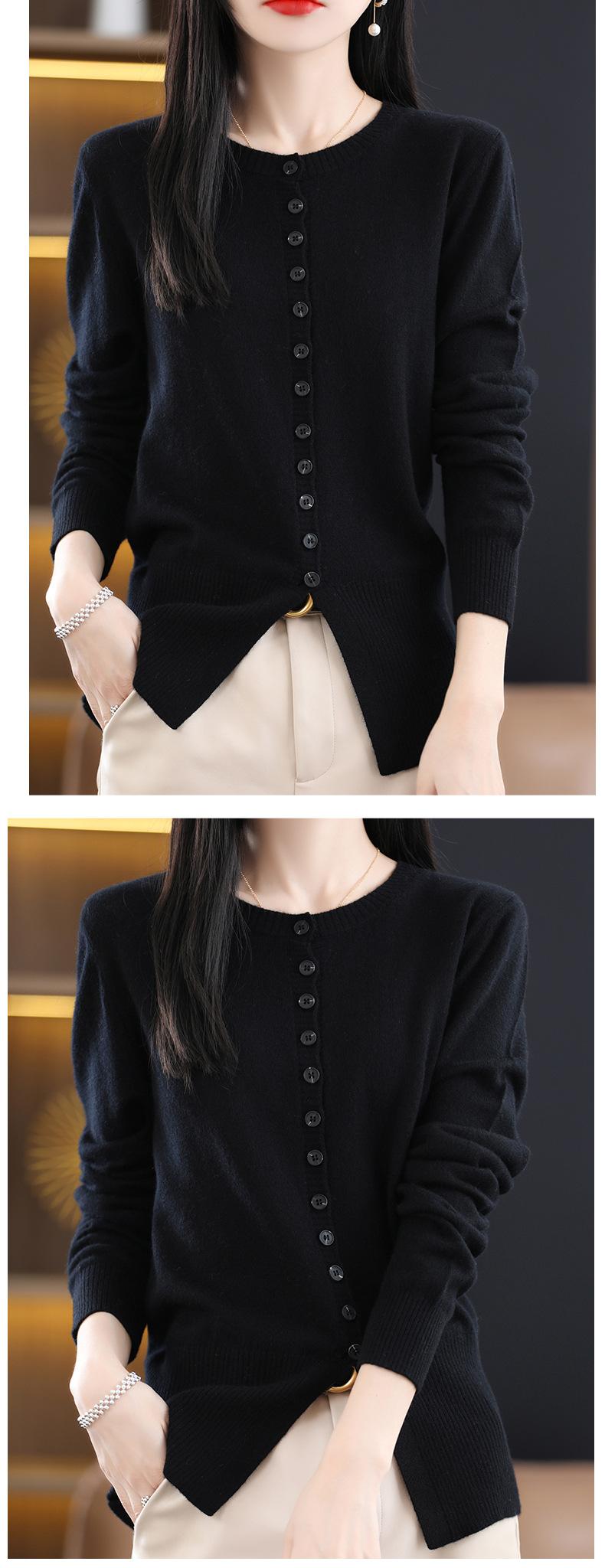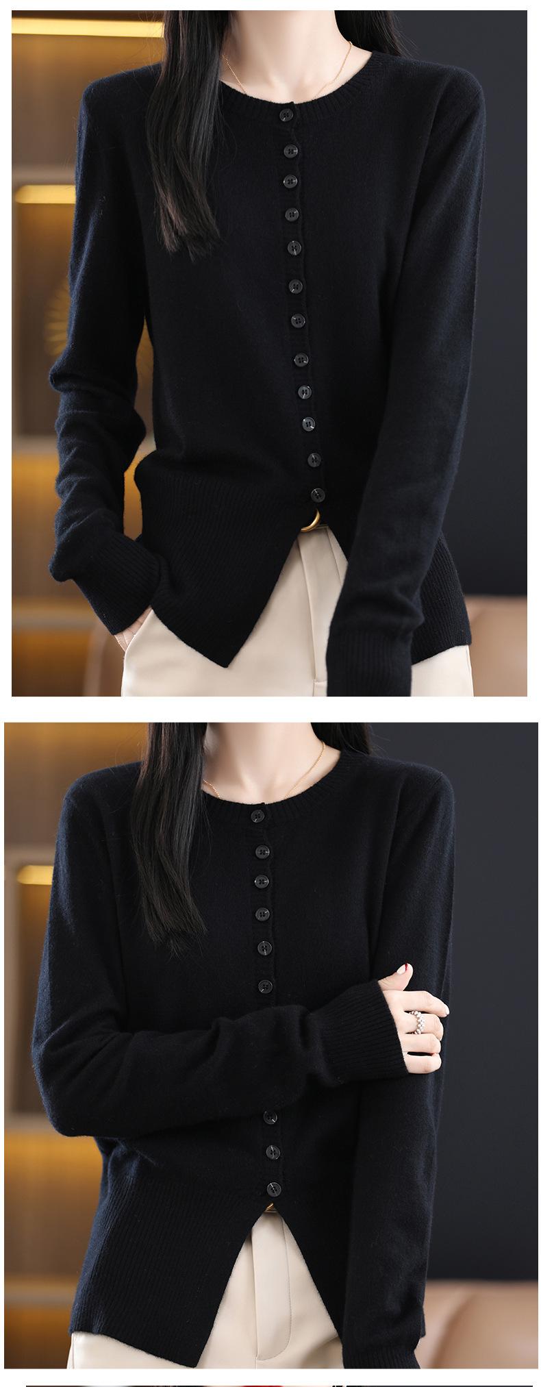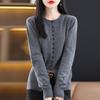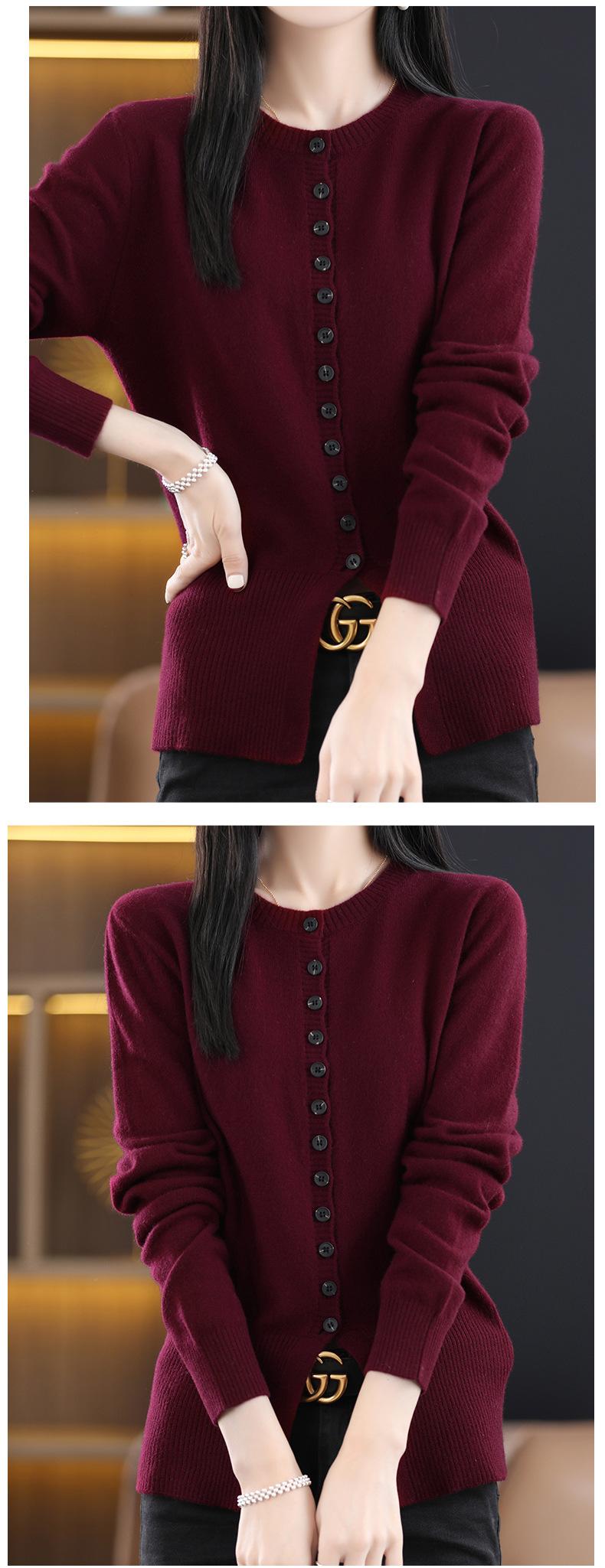 Nuevo cárdigan de punto de lana pura con cuello redondo para mujer, color liso, elegante, informal, sencillo, a la moda, con abertura y botonadura sencilla.