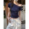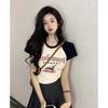 Camiseta de manga corta con hombros descubiertos, estilo retro americano, para mujer, de verano, con corte ajustado, estilo dulce y sexy.