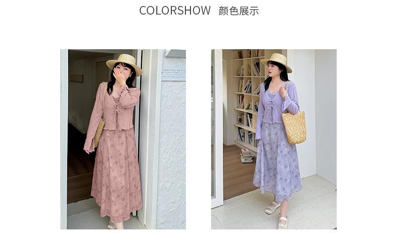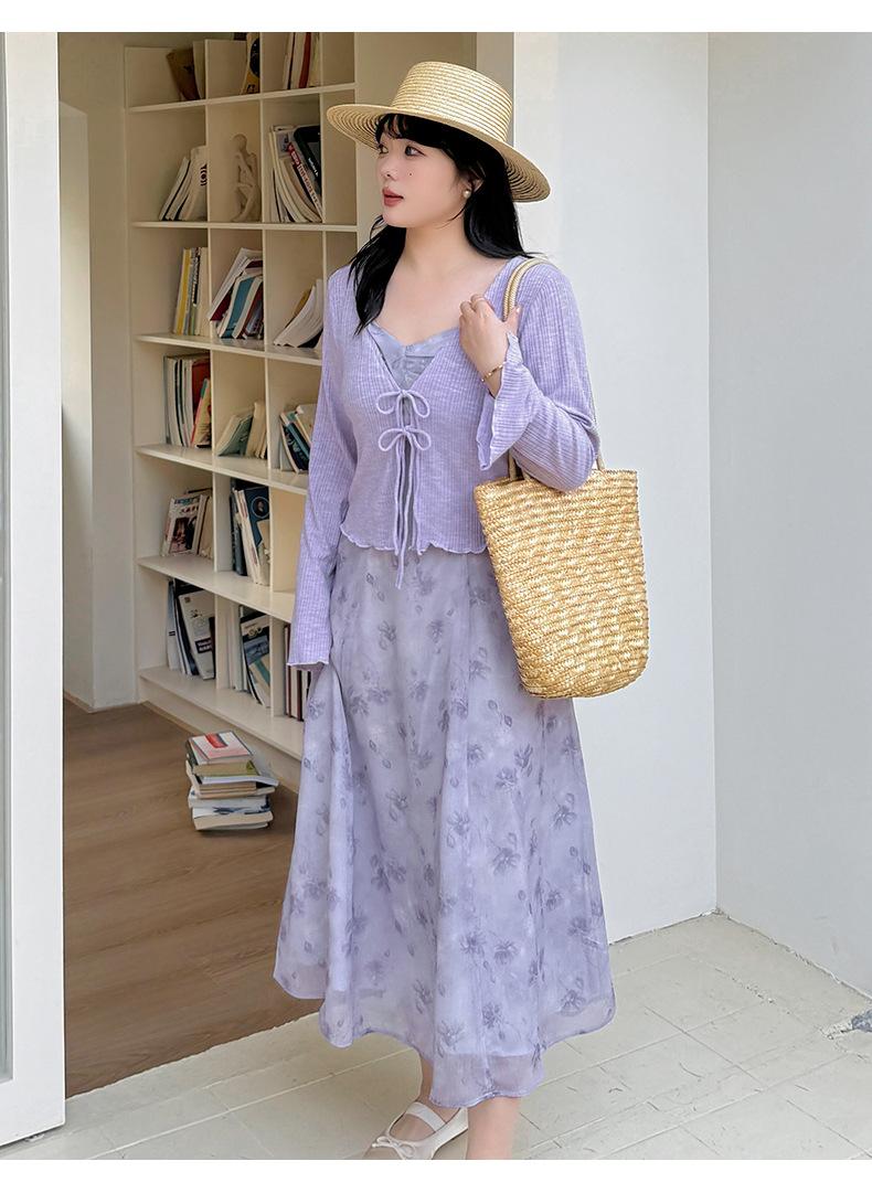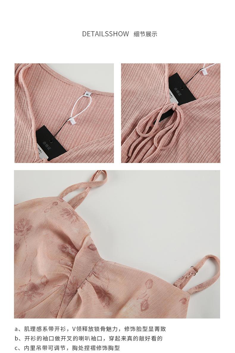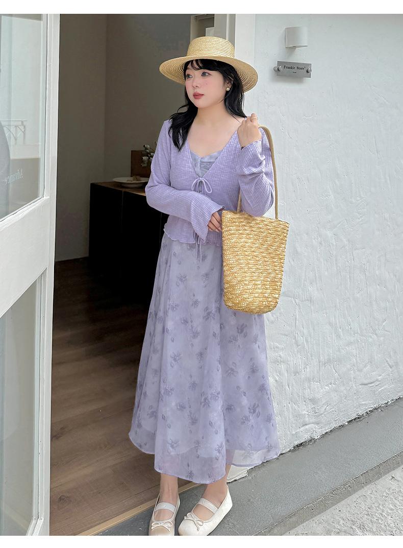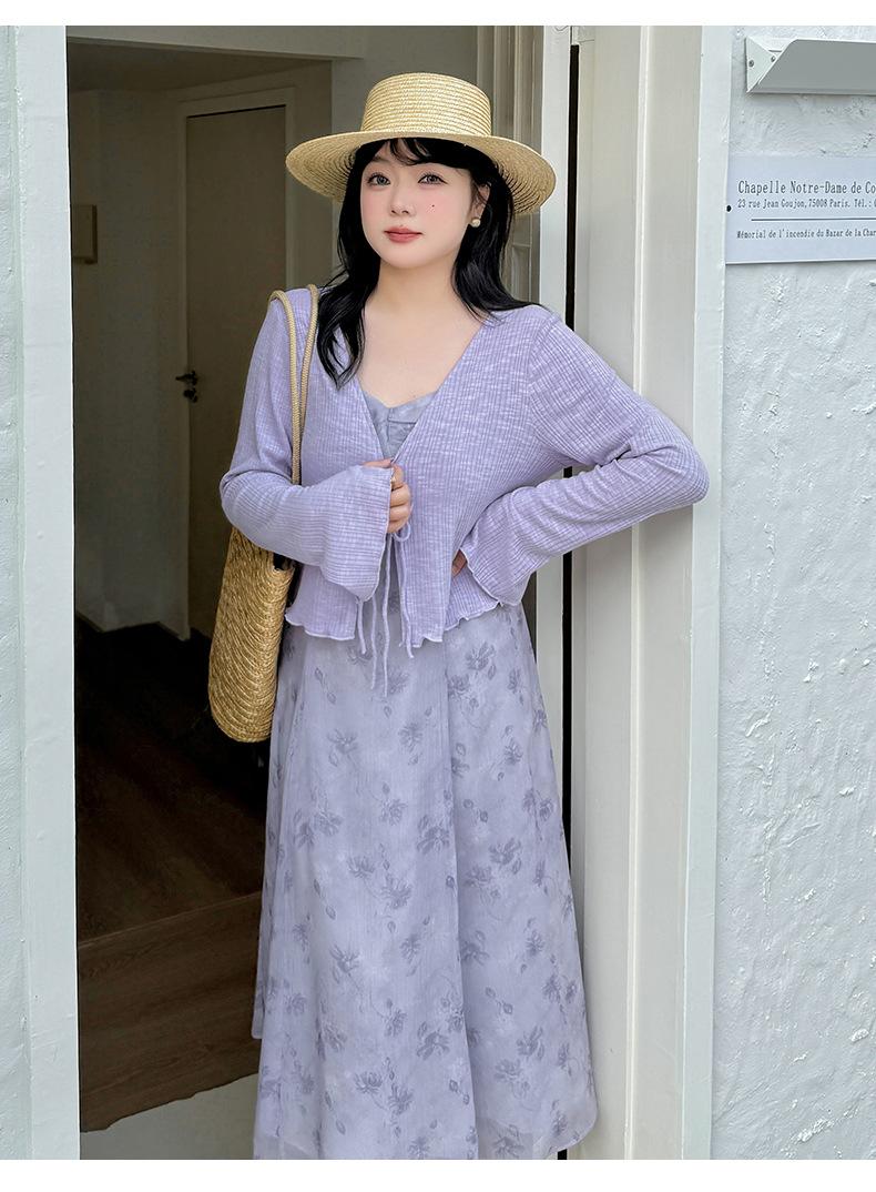 Cárdigan de Manga Acampanada Suave de Talla Grande + Traje de Falda con Tirantes para Mujer 2025 Primavera Nuevo Look Adelgazante Conjunto de Dos Piezas 122035