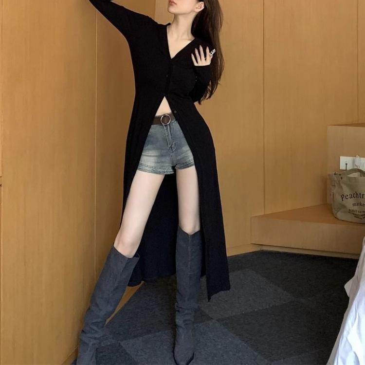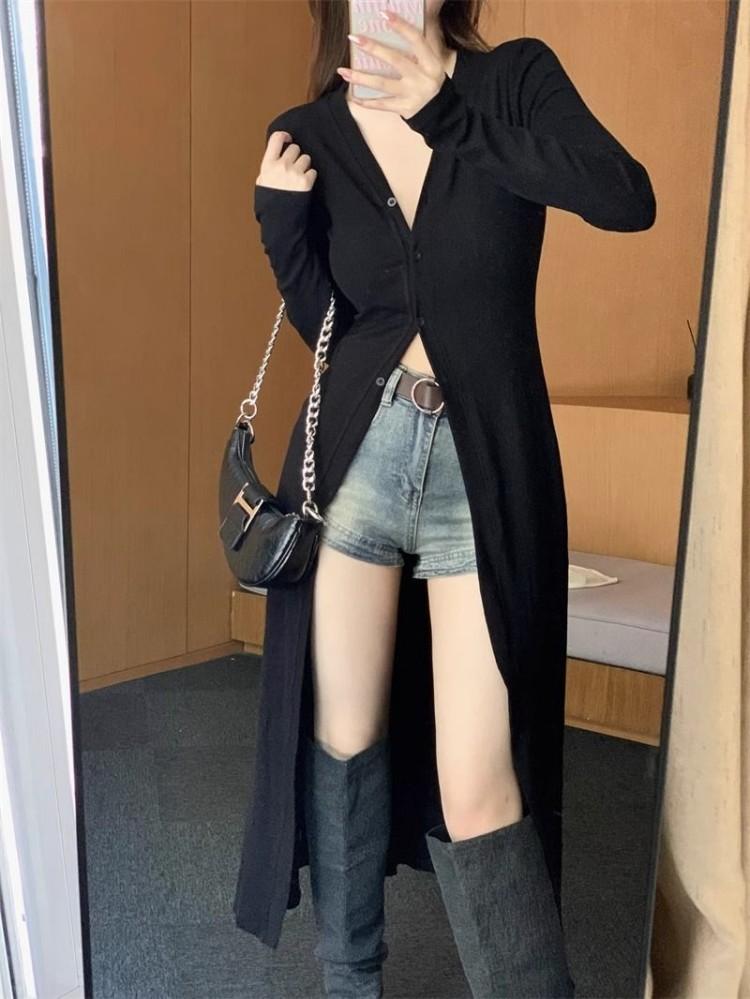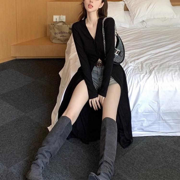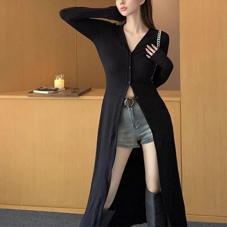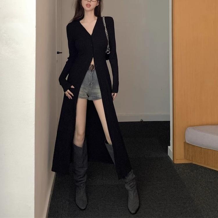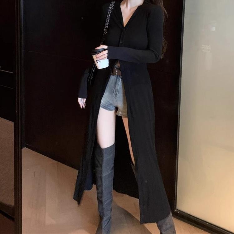Abrigo tipo cárdigan de manga larga con cuello en V negro elegante y fino con diseño combinable para principios de primavera para mujer