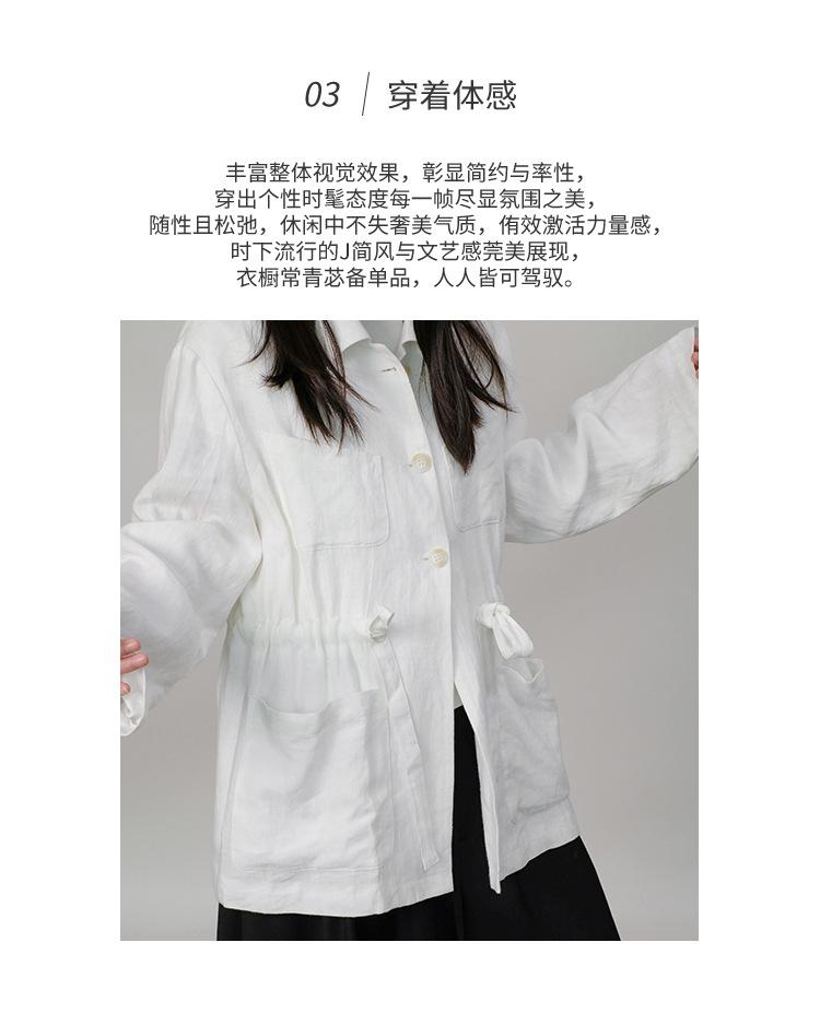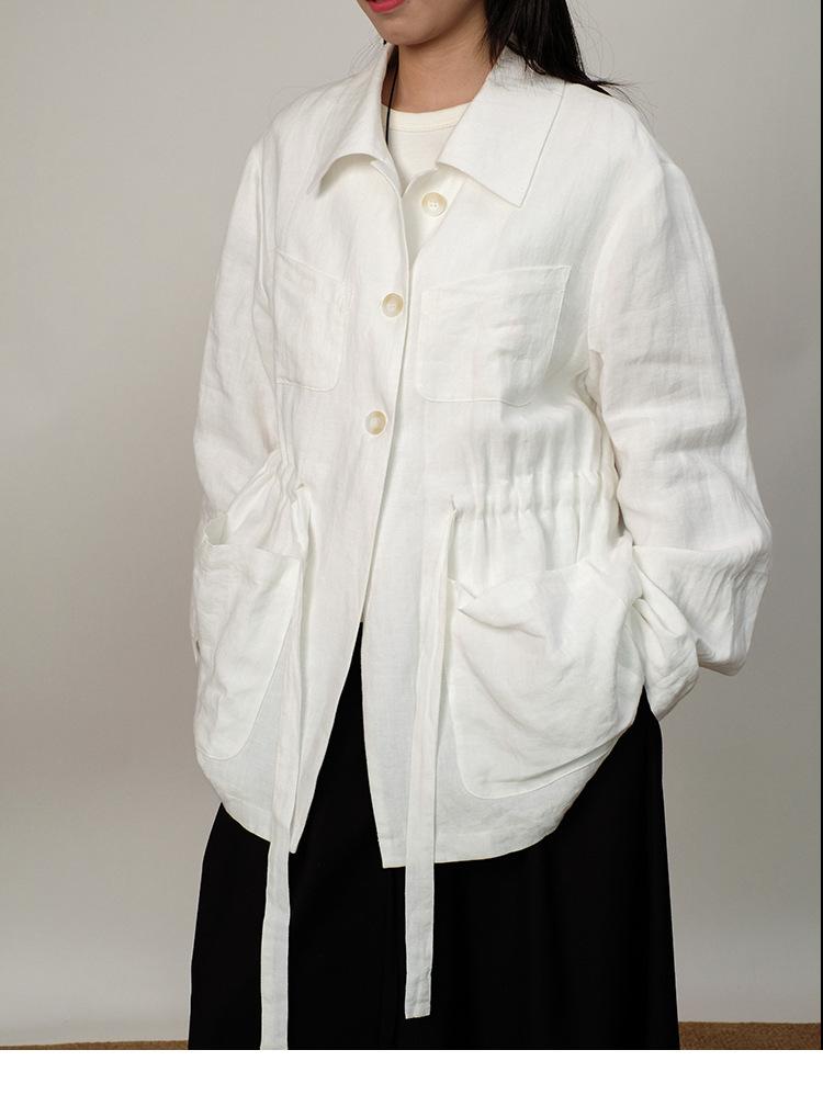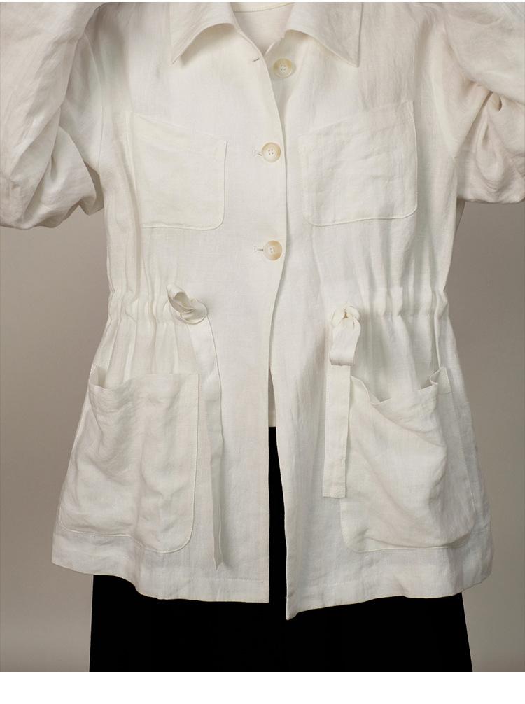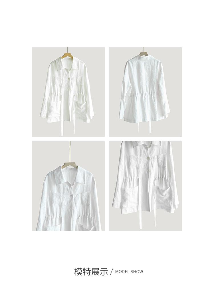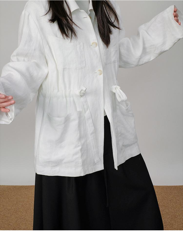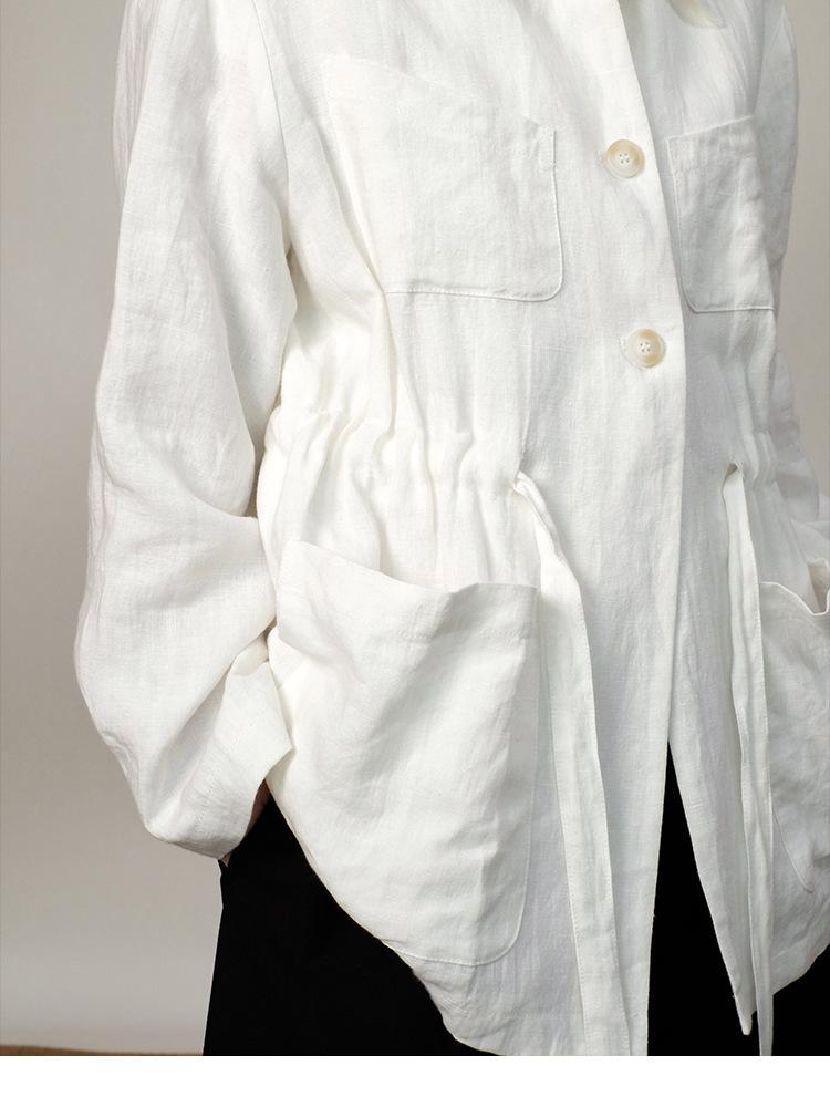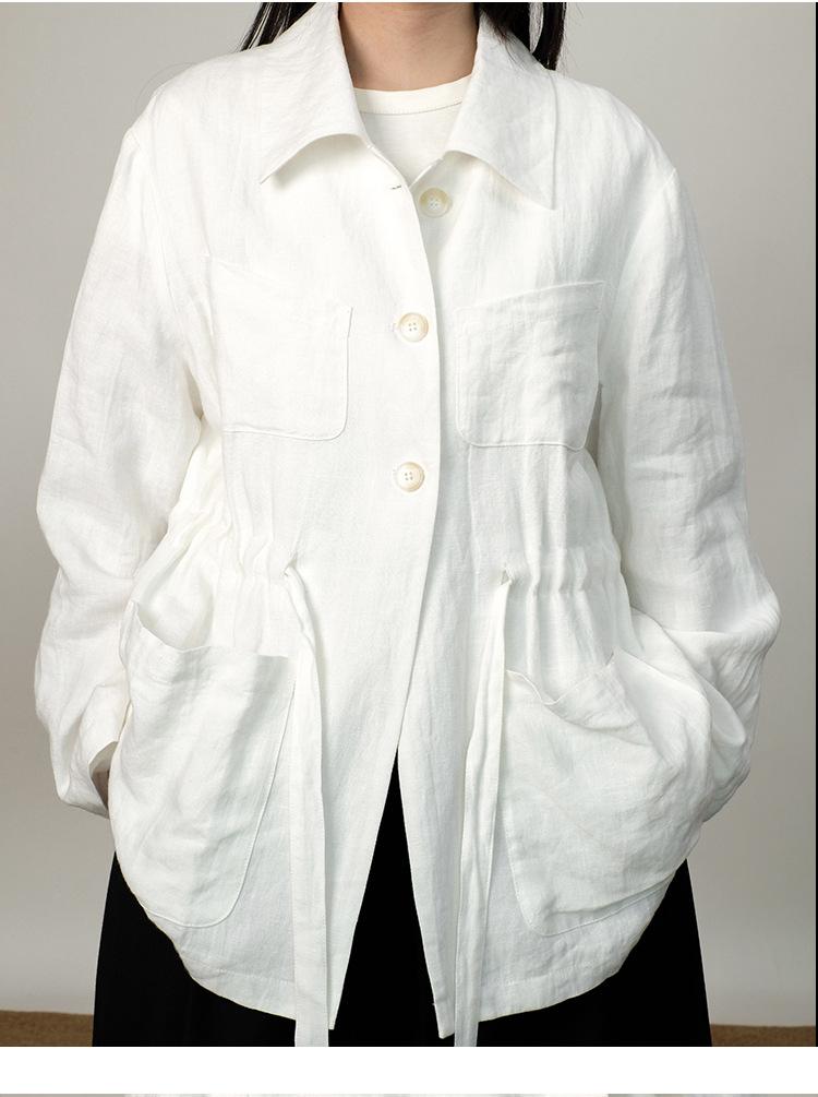 25 Nuevo Estilo Coreano Casual de Primavera y Verano Chaqueta de Mujer de Largo Medio Estilo Ropa de Trabajo de Lino Blanco con Cintura Ajustable con Cordón y Mangas Largas