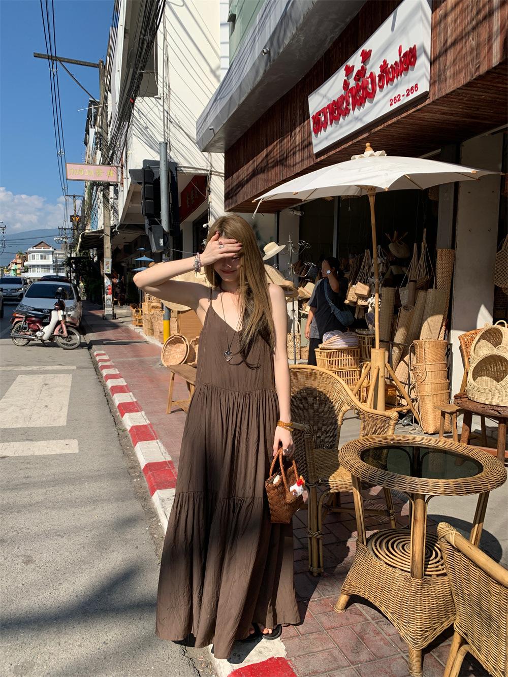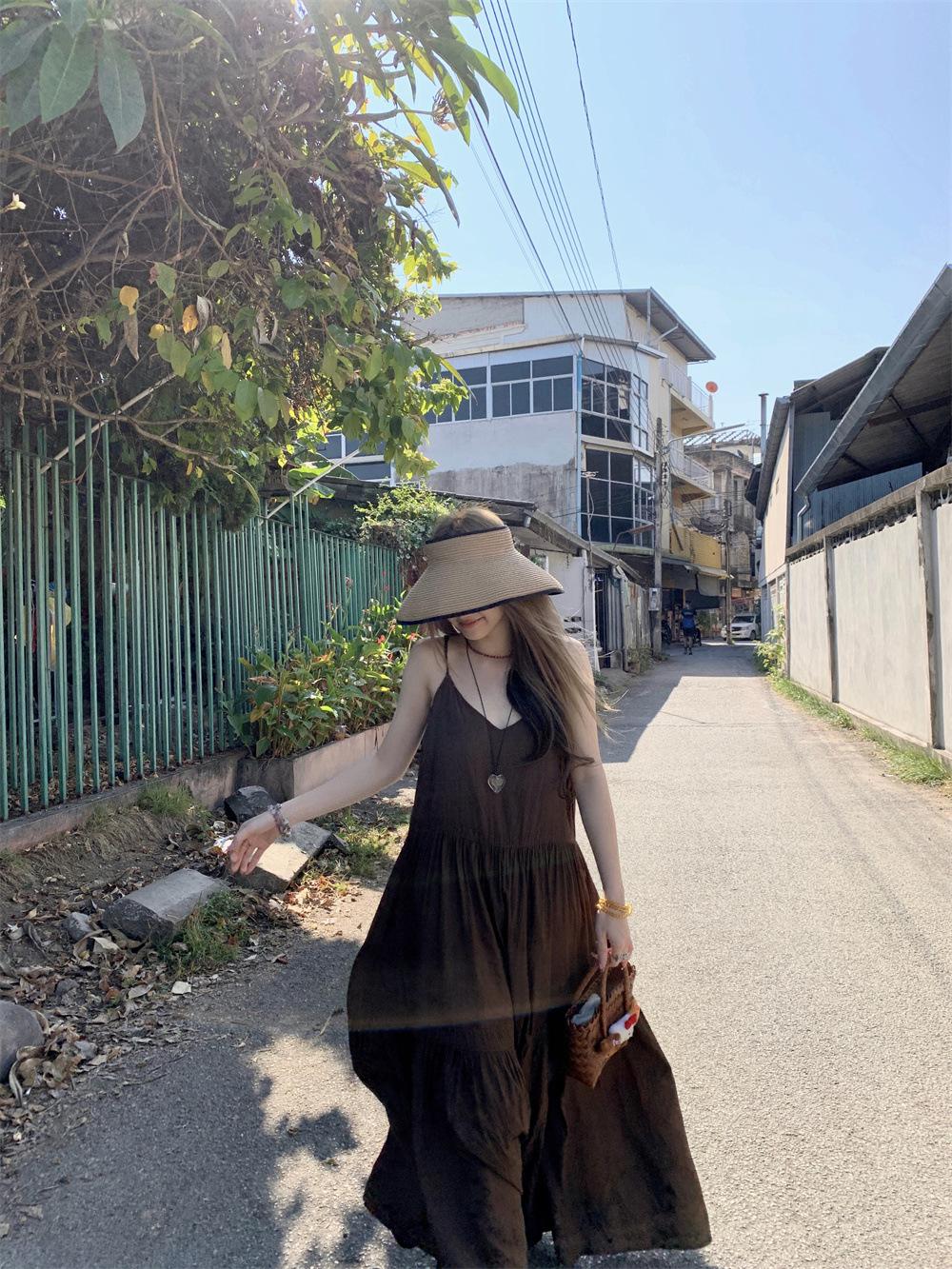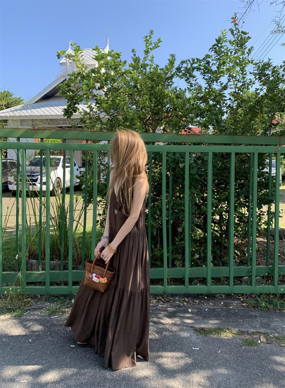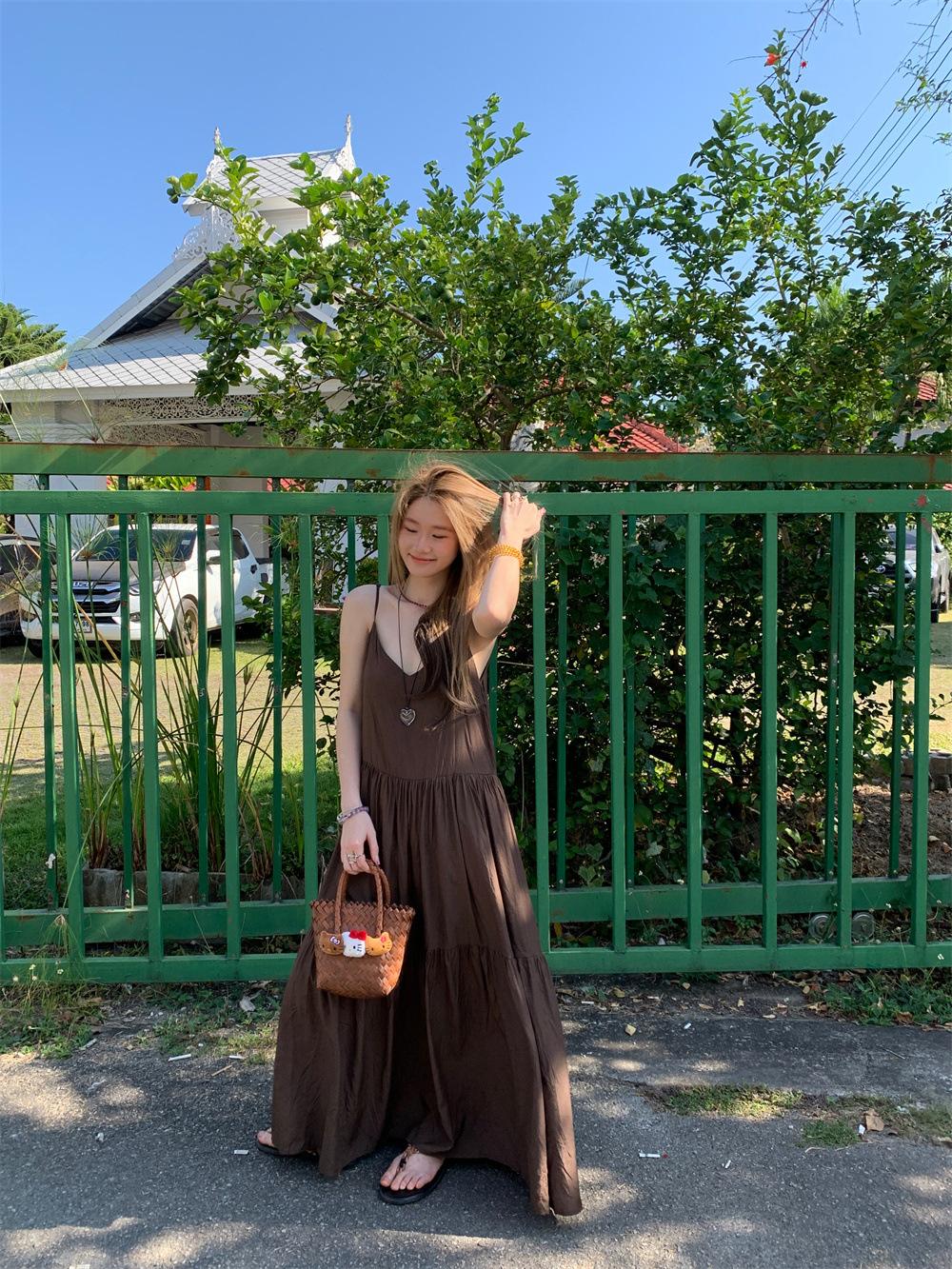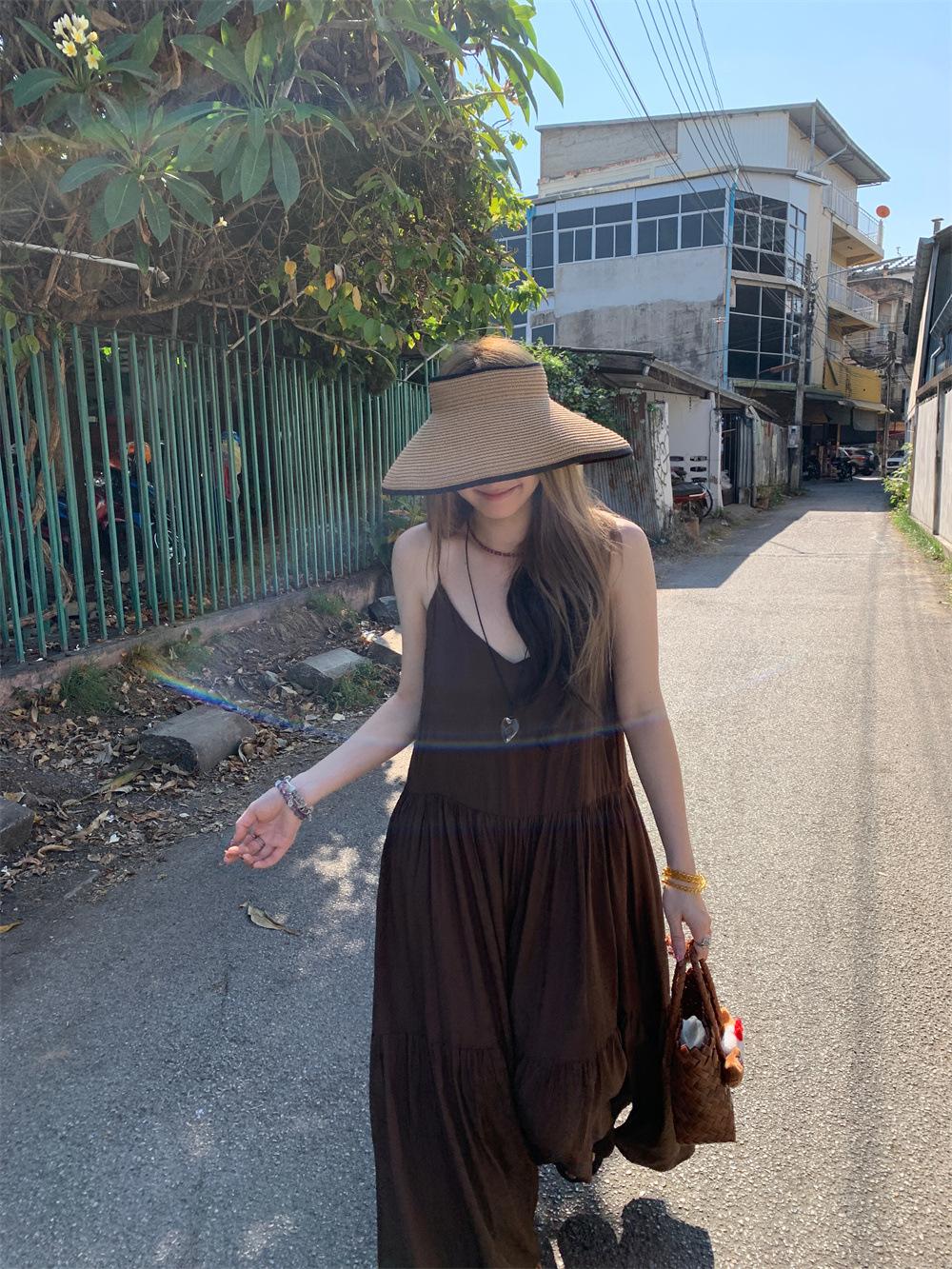 Vestido de verano de talla grande estilo coreano, sin mangas, con tirantes y diseño de nicho, de color liso, adelgazante, para vacaciones y playa.
