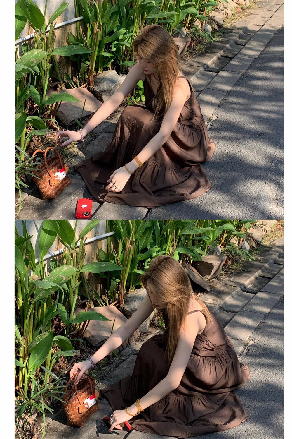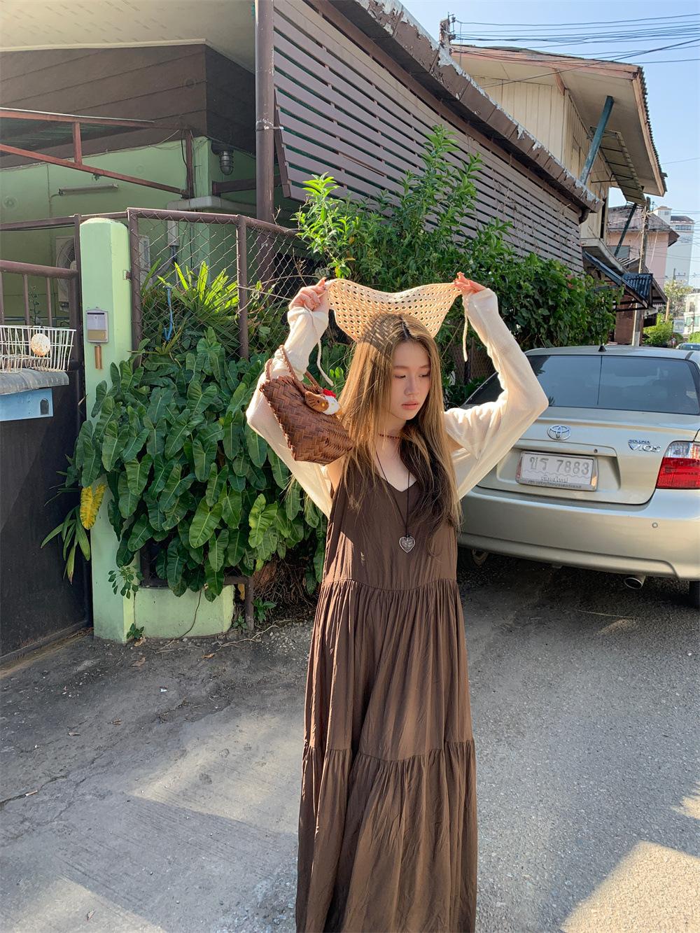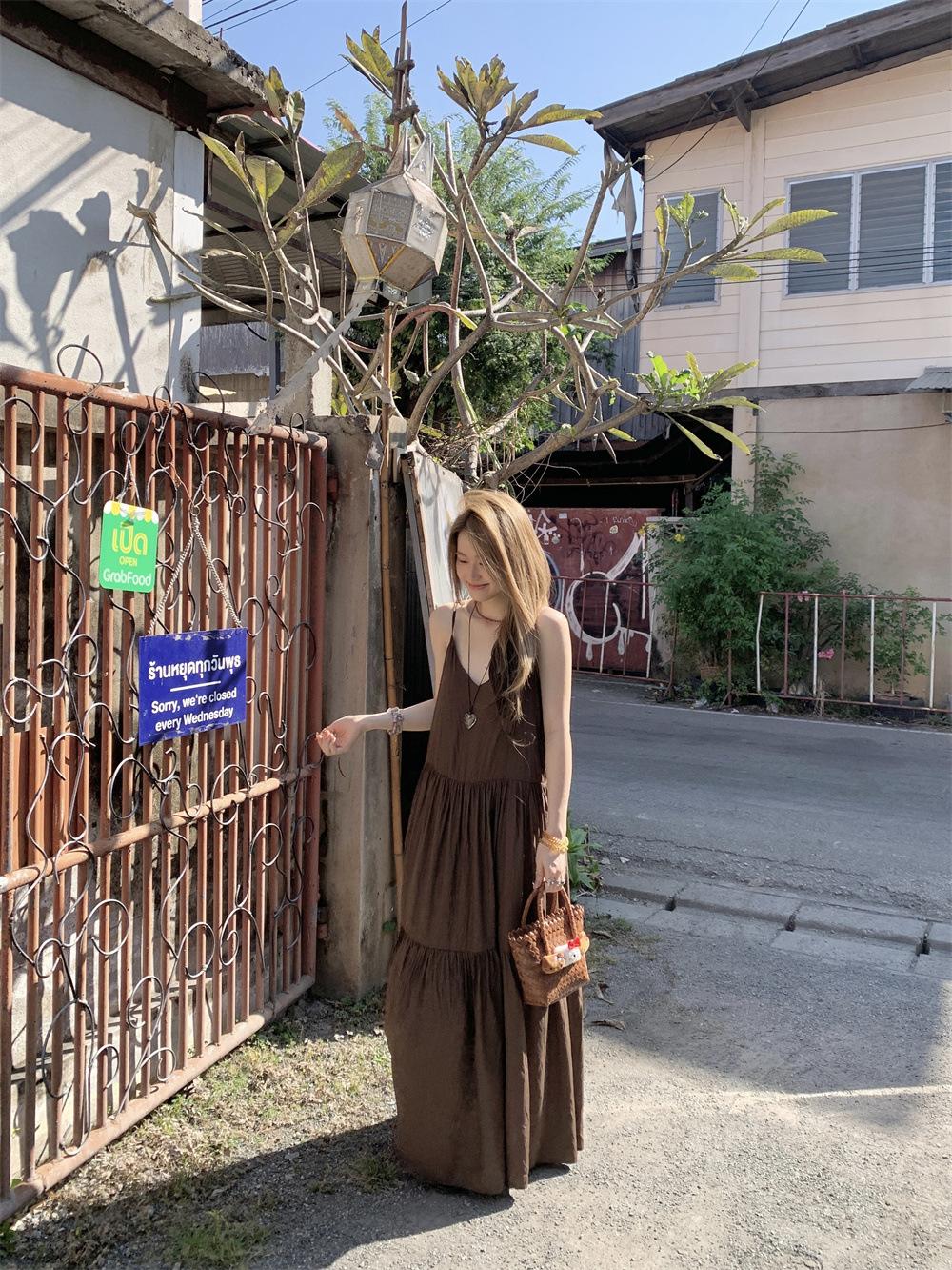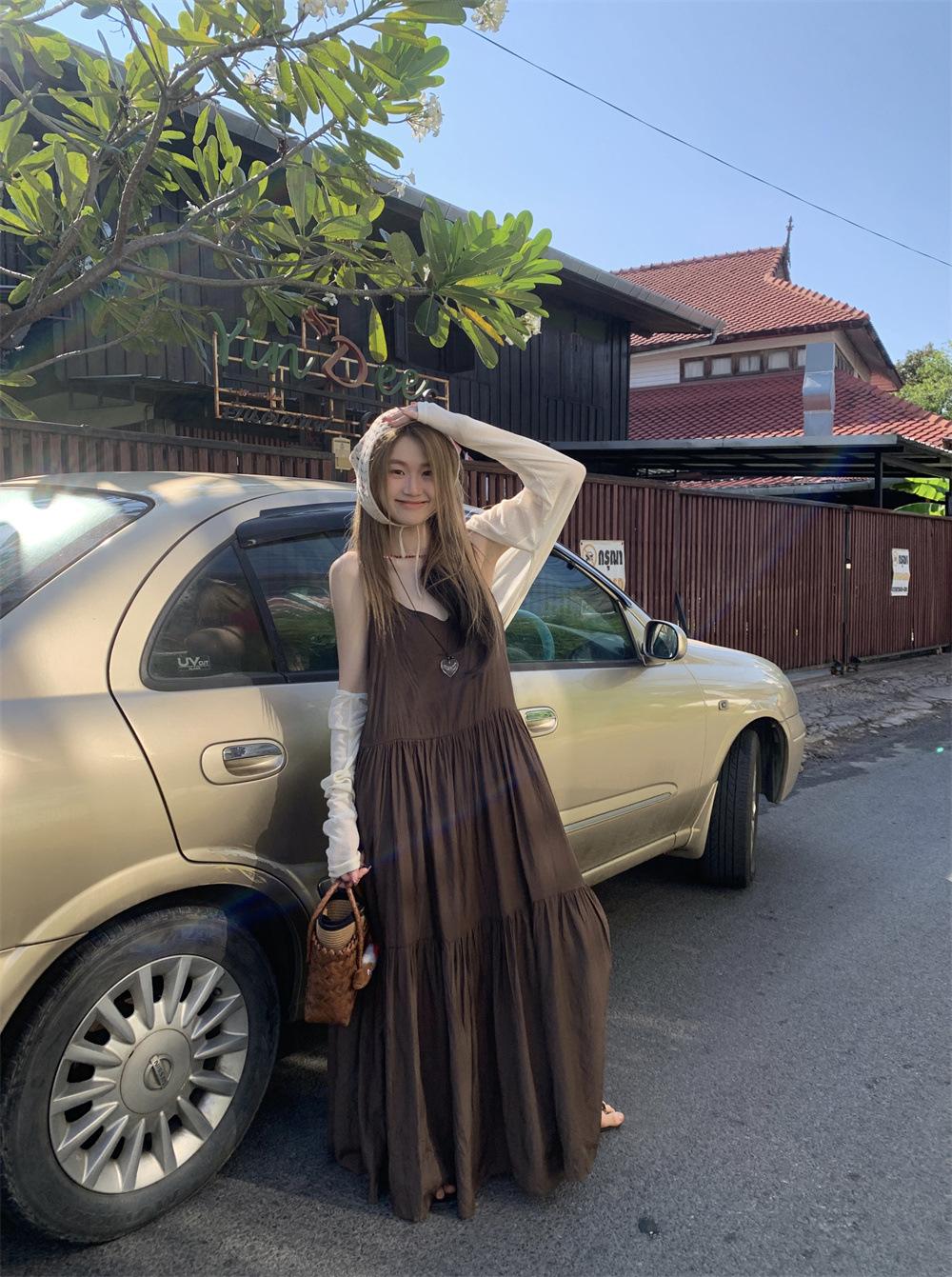 Vestido de verano de talla grande estilo coreano, sin mangas, con tirantes y diseño de nicho, de color liso, adelgazante, para vacaciones y playa.