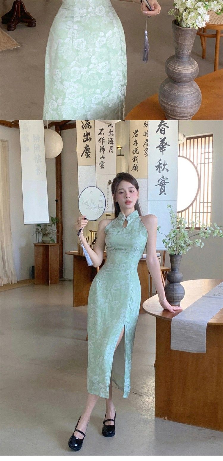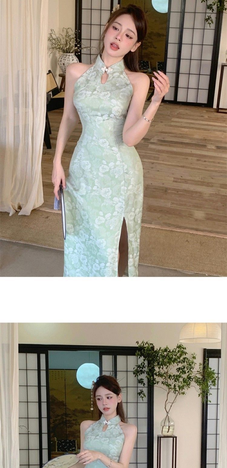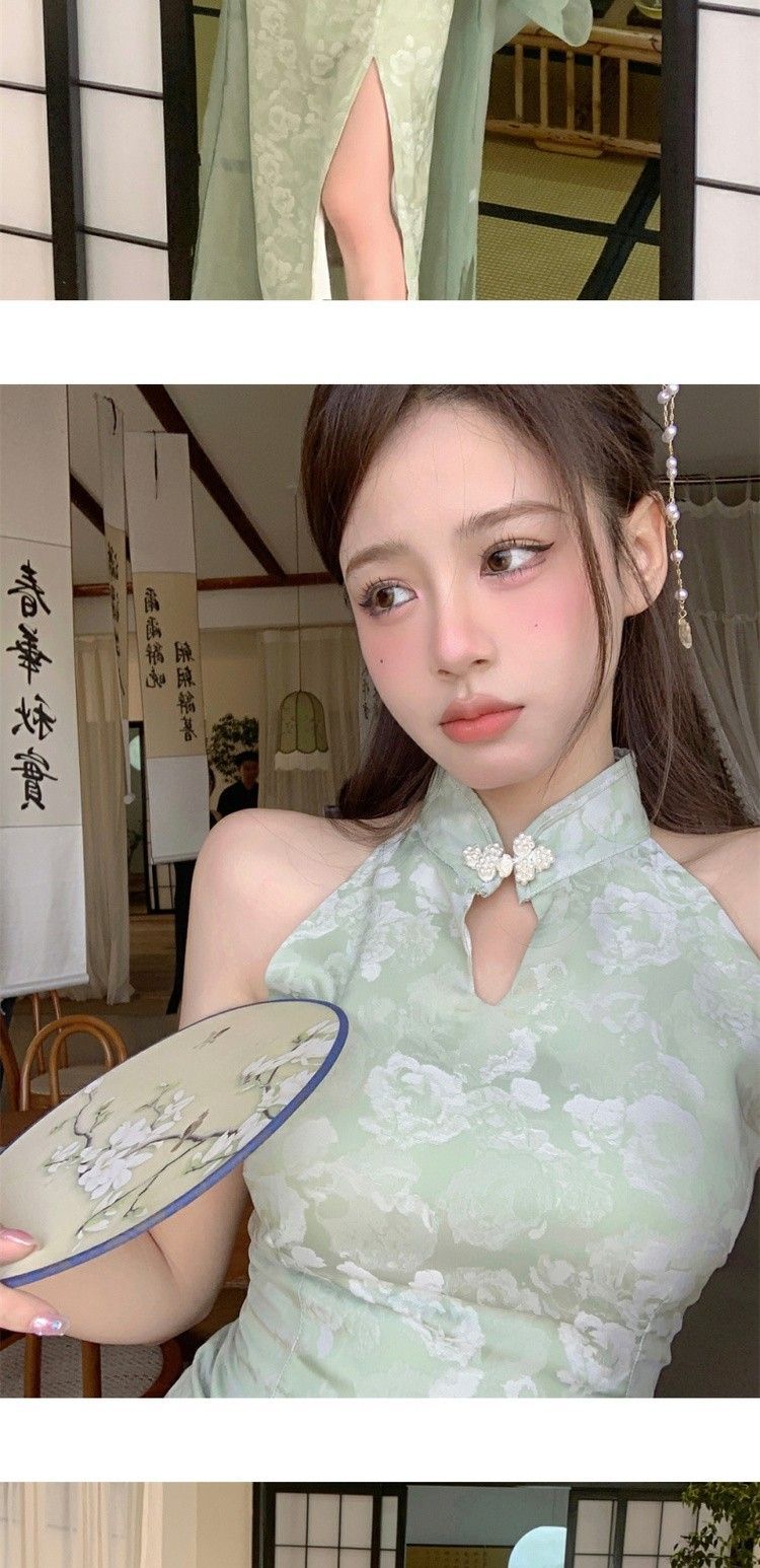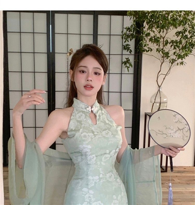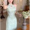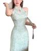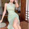 Nuevo Estilo Chino Verde Fresco Cheongsam Modificado Sexy Verano Nuevo Vestido Colgante de Cuello para Mujer Comercio Exterior para Mujer
