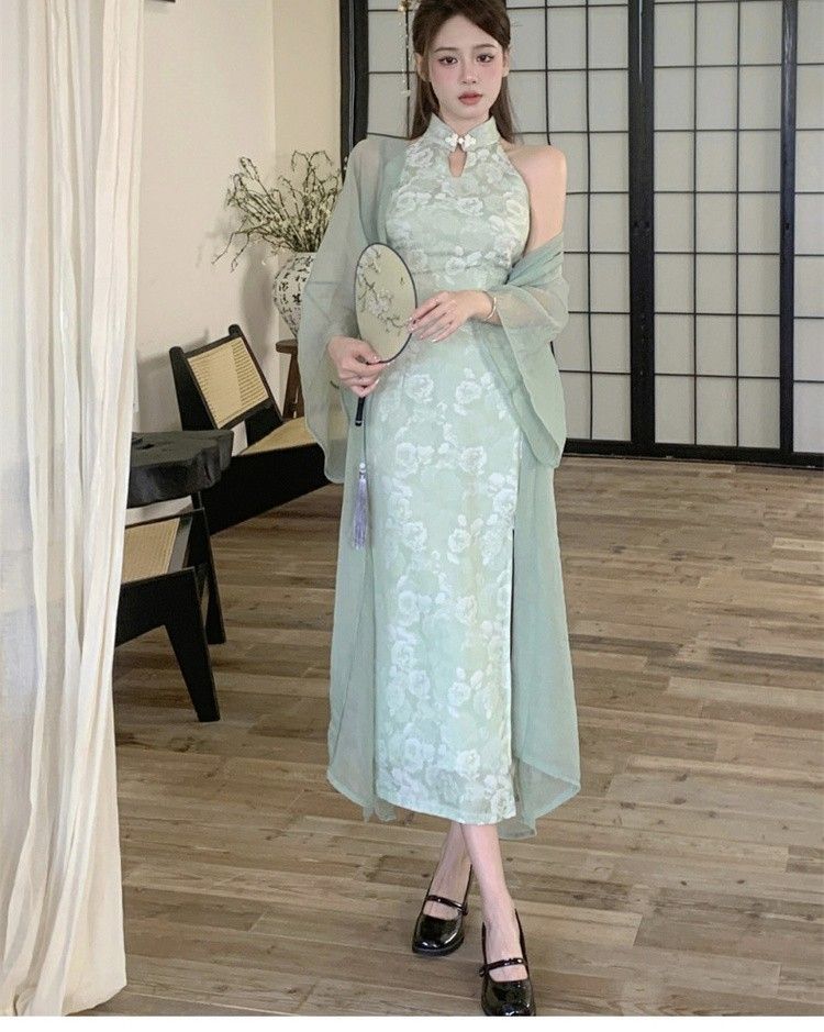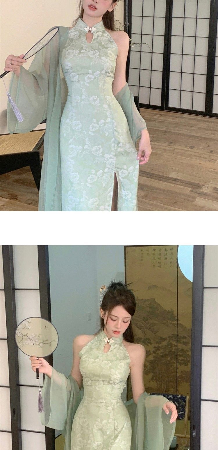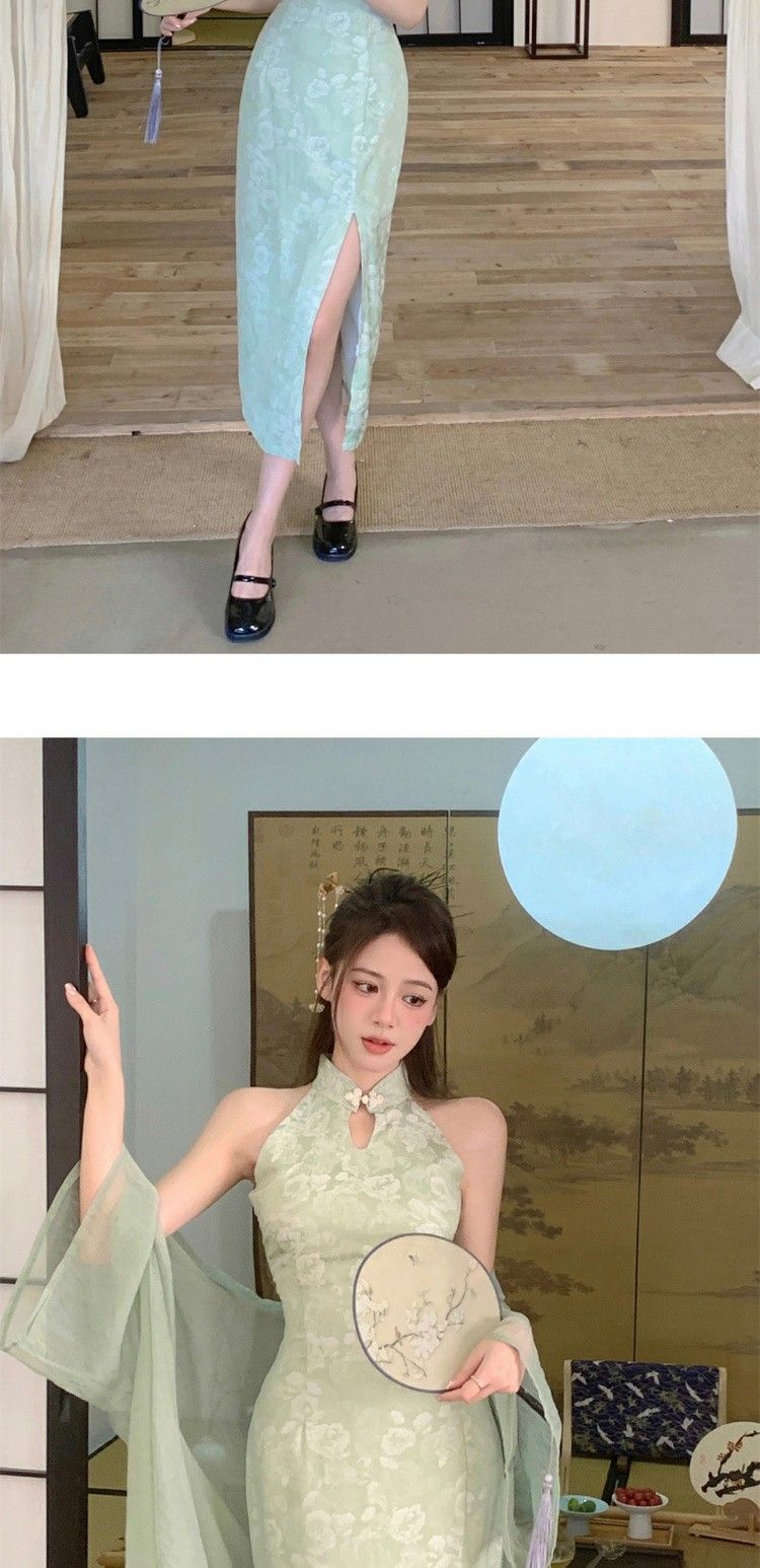 Nuevo Estilo Chino Verde Fresco Cheongsam Modificado Sexy Verano Nuevo Vestido Colgante de Cuello para Mujer Comercio Exterior para Mujer