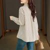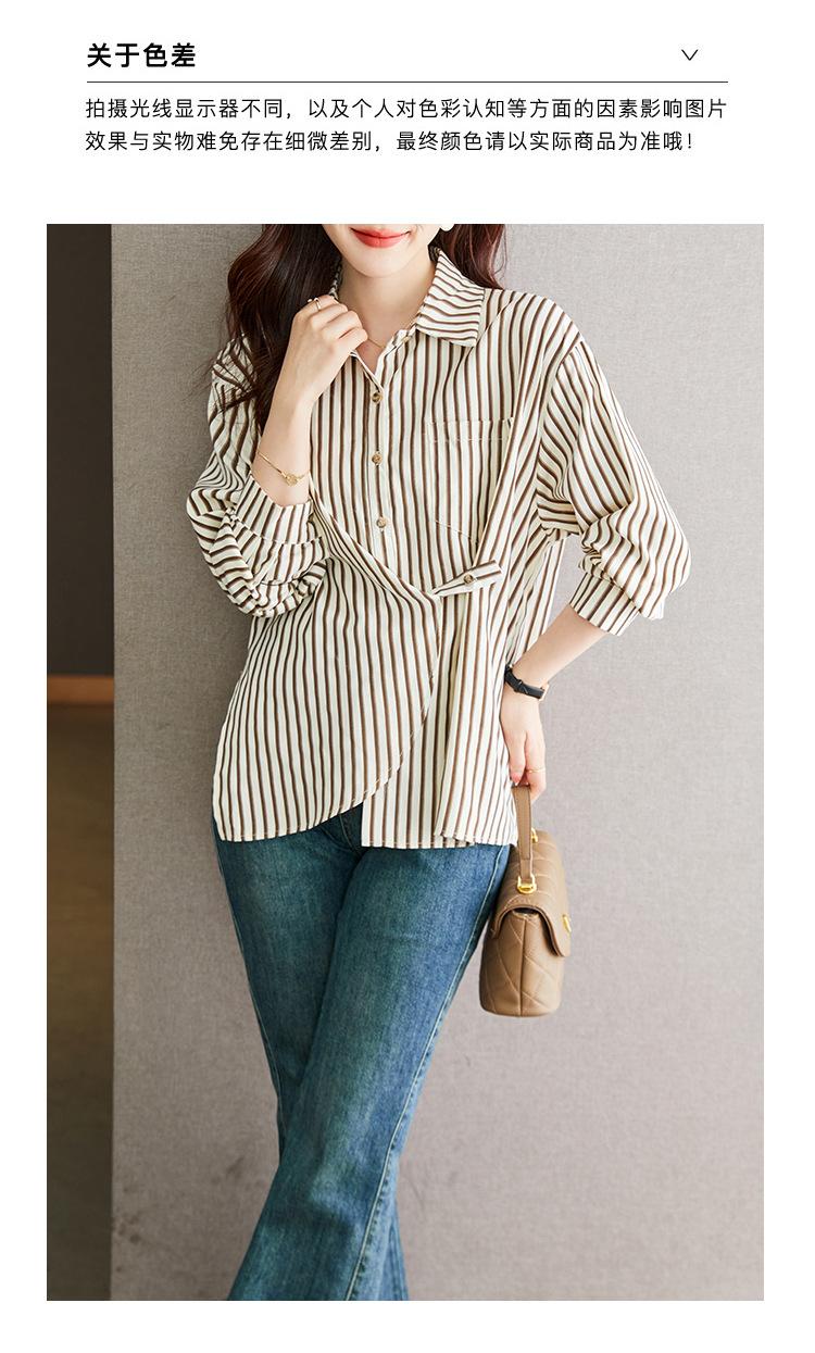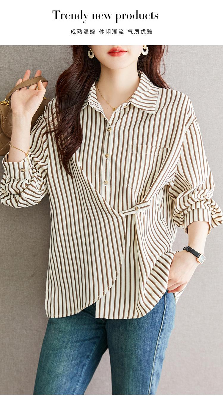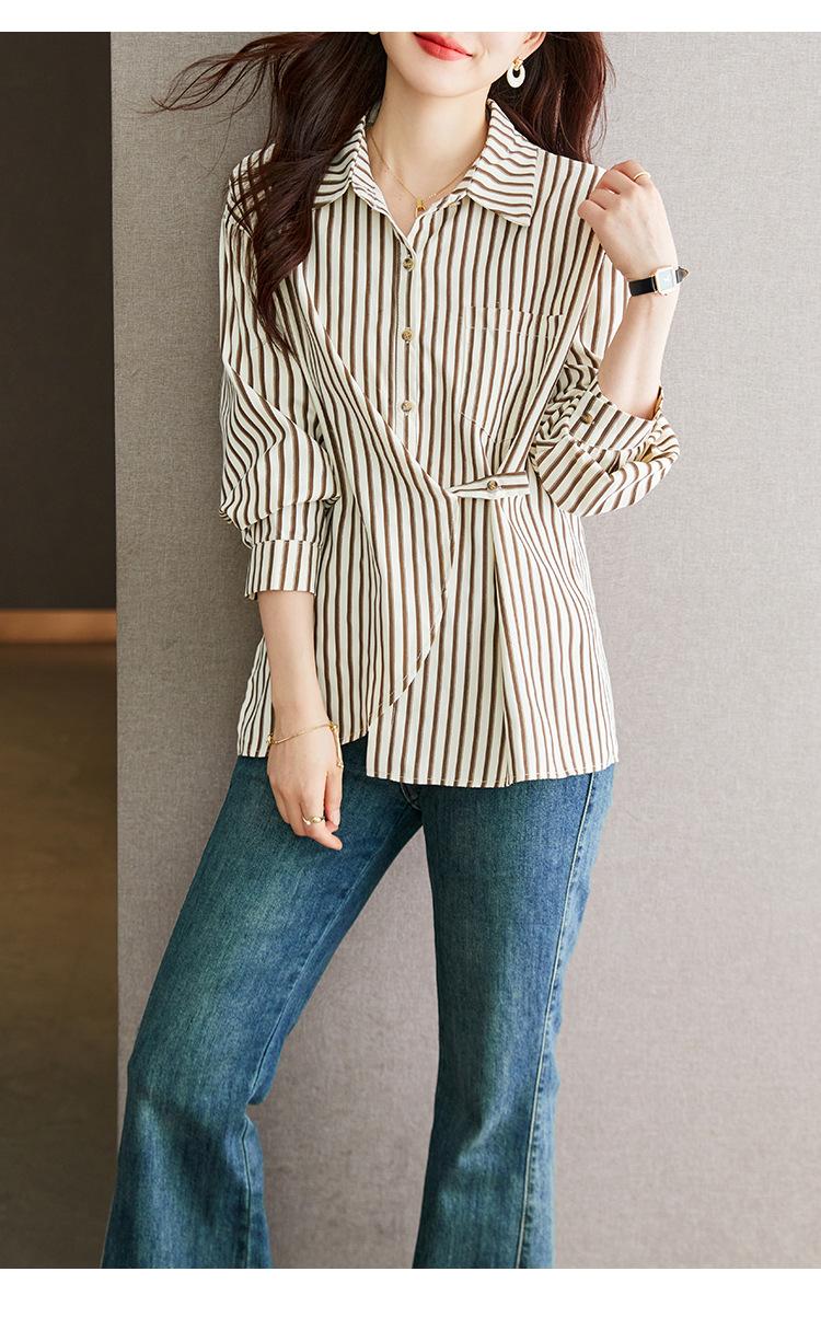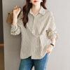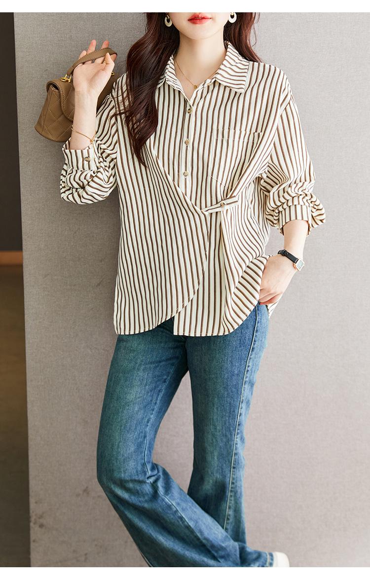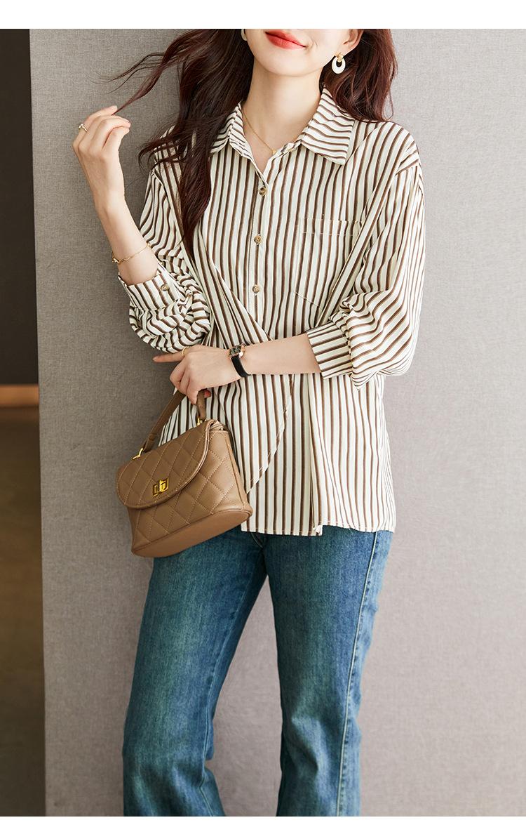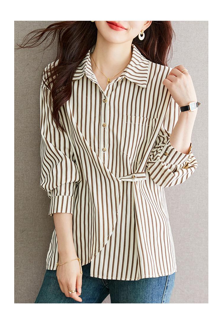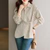 Primavera/Verano 2025 Nuevo Estilo Francés Rayado Color Café Manga Larga Mujer Holgada Asimétrica Commuter Versátil Camisa Casual