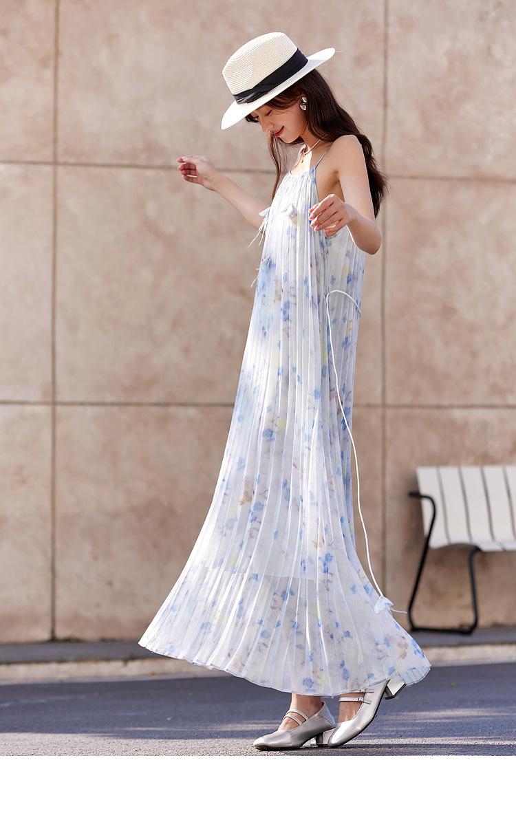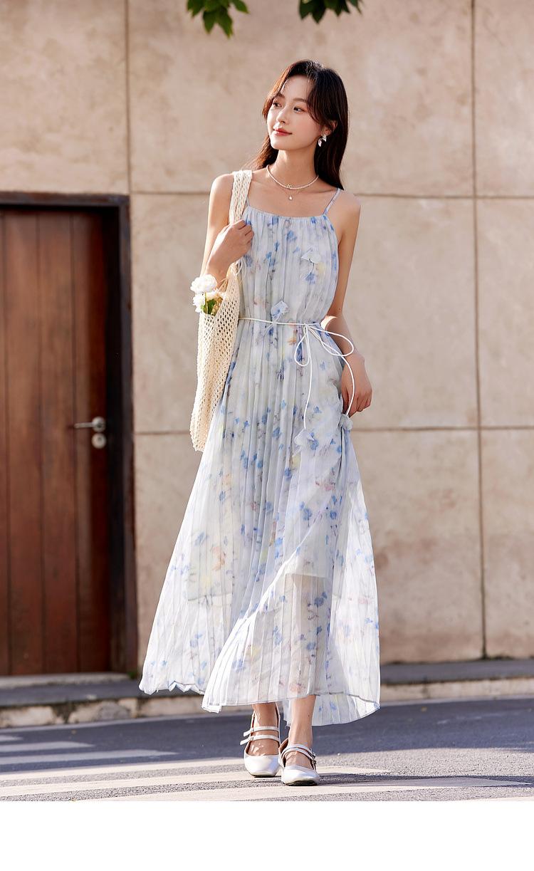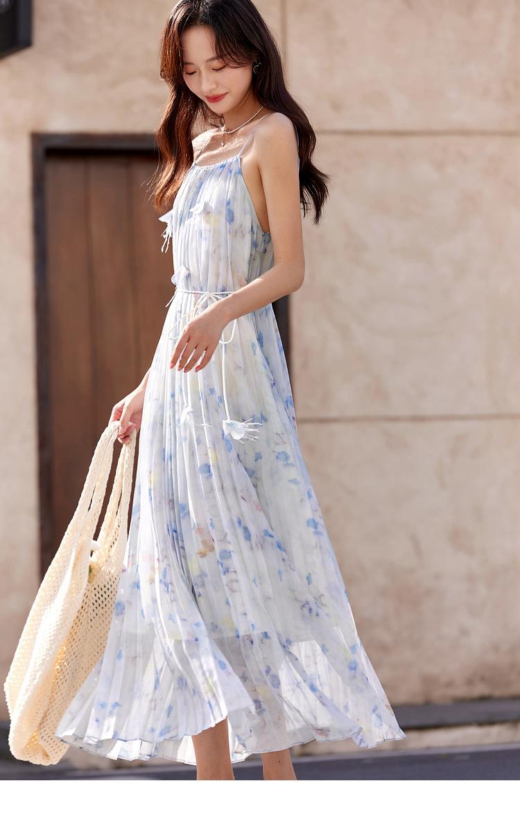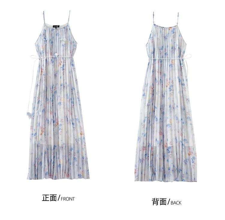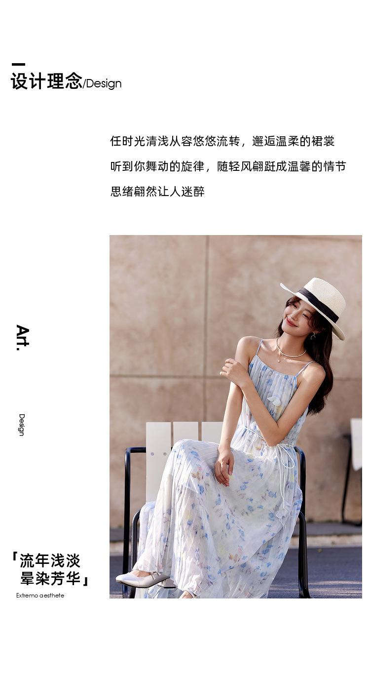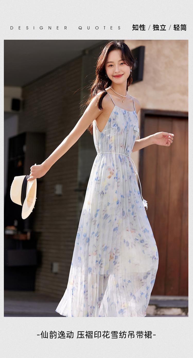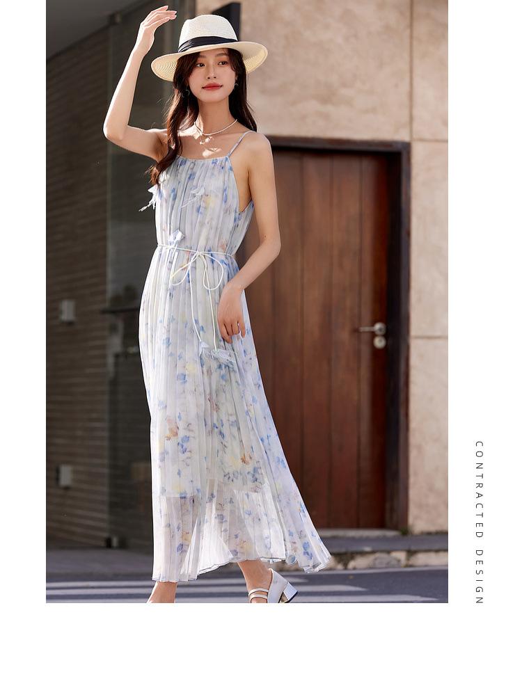 Zhen Xi - Vestido elegante de gasa con cintura alta, estampado plisado y tirantes finos, nuevo modelo DQ297