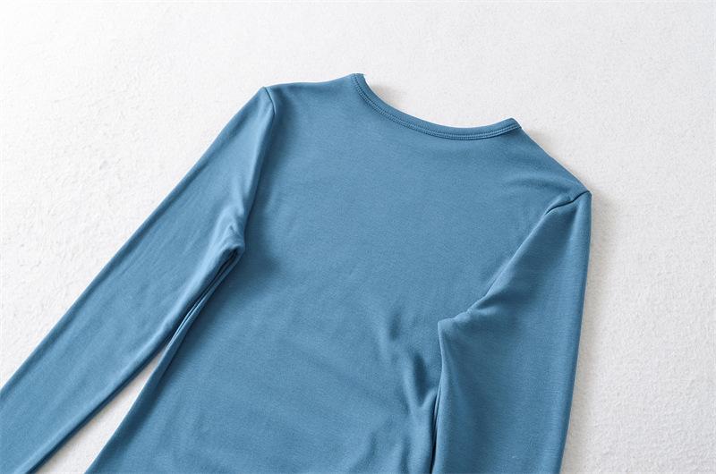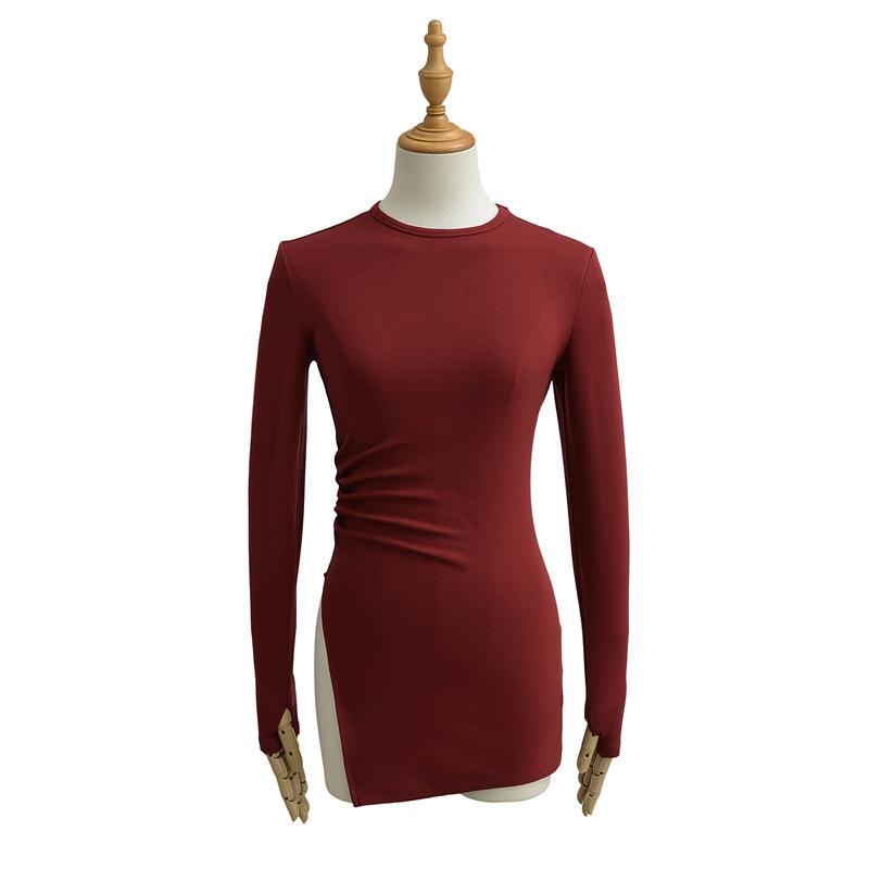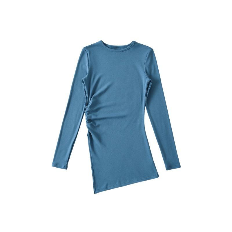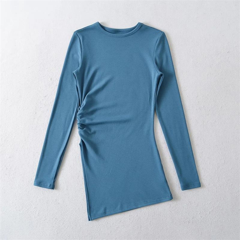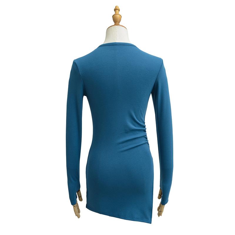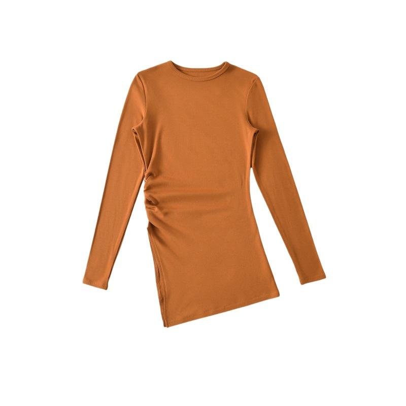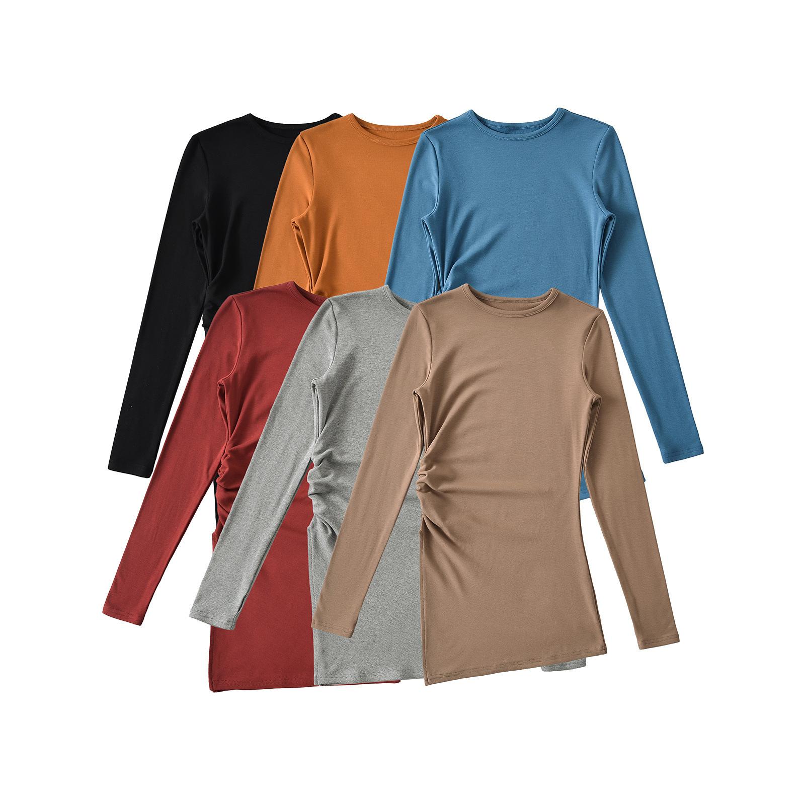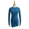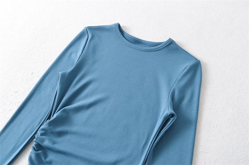 Camiseta americana de cuello redondo, manga larga, forrada con polar, diseño Sense, plisada, ajustada, elástica, de color liso, para mujer