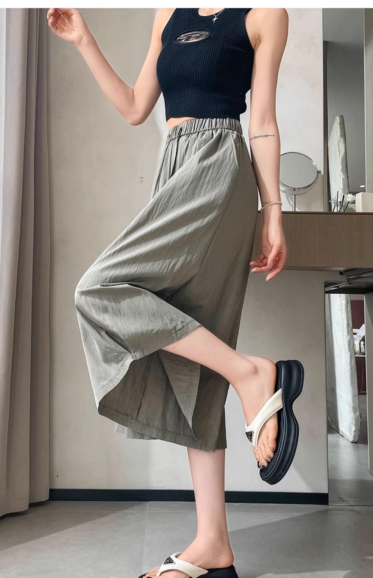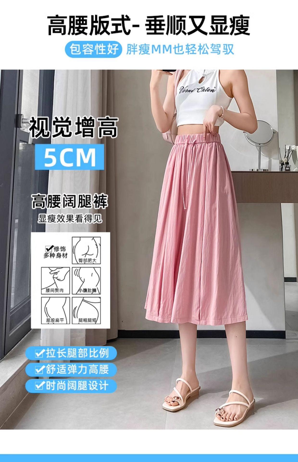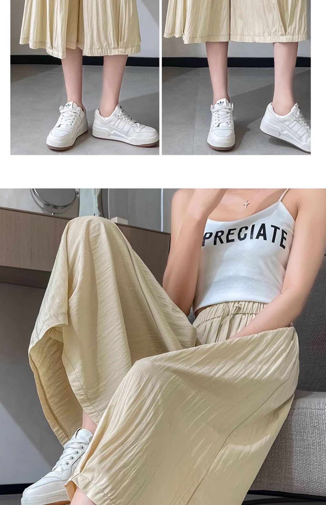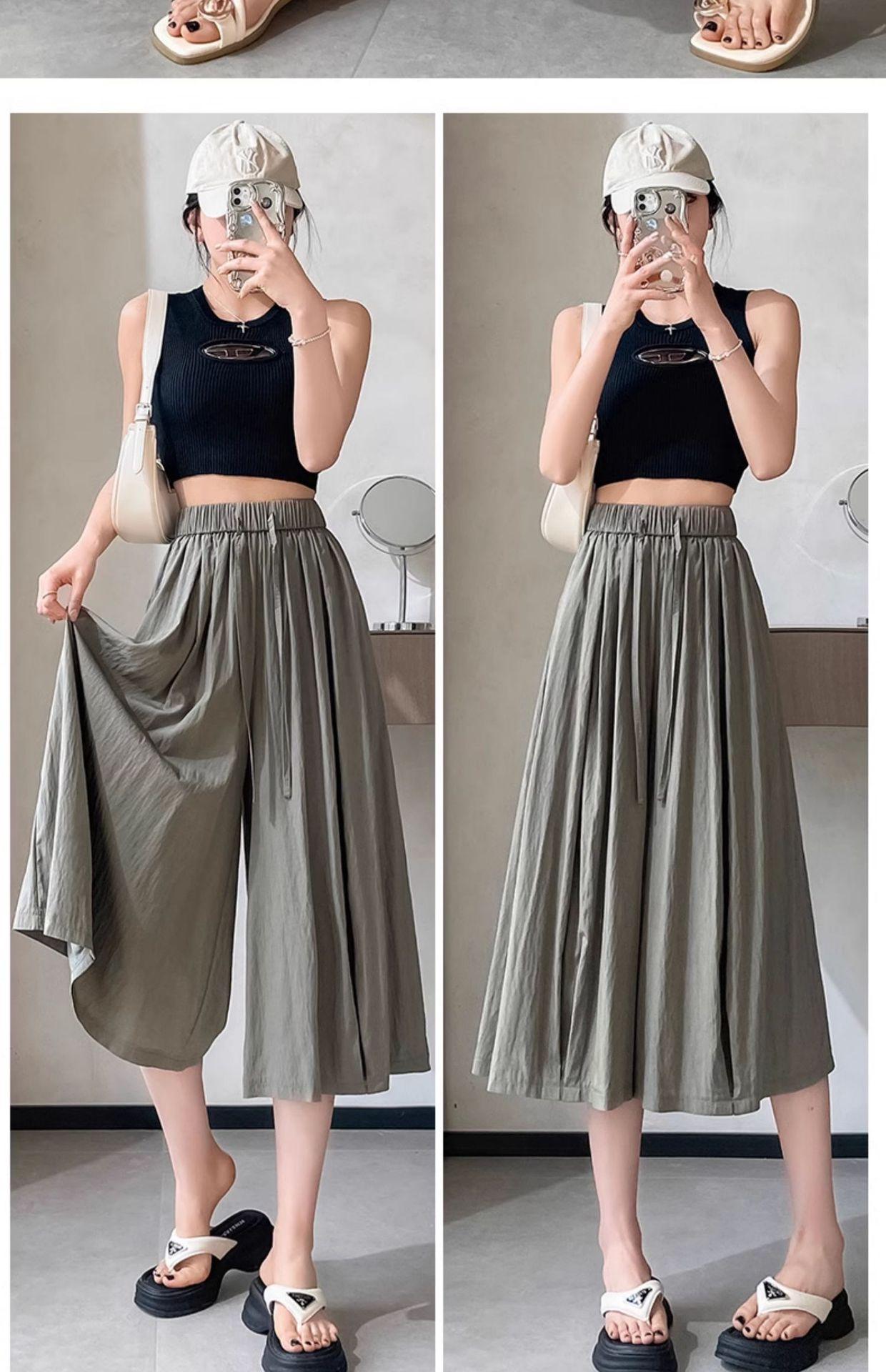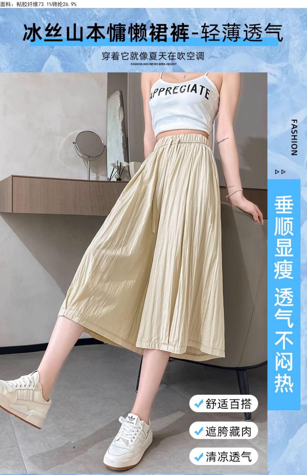 Pantalones de Falda Ancha Tres Cuartos de Talla Grande para Mujer, Estilo Delgado de Verano 2025 Nuevos Pantalones Frescos de Seda de Hielo, Pantalones de Falda Casual Drapeados de Cintura Alta