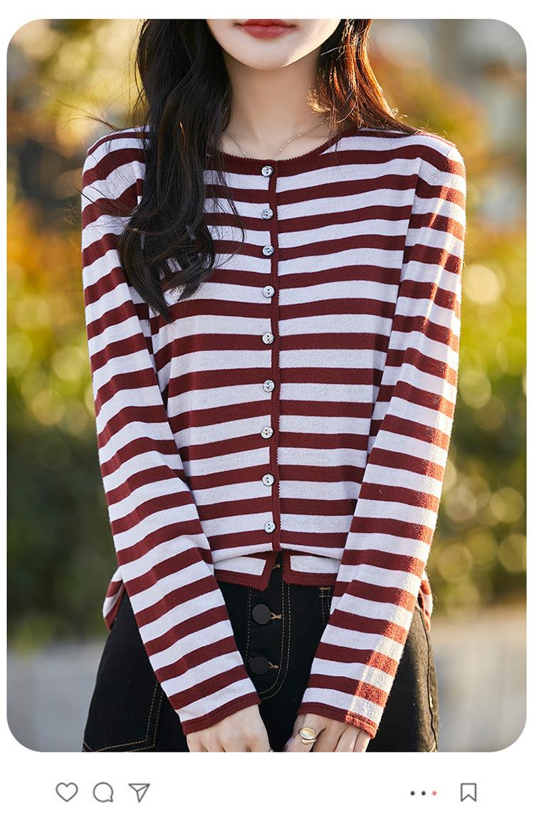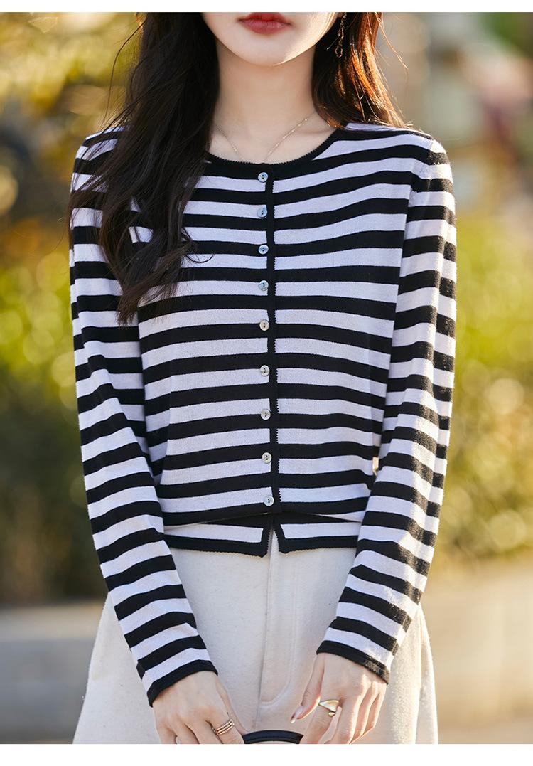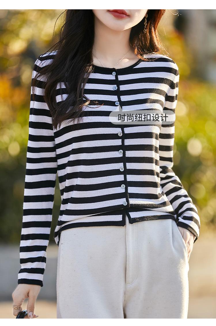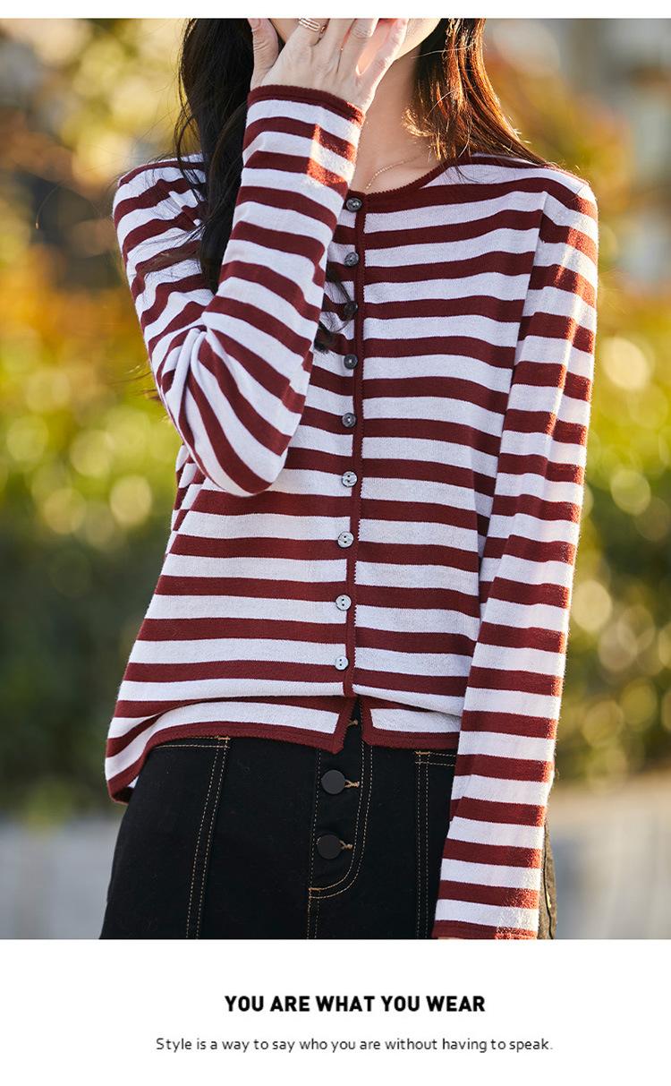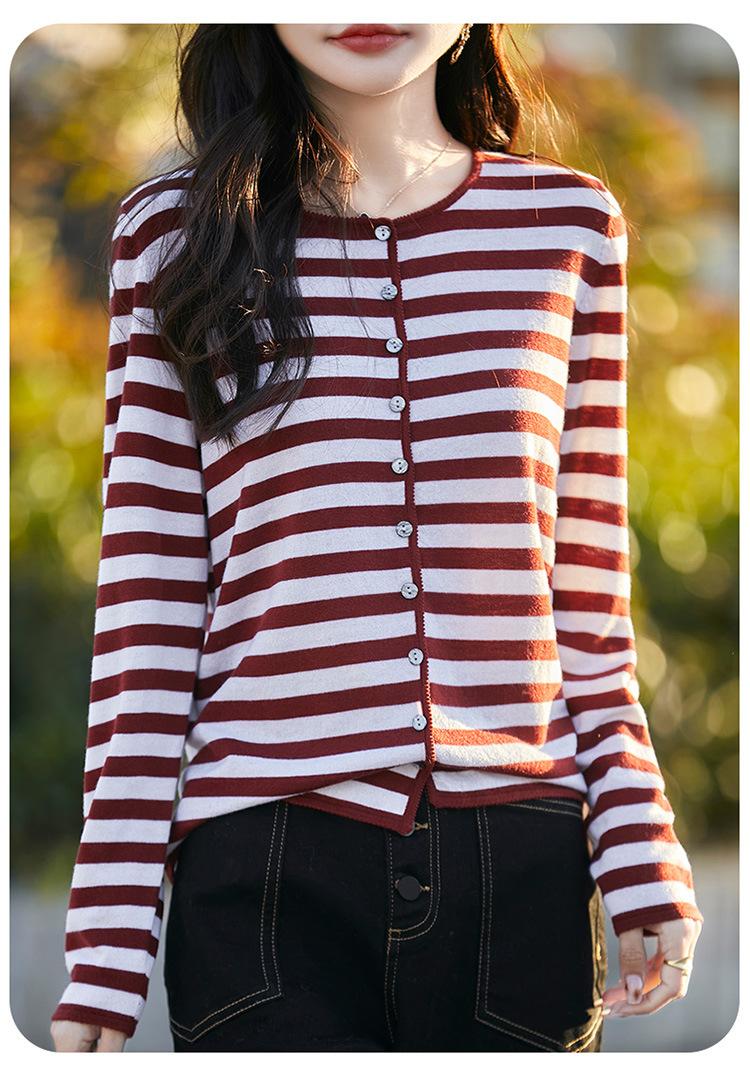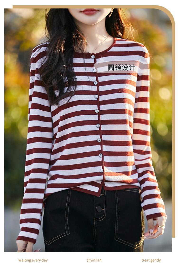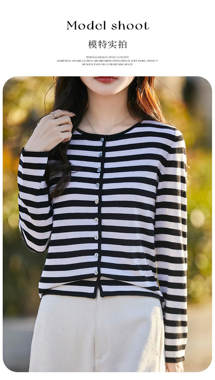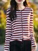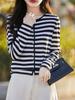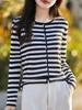 Chaqueta de punto de lana peinada, novedad de primavera 2025, suéter tipo cárdigan informal fino y combinable con todo, con cuello redondo y rayas.