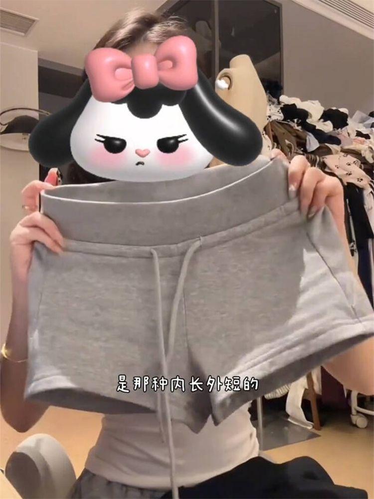 Pantalones cortos deportivos de cintura baja con cordón, estilo americano, ajustados, para mujer, color gris, para adelgazar la cadera, informales, de tres puntos.
