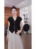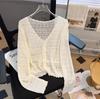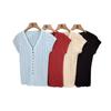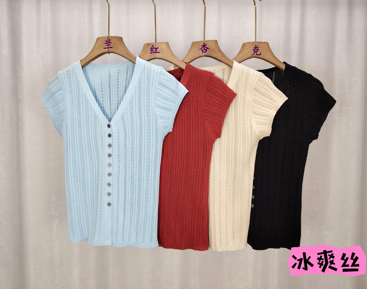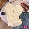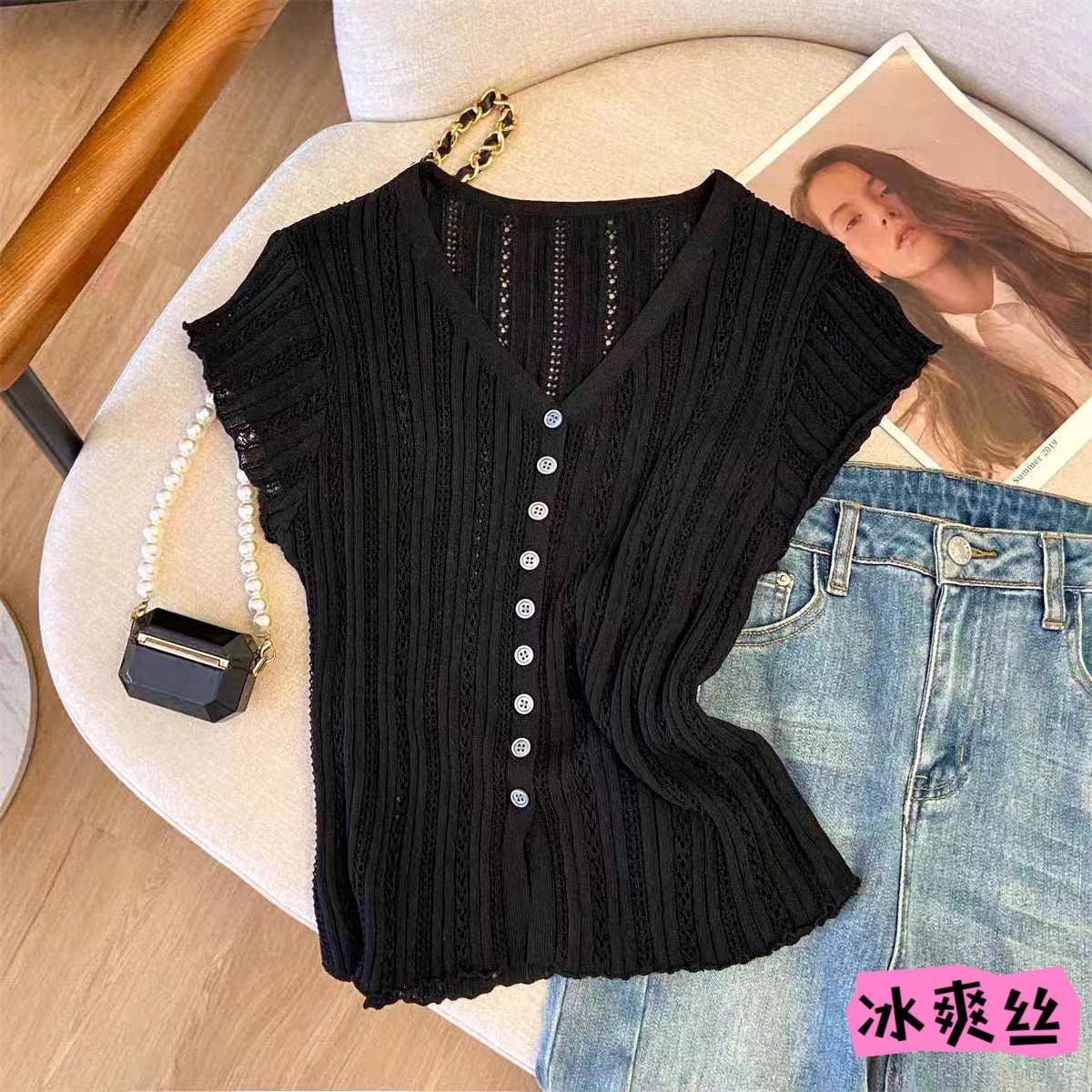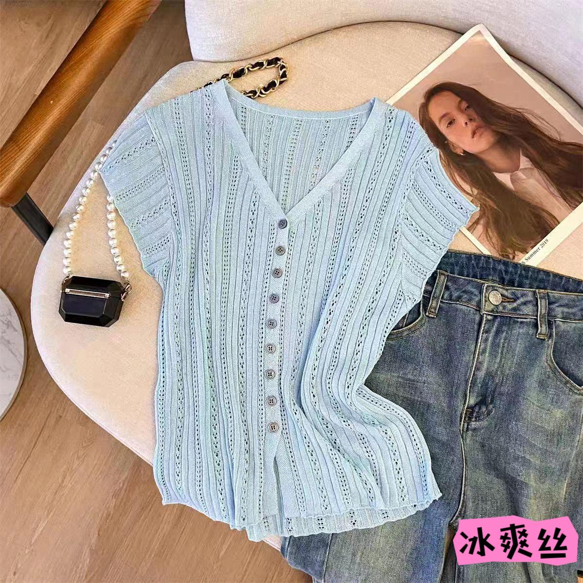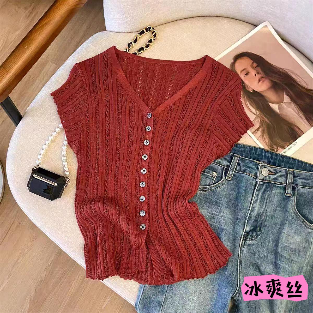 Camiseta de punto de seda de hielo Hollow Pit para mujer, estilo francés, elegante, cuello en V, mangas cortas con hebilla y cierre de hebilla, cárdigan corto de verano