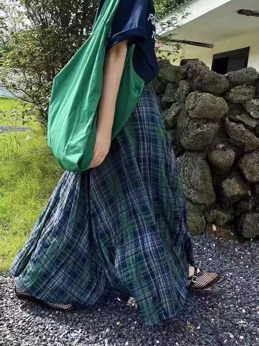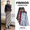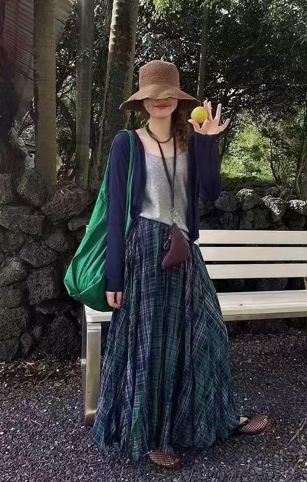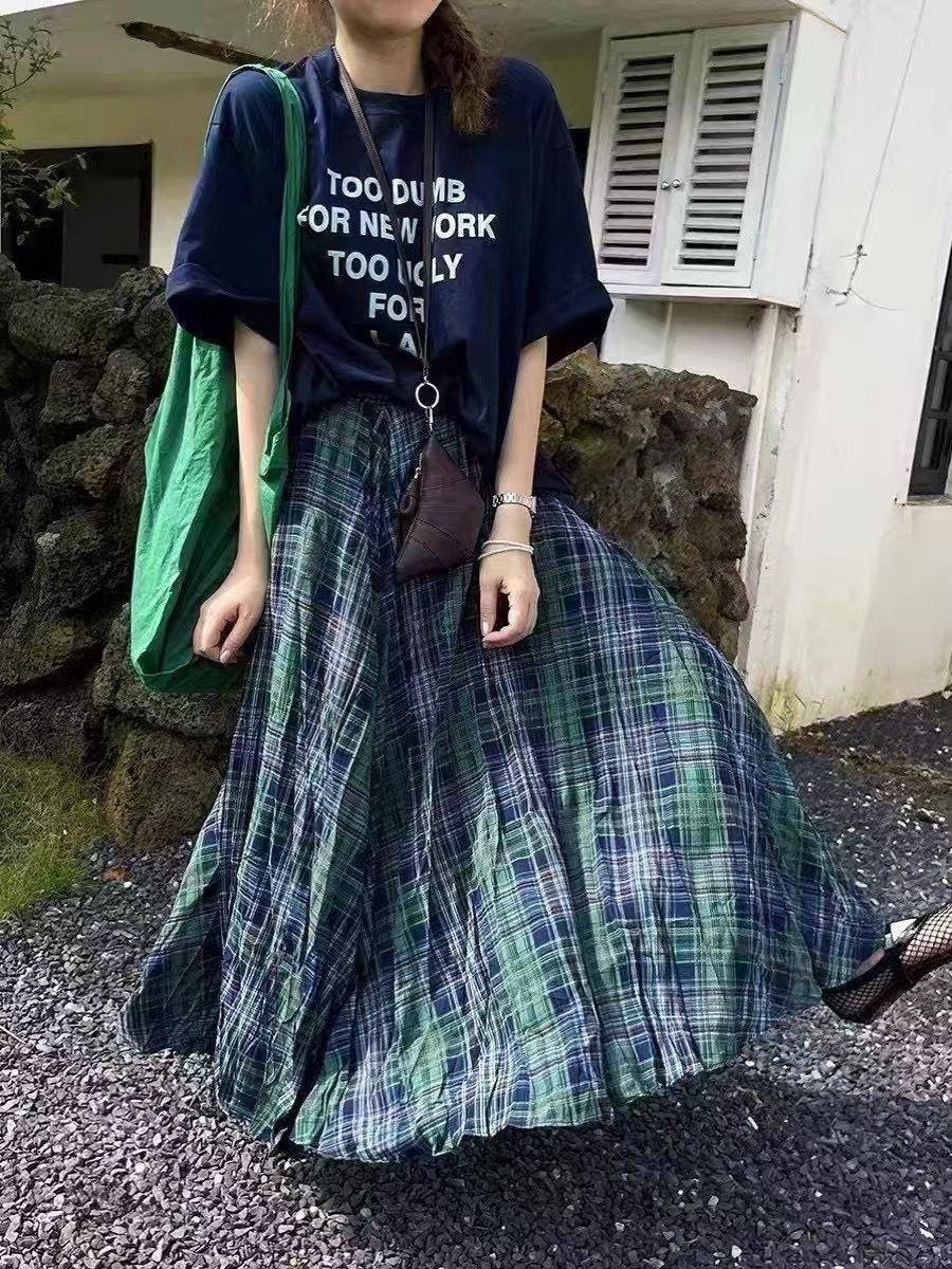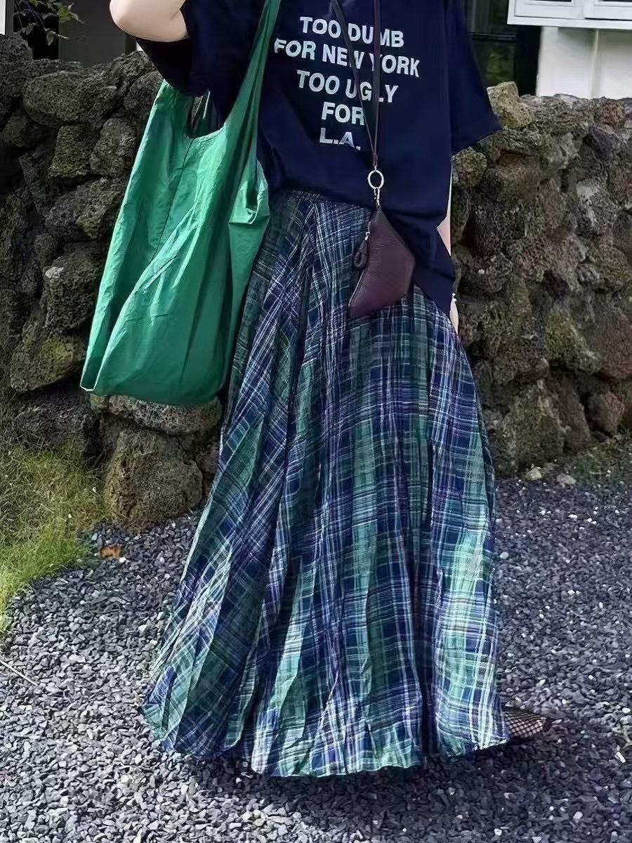 Falda a cuadros retro de cintura alta de trece líneas, de longitud media, con cintura elástica, para primavera y verano de 2025