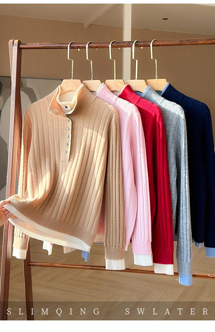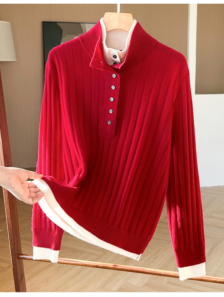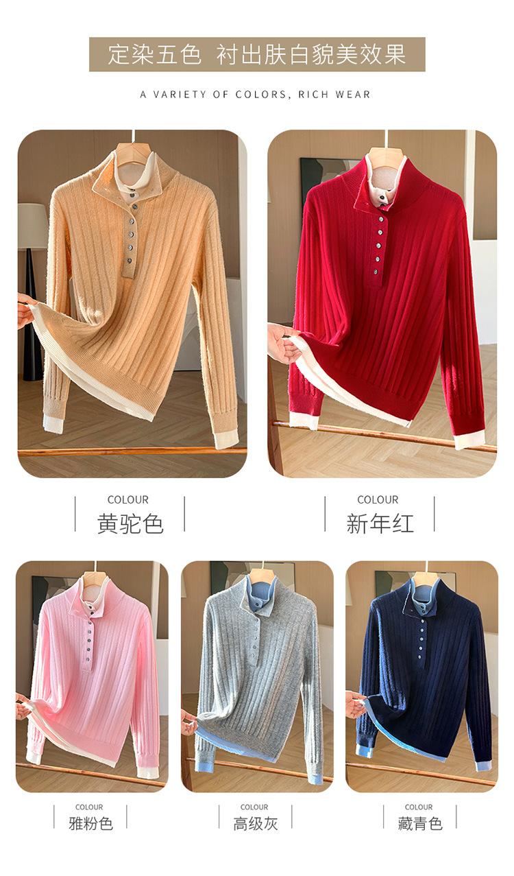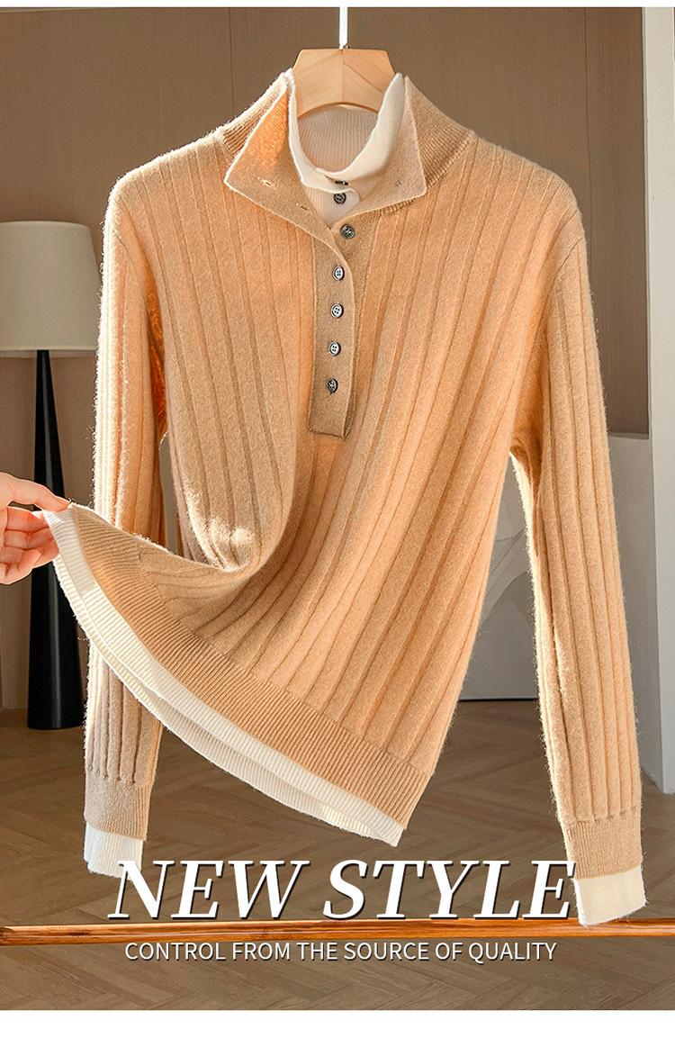 Suéter de Lana Pura Diseño Sensorial Color Contraste Falso Dos Piezas Cuello Alto Top de Punto para Mujer Otoño e Invierno Nuevo Suéter Interior