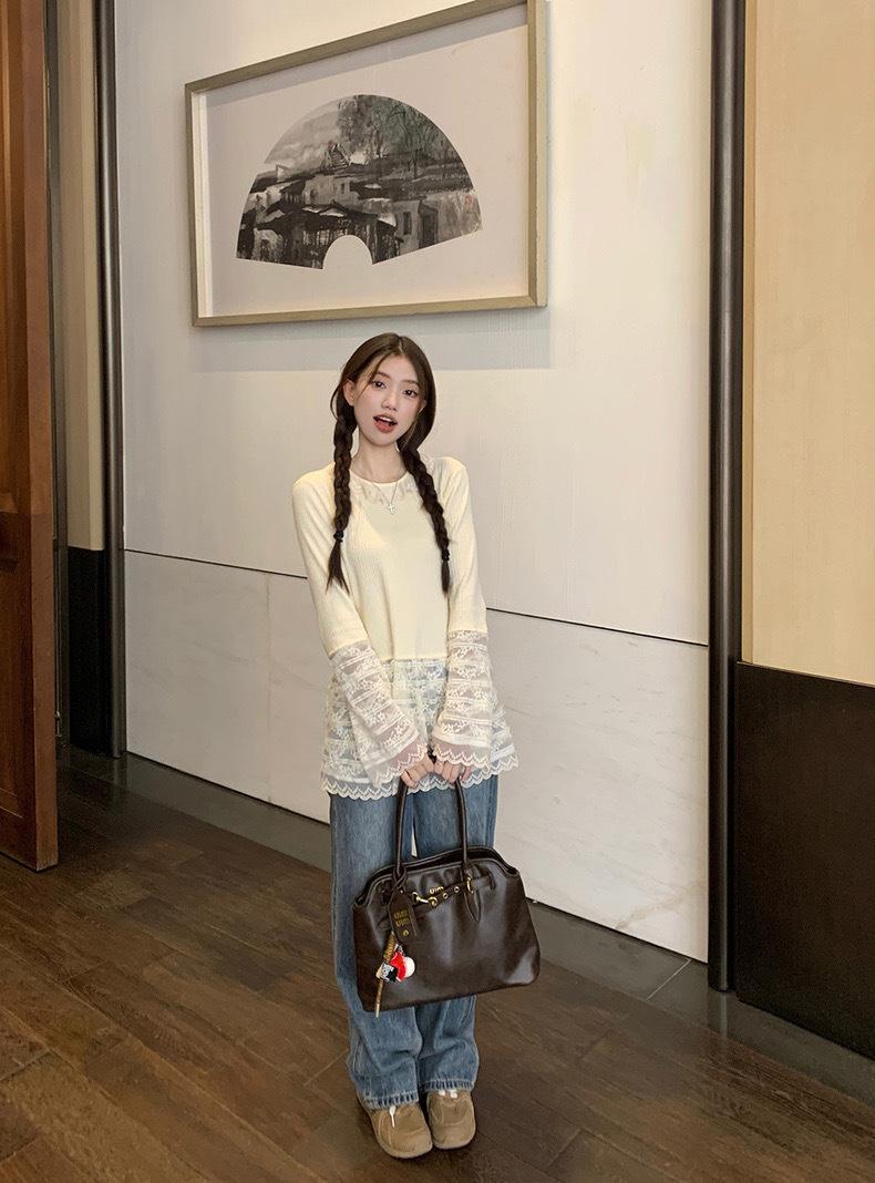 Compra Camisa Base de Encaje Estilo Francés para Niña Dulce para Mujer Primavera y Otoño Nueva Llegada Uso Interior Uso Exterior Manga Larga Dobladillo con Costuras Nicho Top al por mayor en Joom.pro