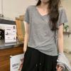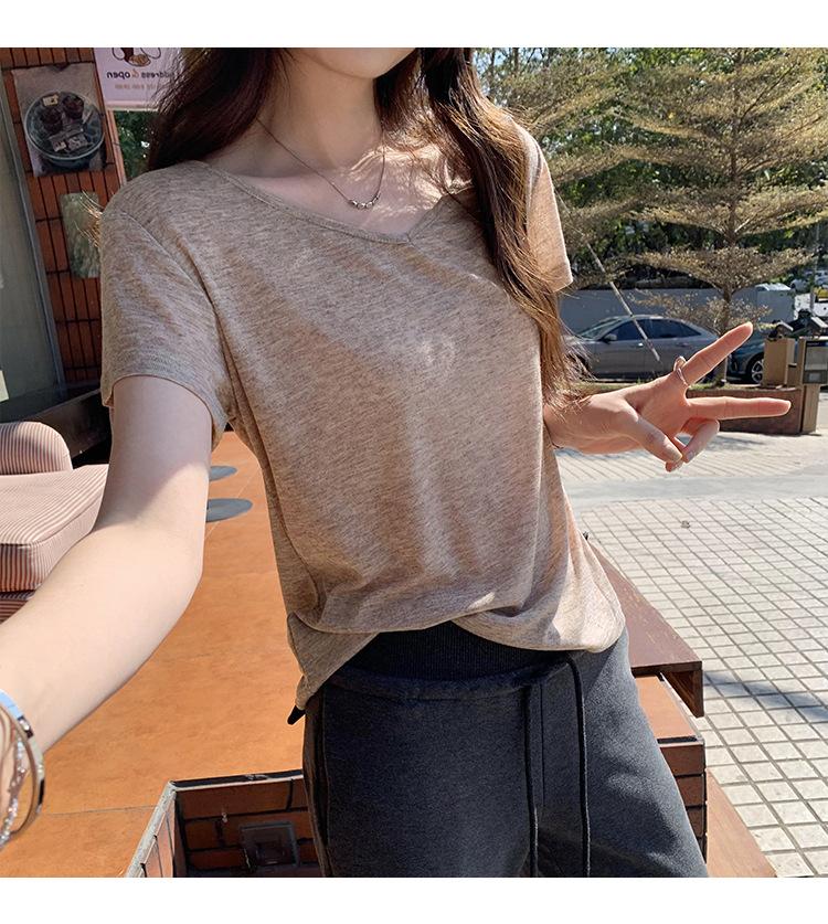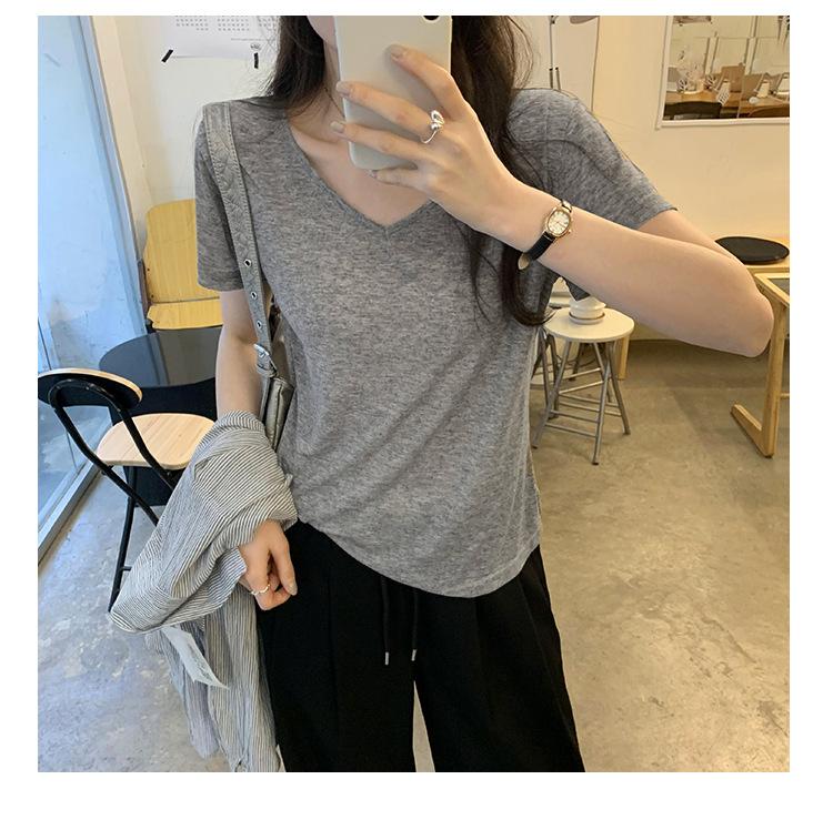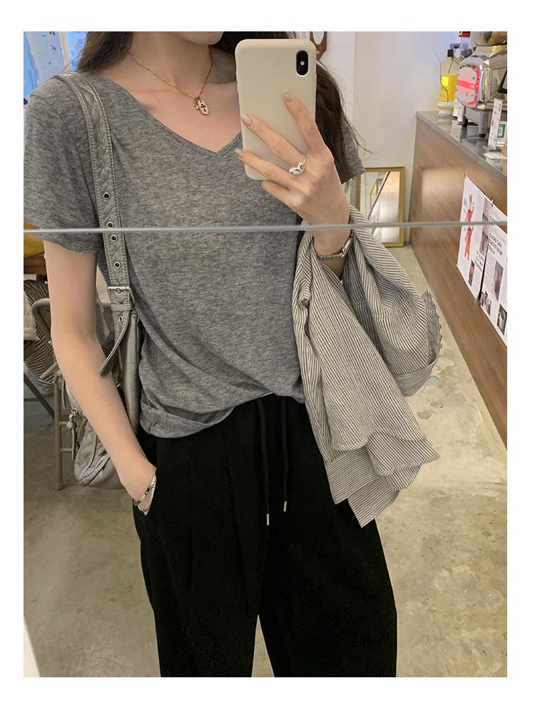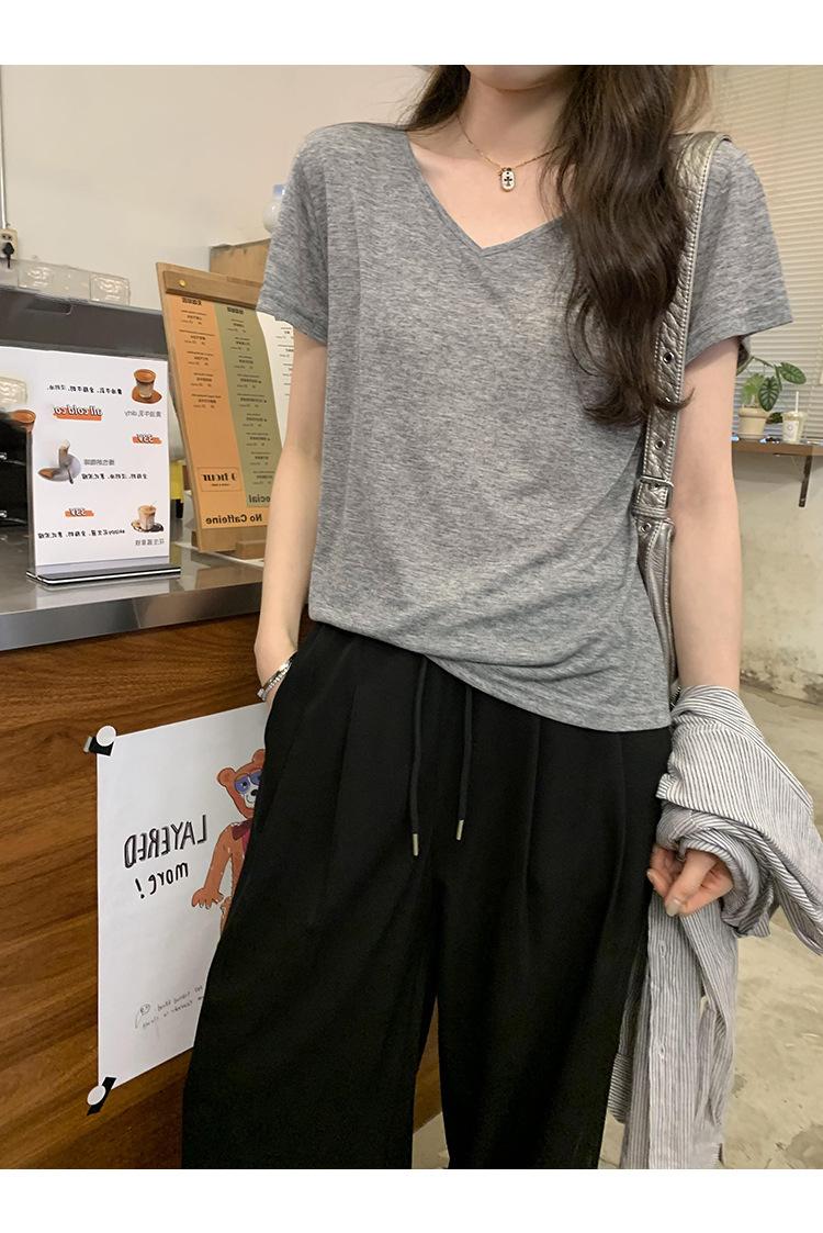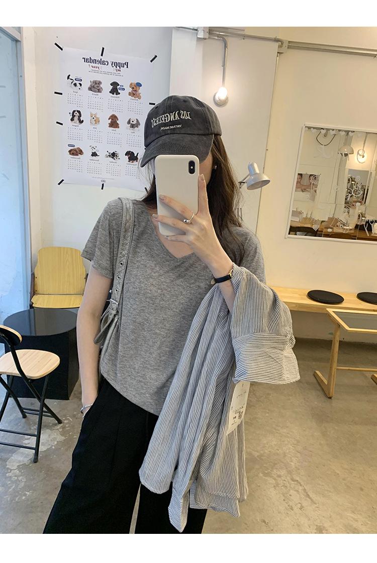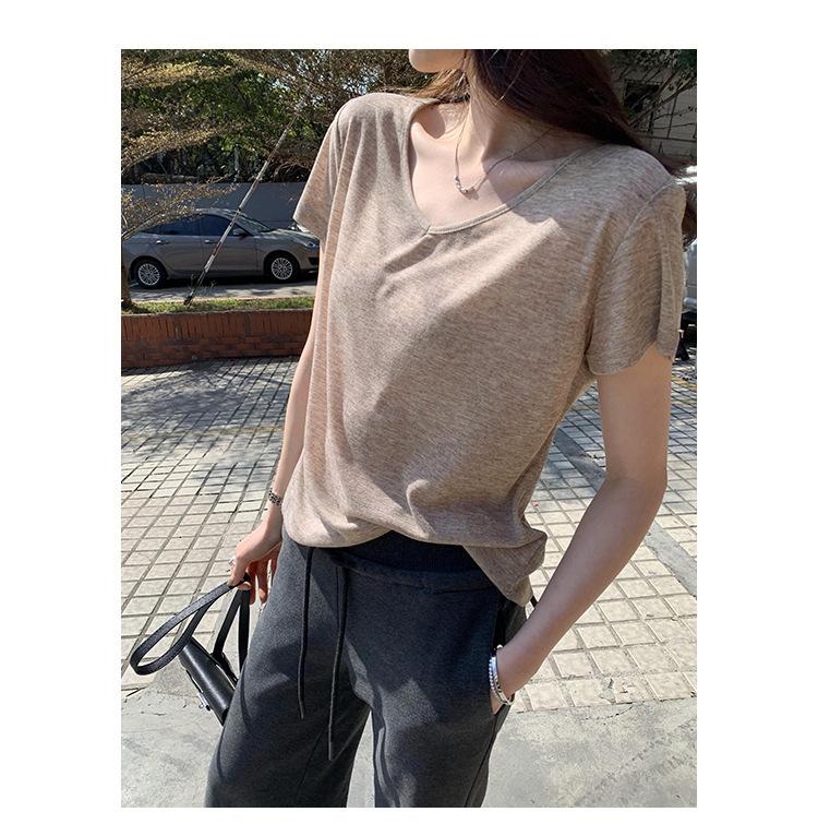 Camiseta holgada de manga corta con cuello en V y diseño de estilo europeo para mujer, buena camiseta ajustada de verano 2025.