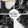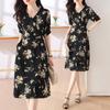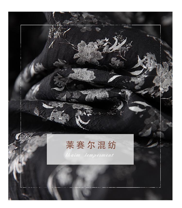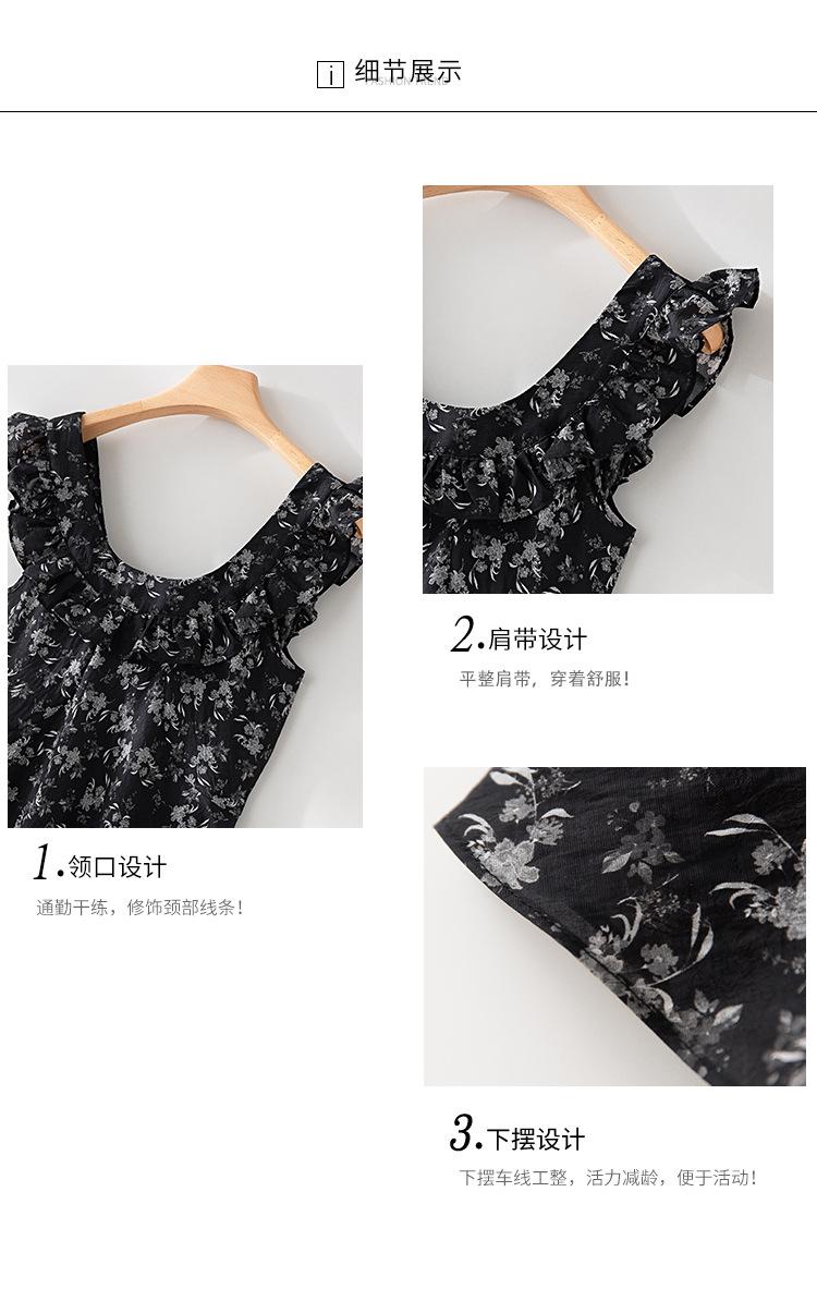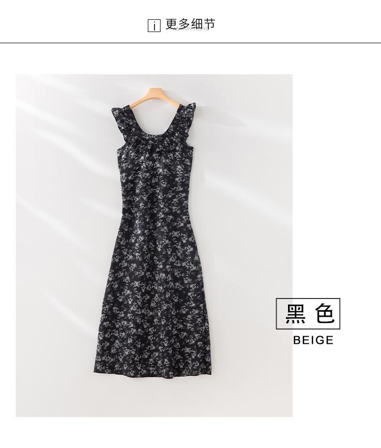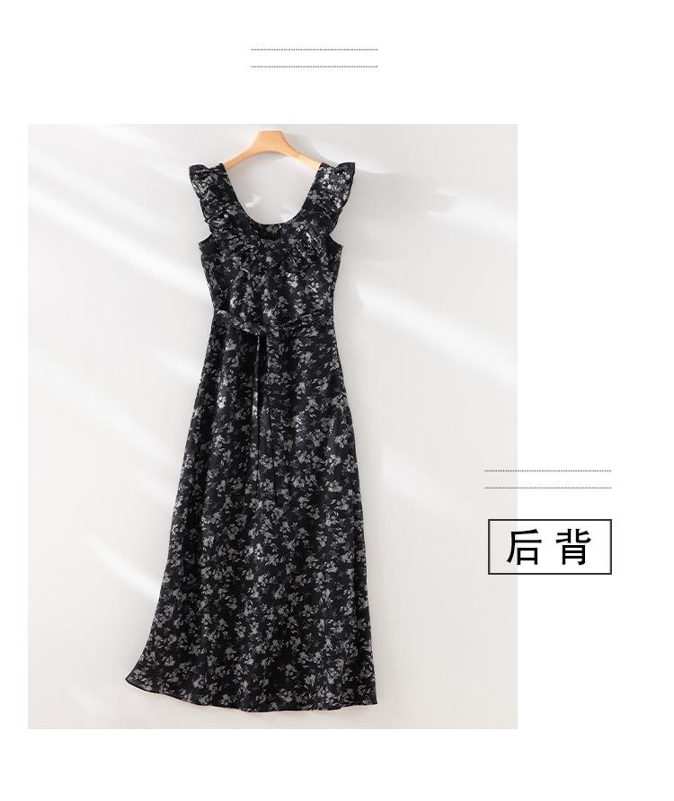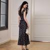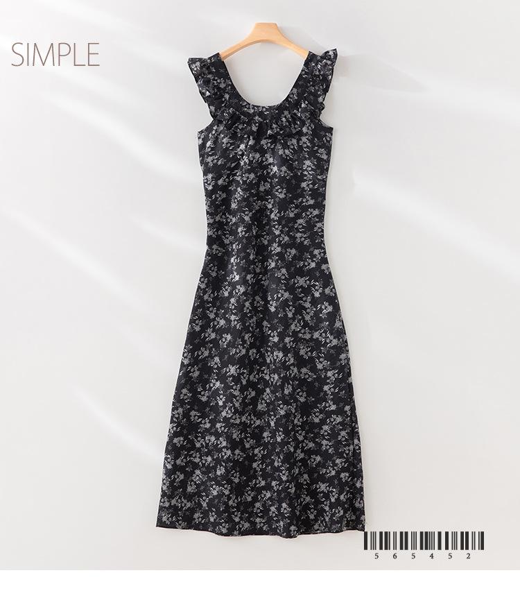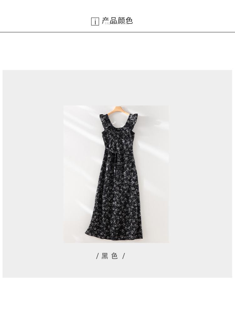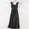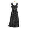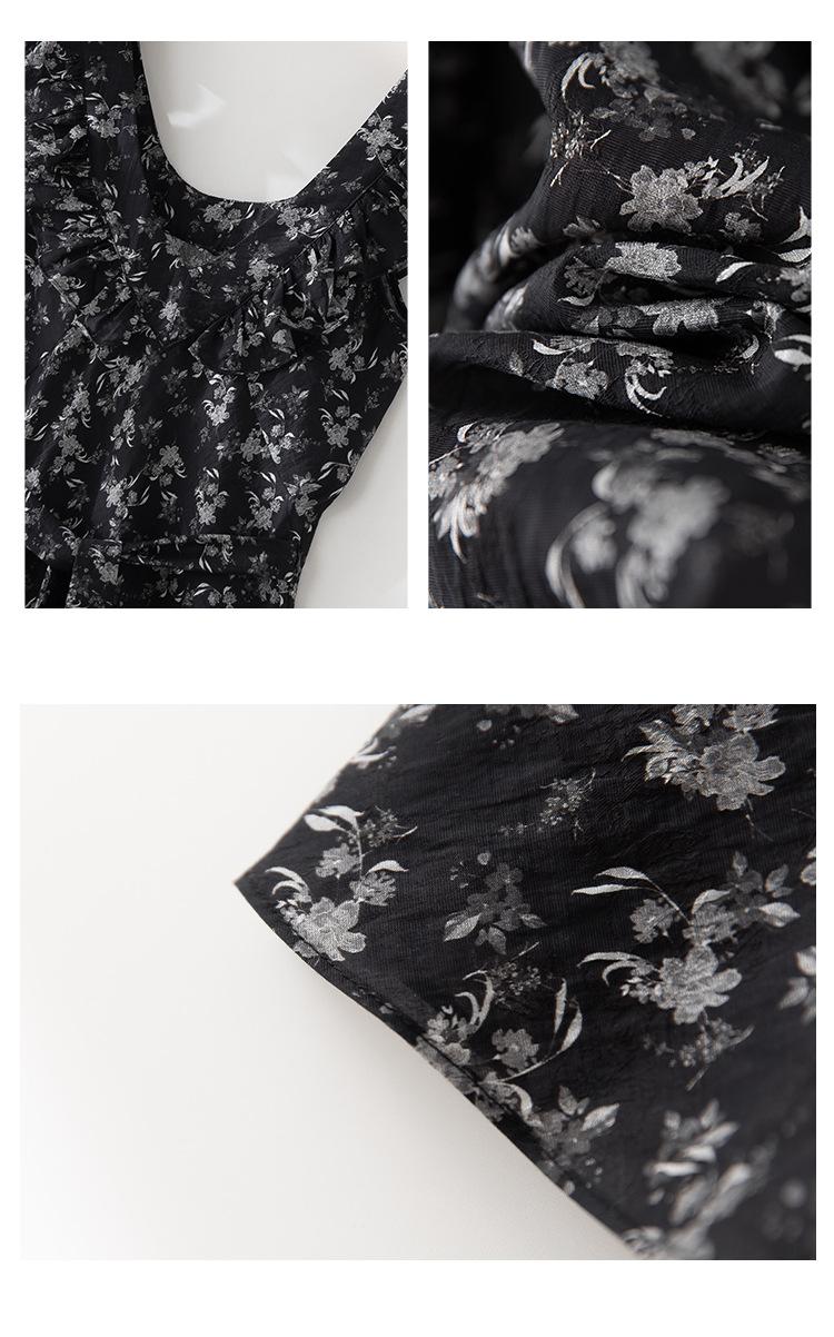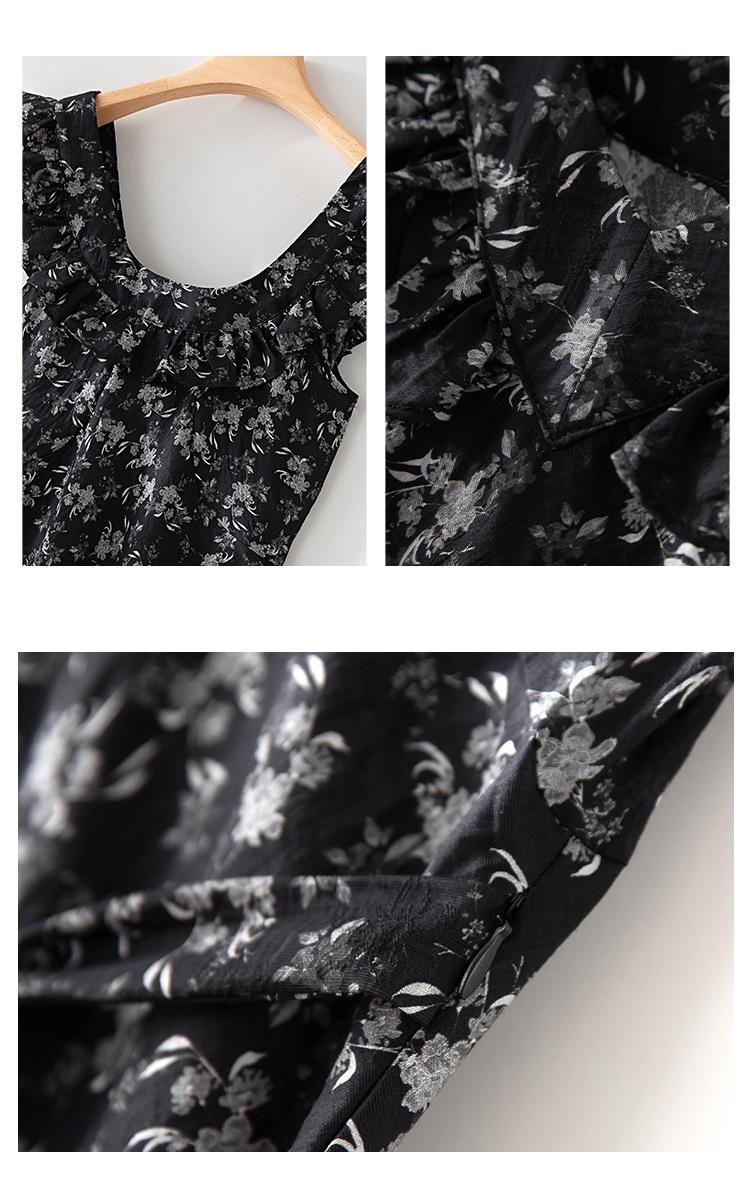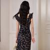 Verano Nuevo Vestido Floral Negro con Volantes, Mangas Volantes y Dulce Temperamento Falda Larga para Mujer