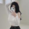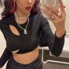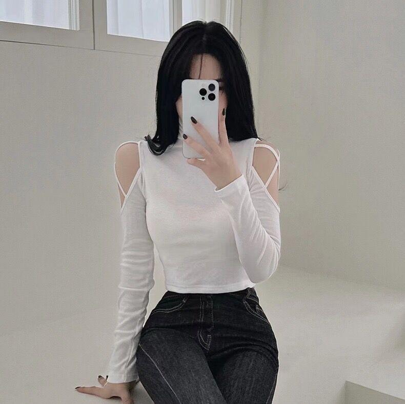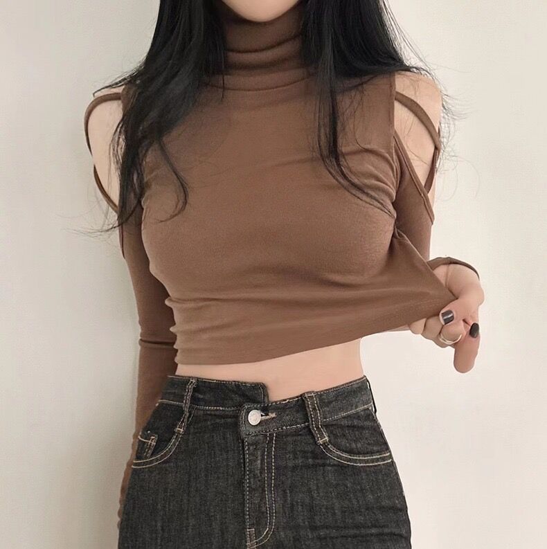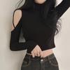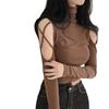 Camiseta de manga larga ajustada con cuello alto y hombros descubiertos para mujer, nueva camiseta elegante con abertura en el ombligo para primavera y otoño.