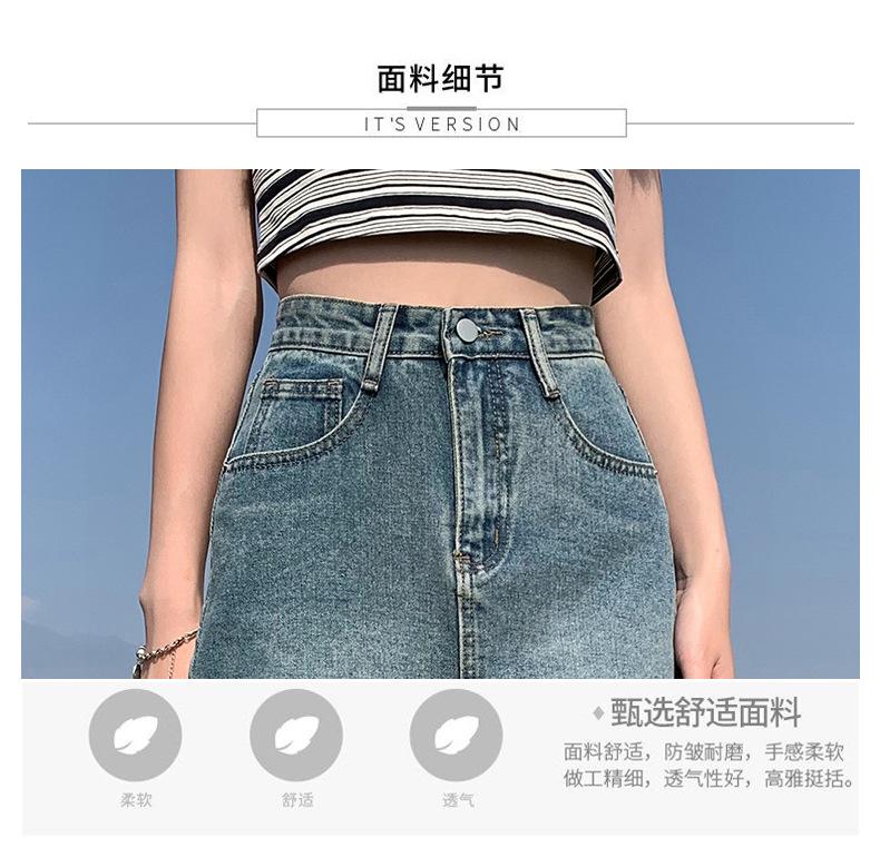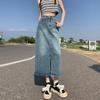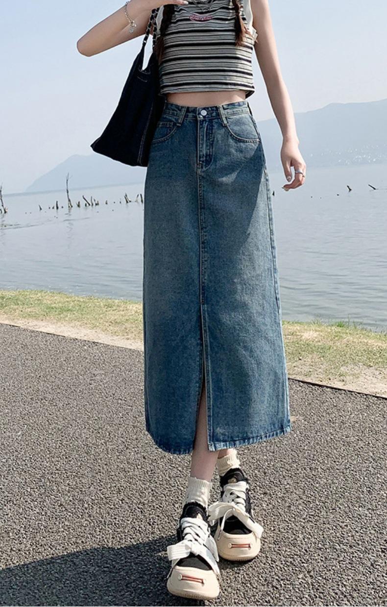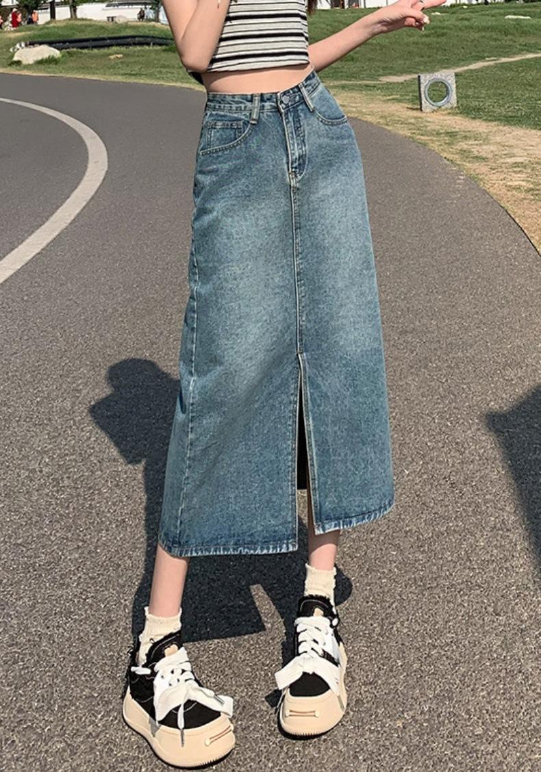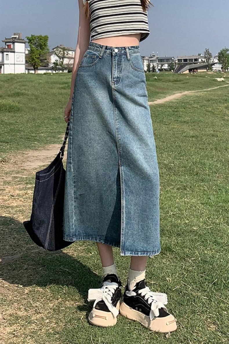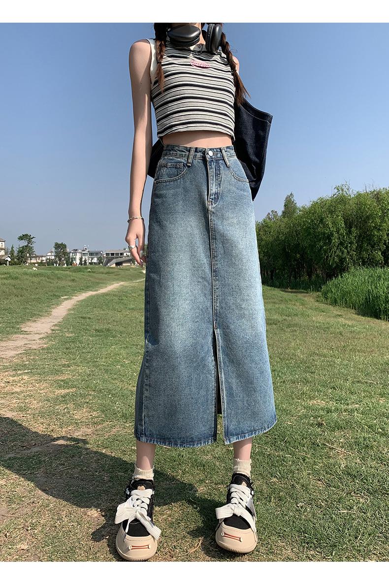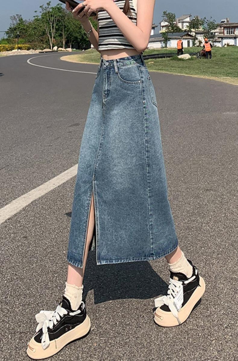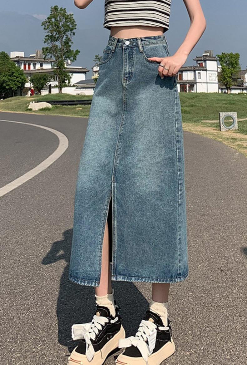 Falda vaquera de cintura alta, estilo retro, adelgazante, de longitud media, para mujer, primavera y verano, ajustada y con abertura en la cadera.