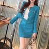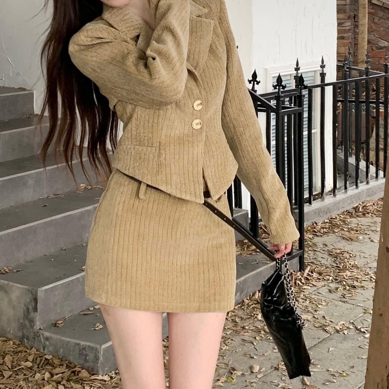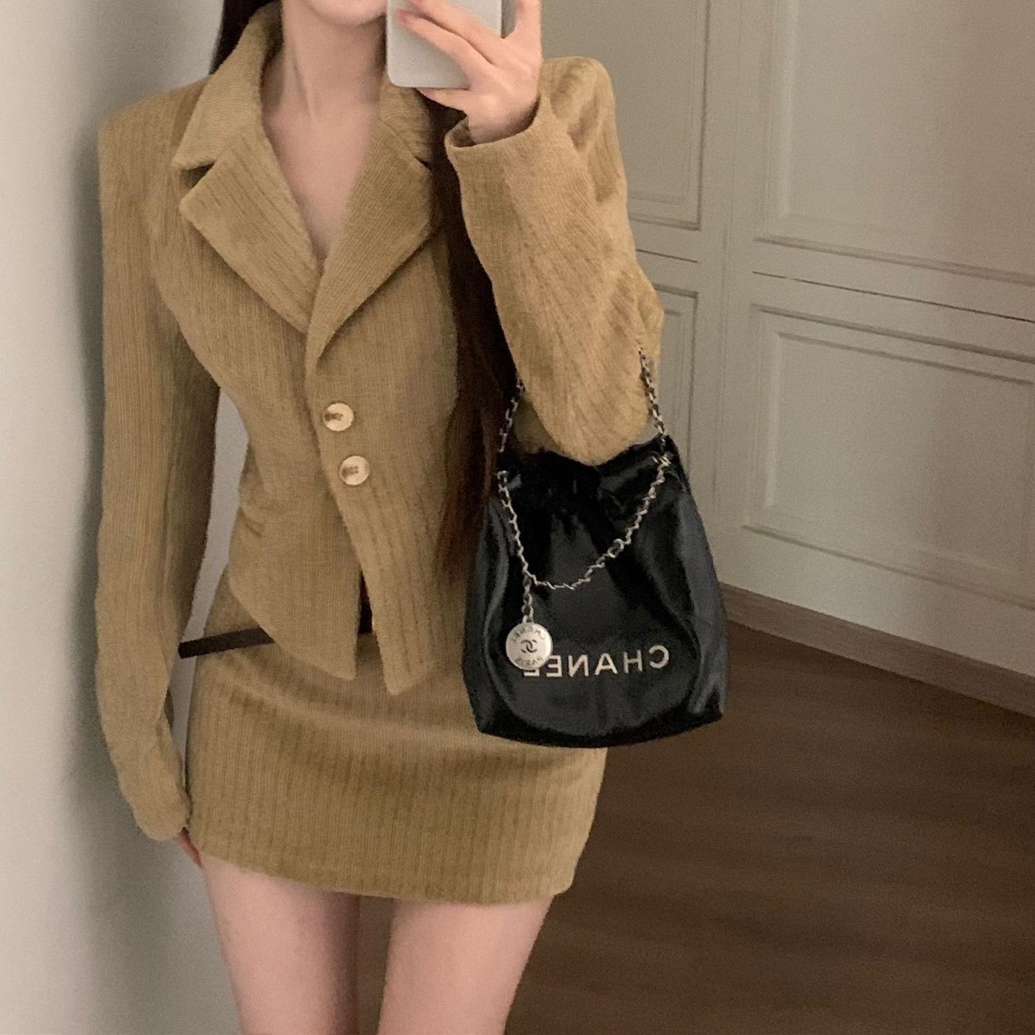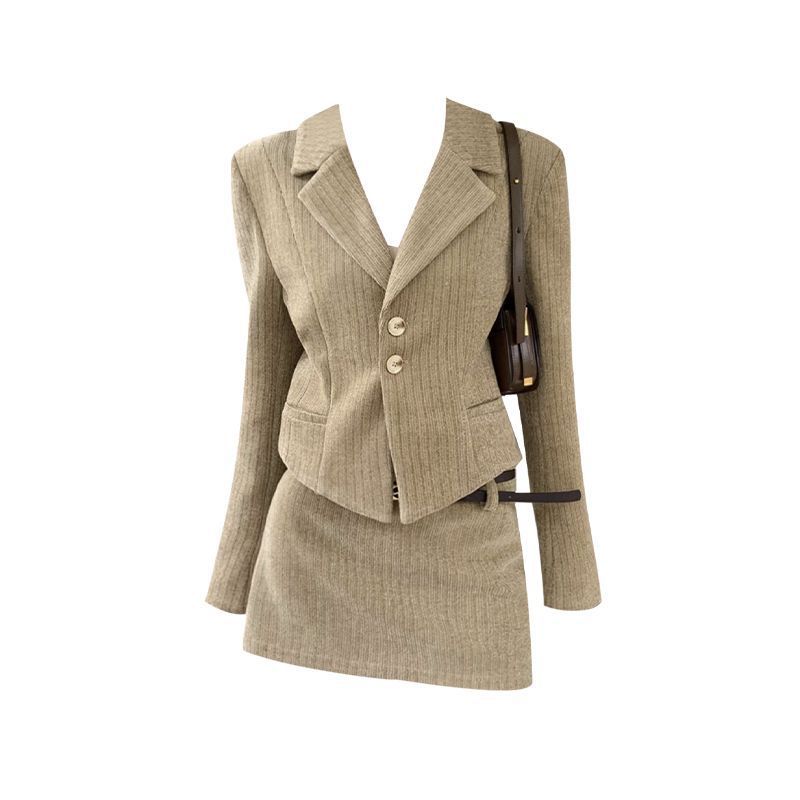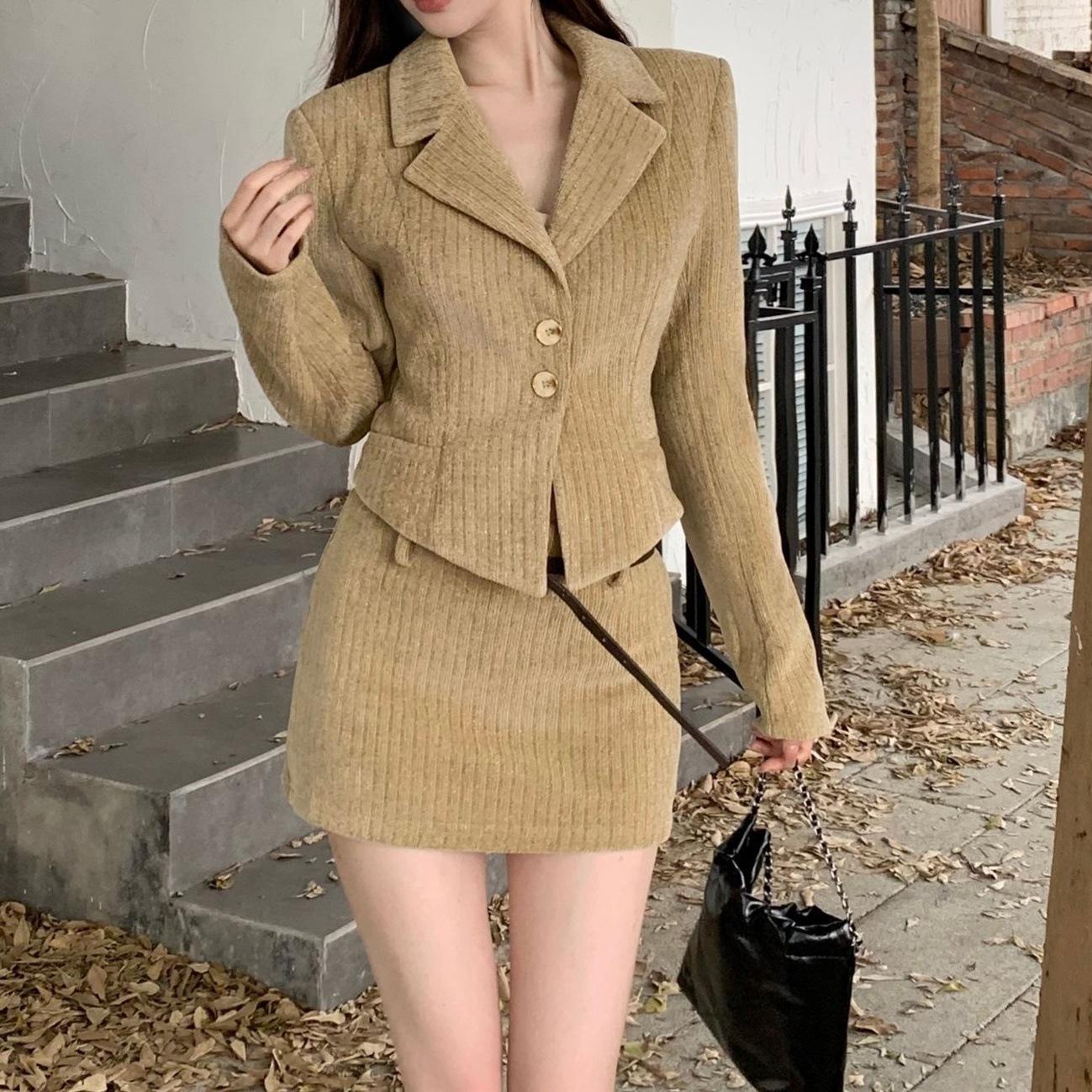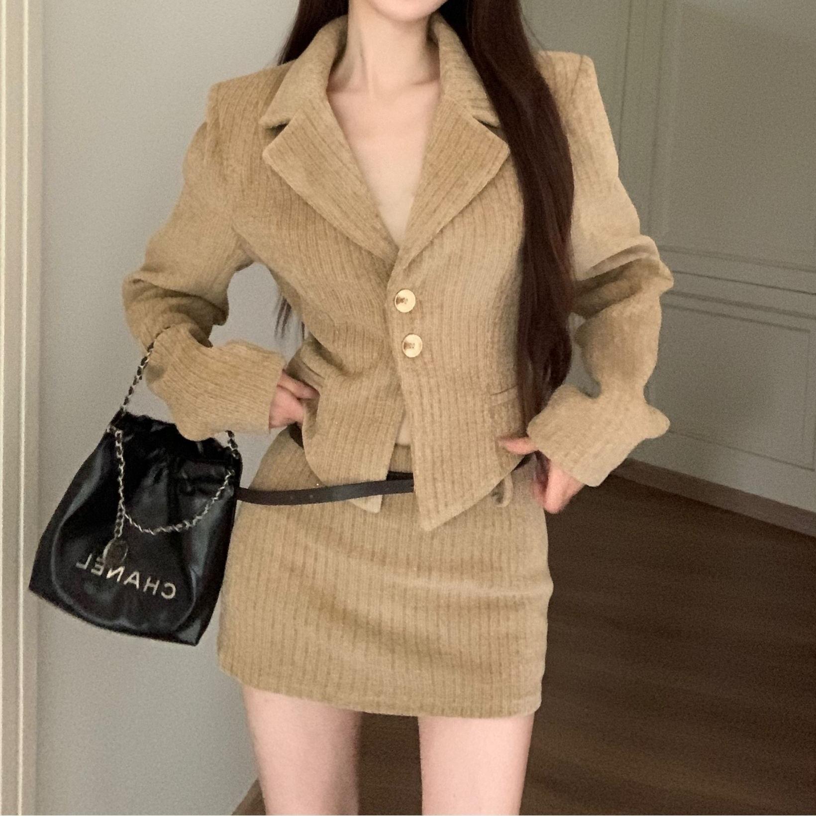 Conjunto pequeño de dos piezas para primavera y otoño con chaqueta corta, falda a la cadera y traje a rayas de cintura ajustada estilo Chanel de Maillard.