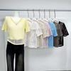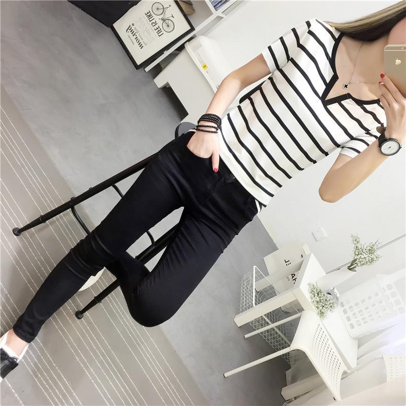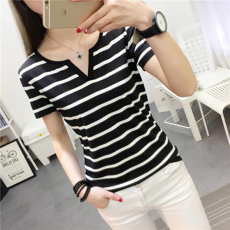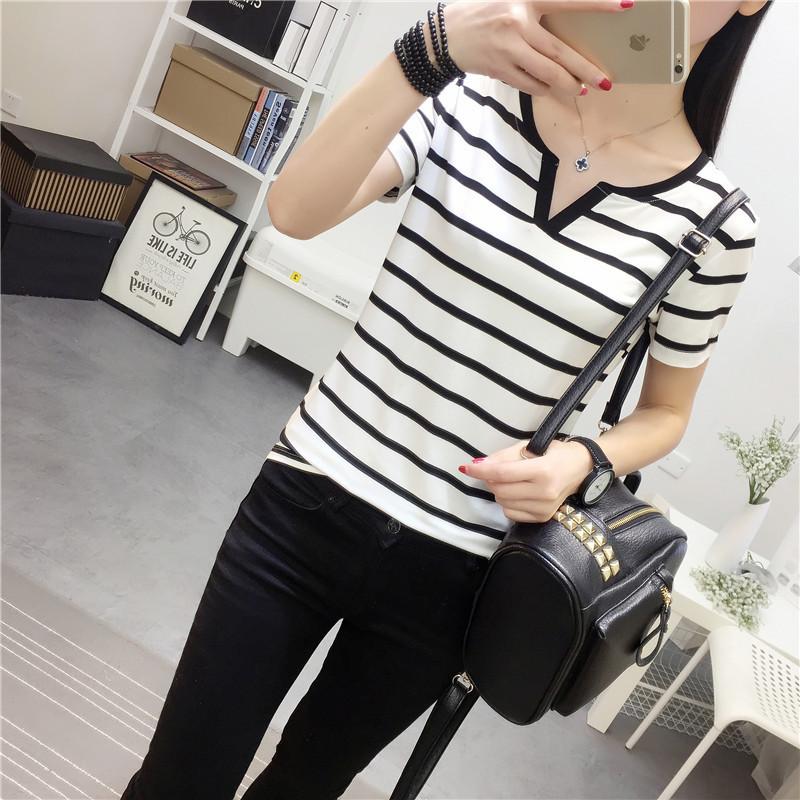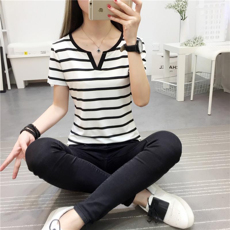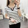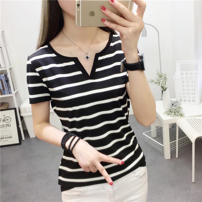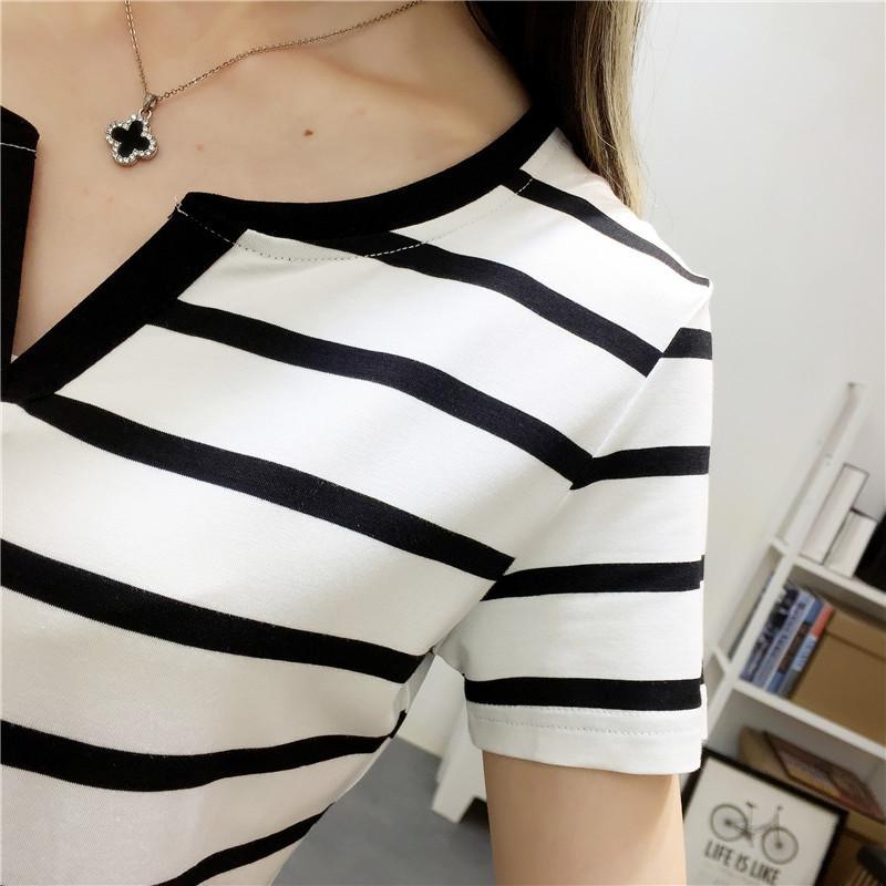 Camiseta de manga corta con cuello en V para mujer, top elástico de moda de talla grande, camiseta holgada a rayas de verano 2025 para mujer