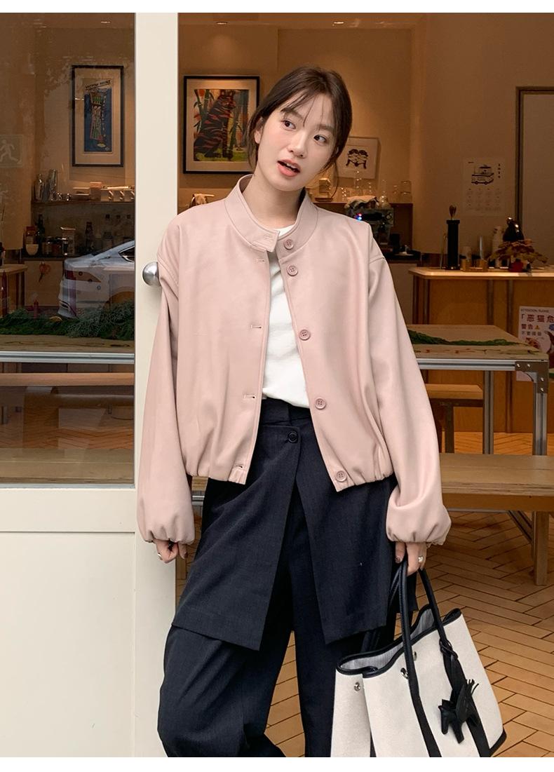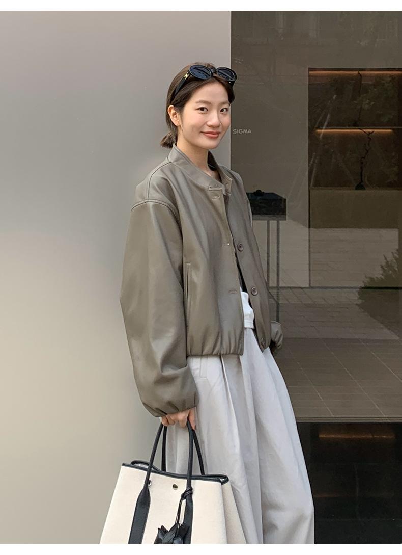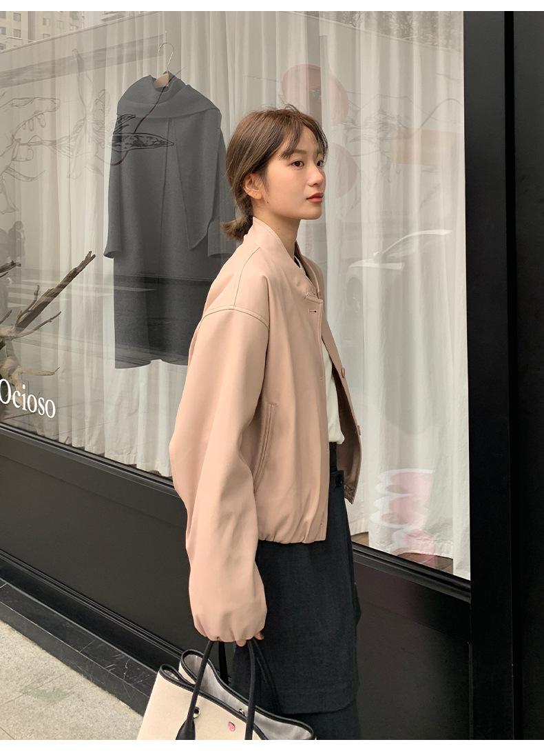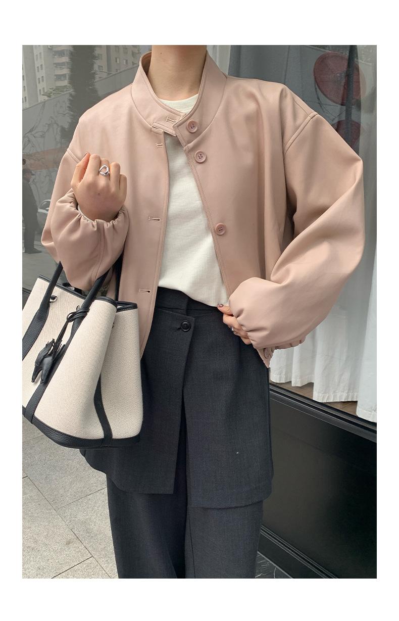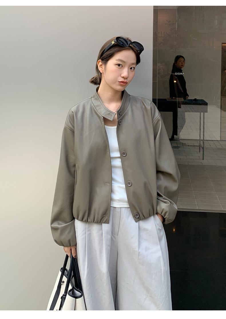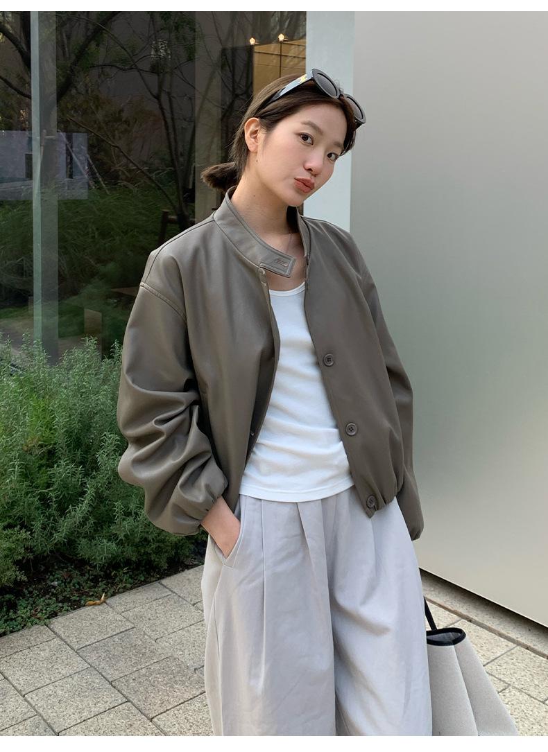 La Chaqueta de Cuero PU con Cuello Mao para Mujer 2025 Trece Líneas Otoño de Alta Calidad Chaqueta de Un Solo Botón T025