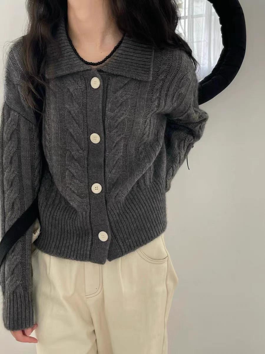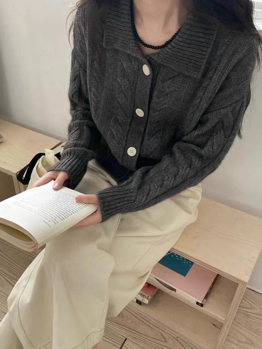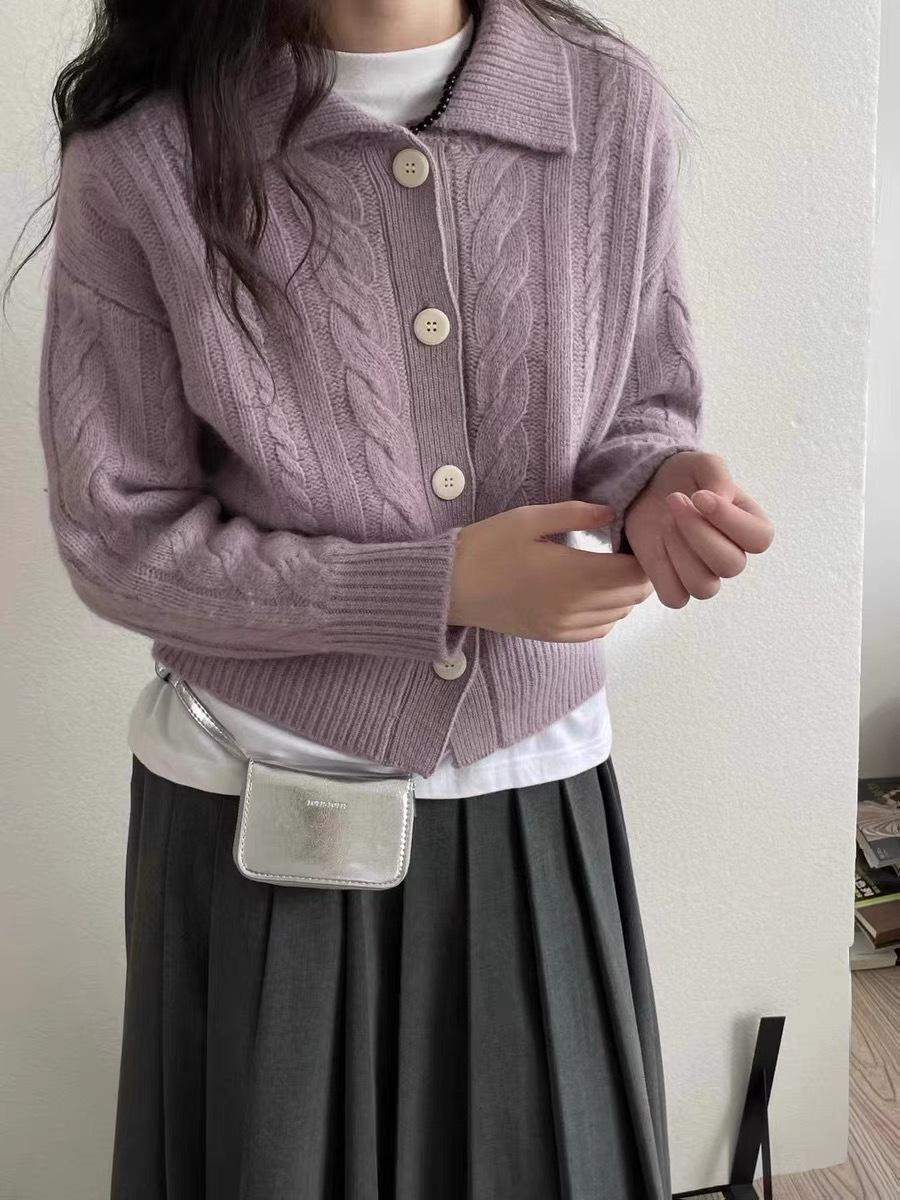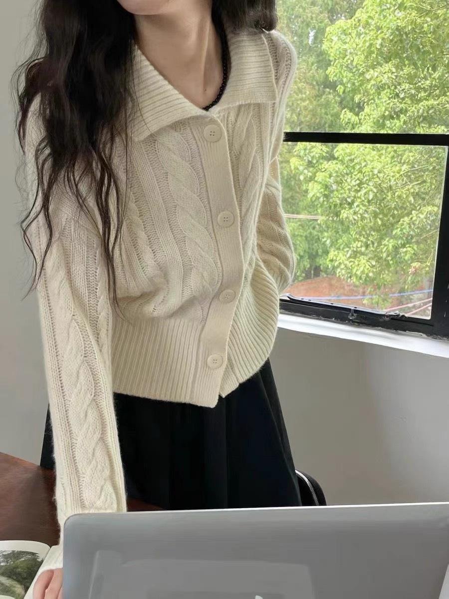 Cárdigan de lana pura con solapa torcida coreana para mujer, suéter de cachemira de punto suelto, chaqueta, otoño e invierno