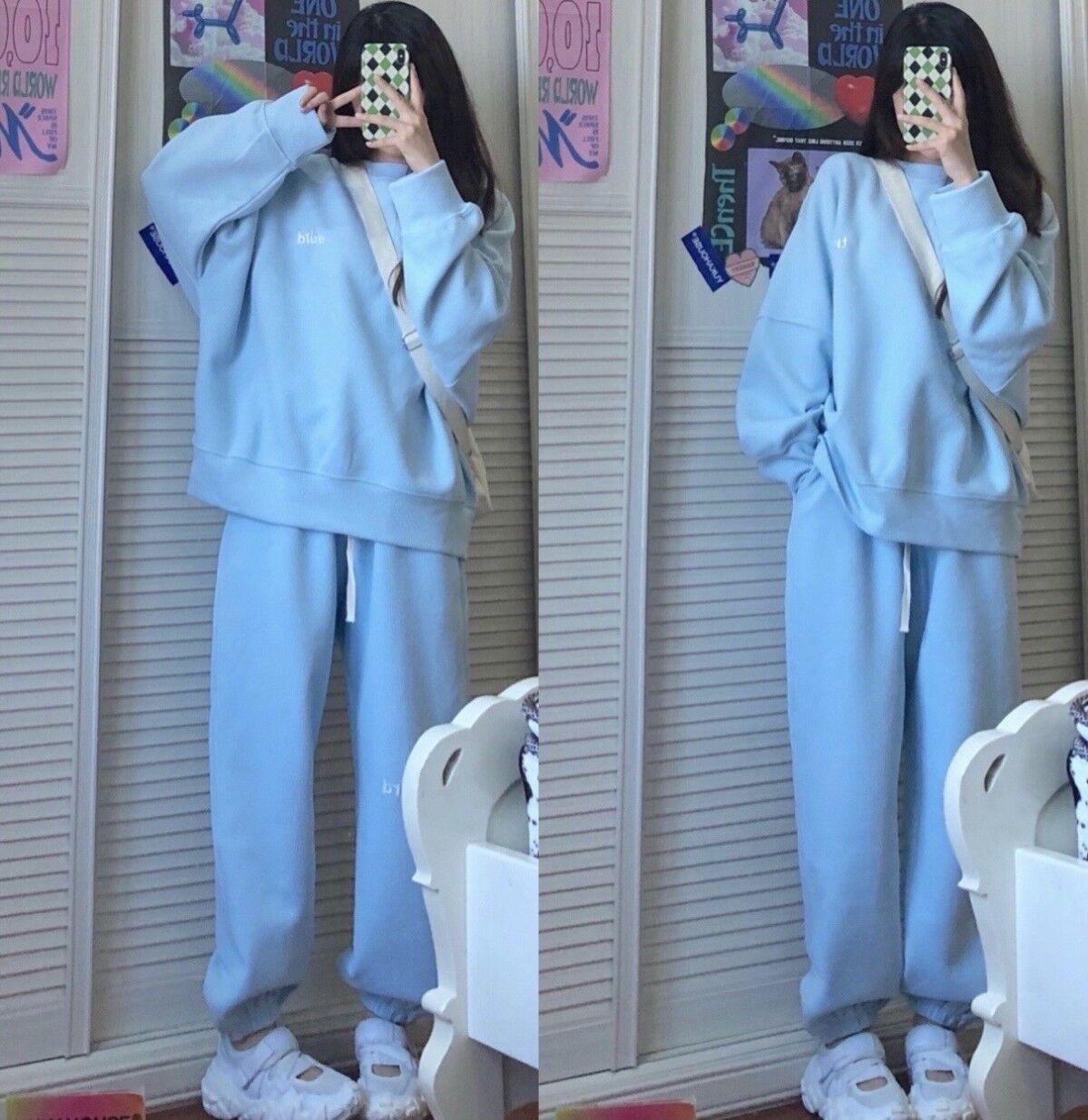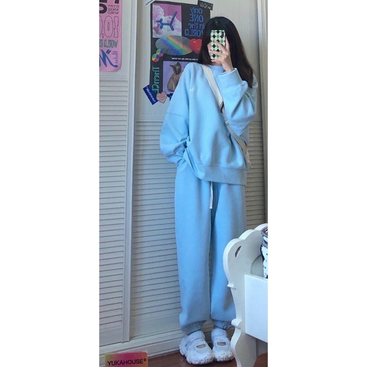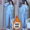 Traje deportivo engrosado con forro polar para mujer Otoño e Invierno Estilo coreano Holgado Moderno Sudor Casual de dos piezas Wafflick