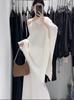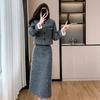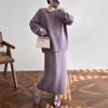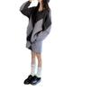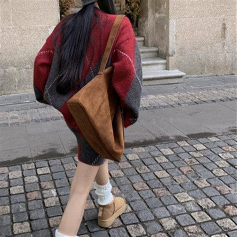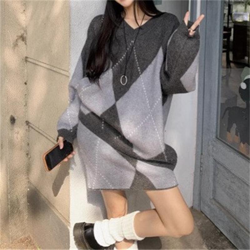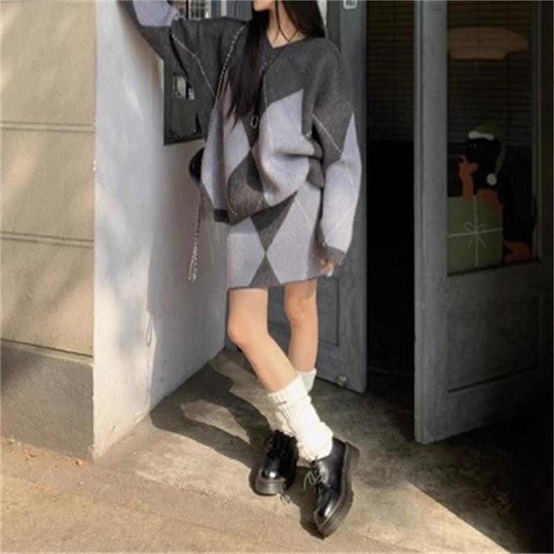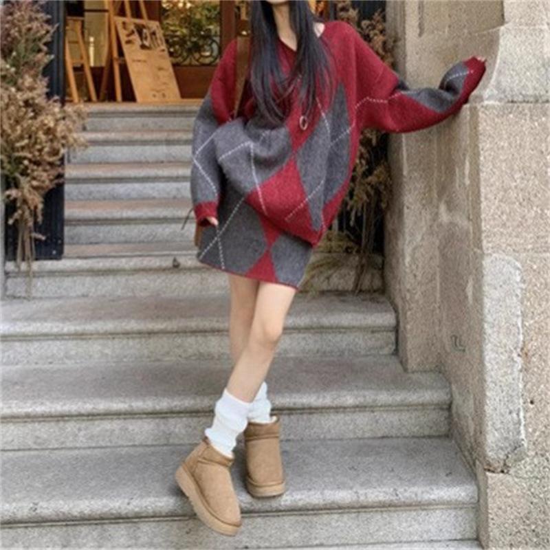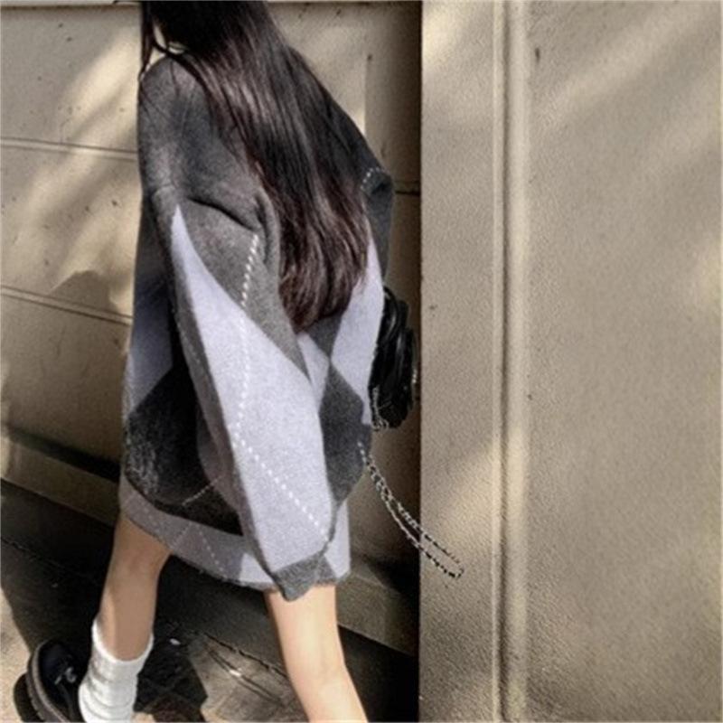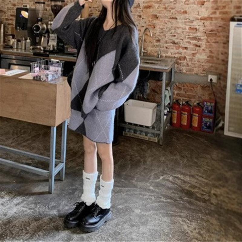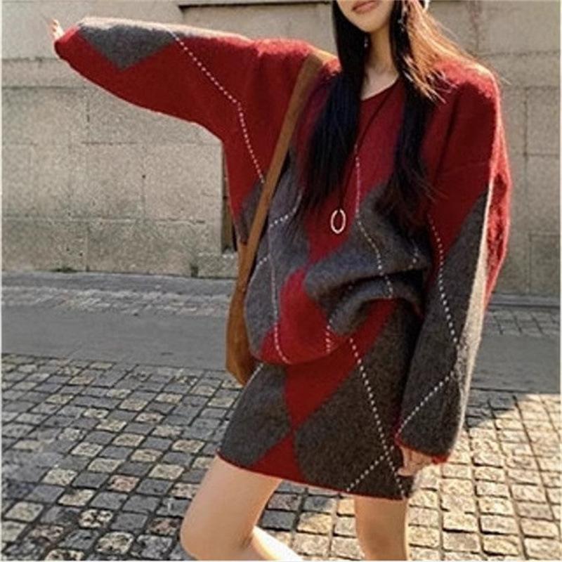 Suéter Holgado de Cuello en V con Rombos de Colores Perezosos Traje de Falda Media A para Mujer Otoño e Invierno Combinable Retro Conjunto de Dos Piezas