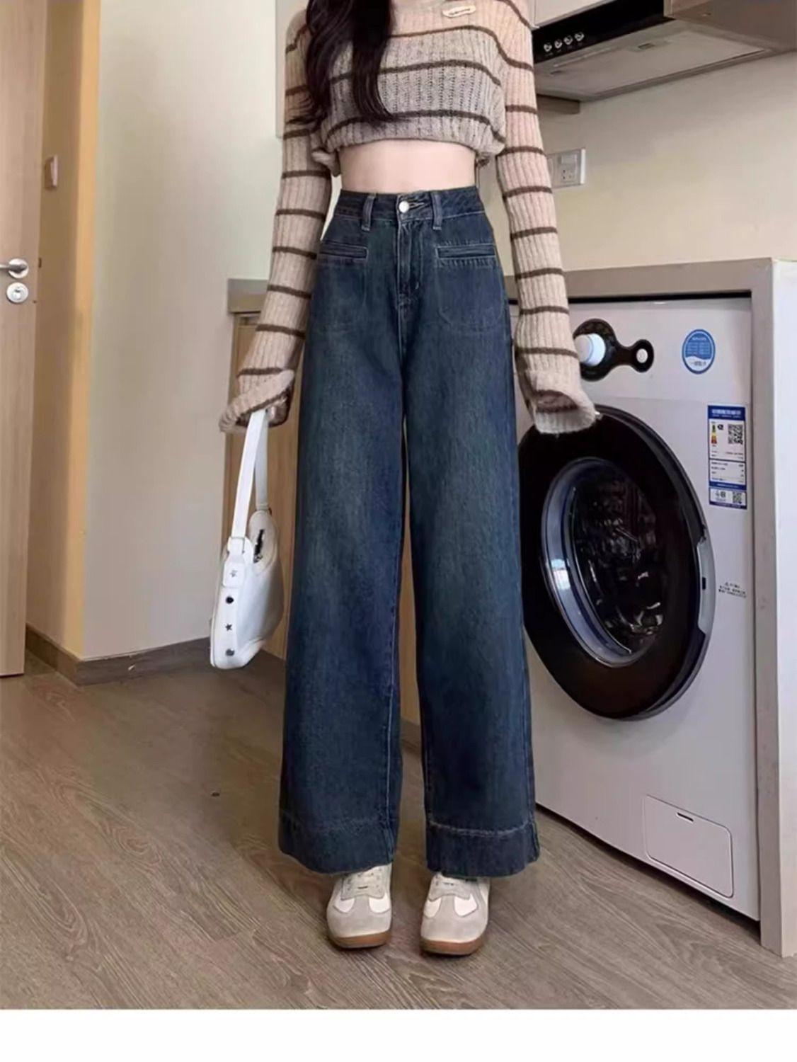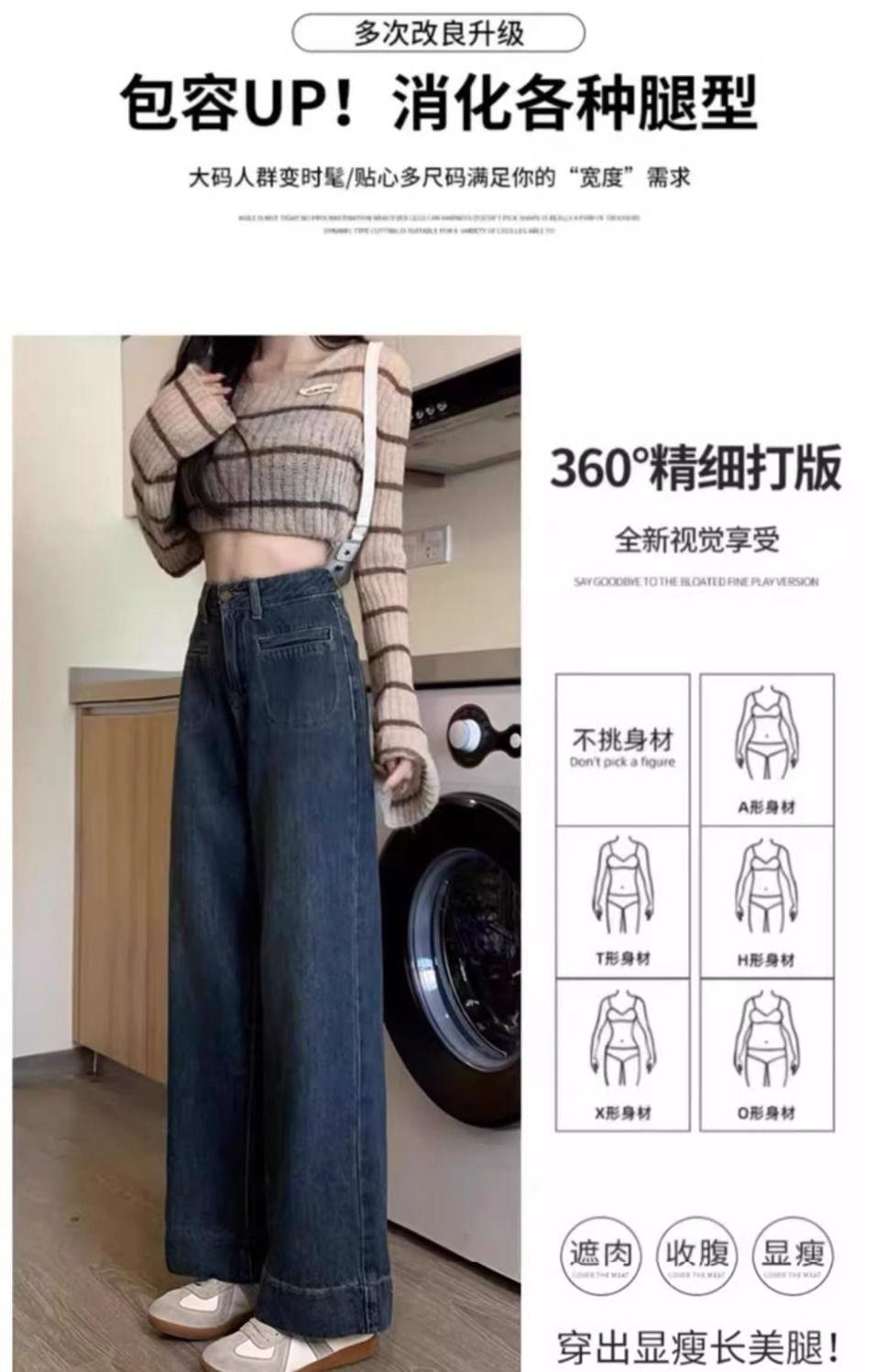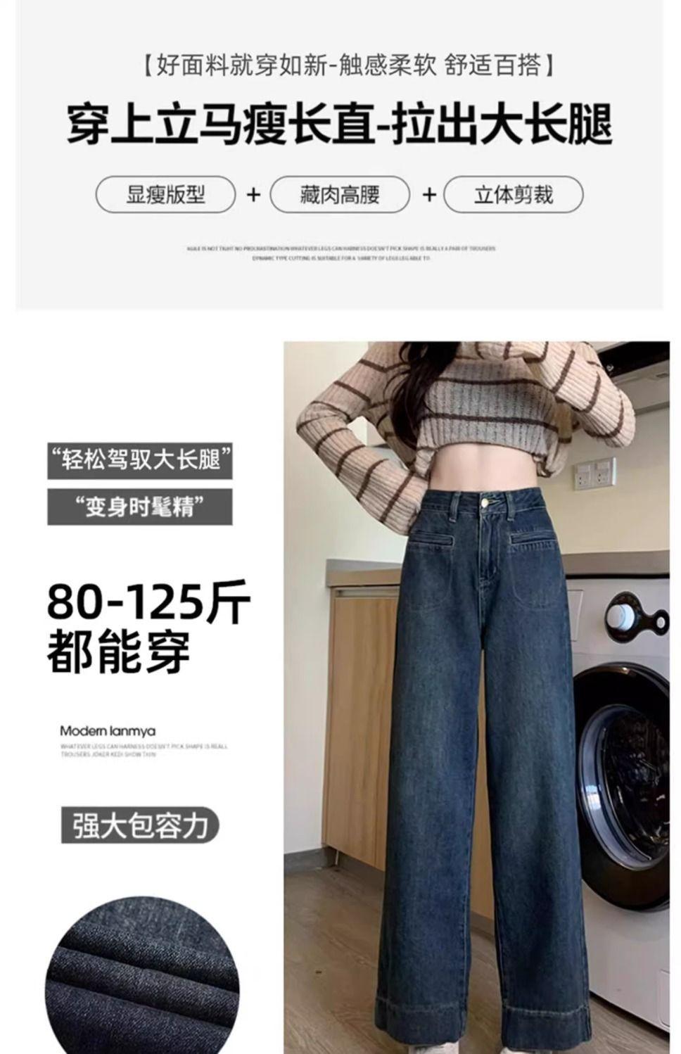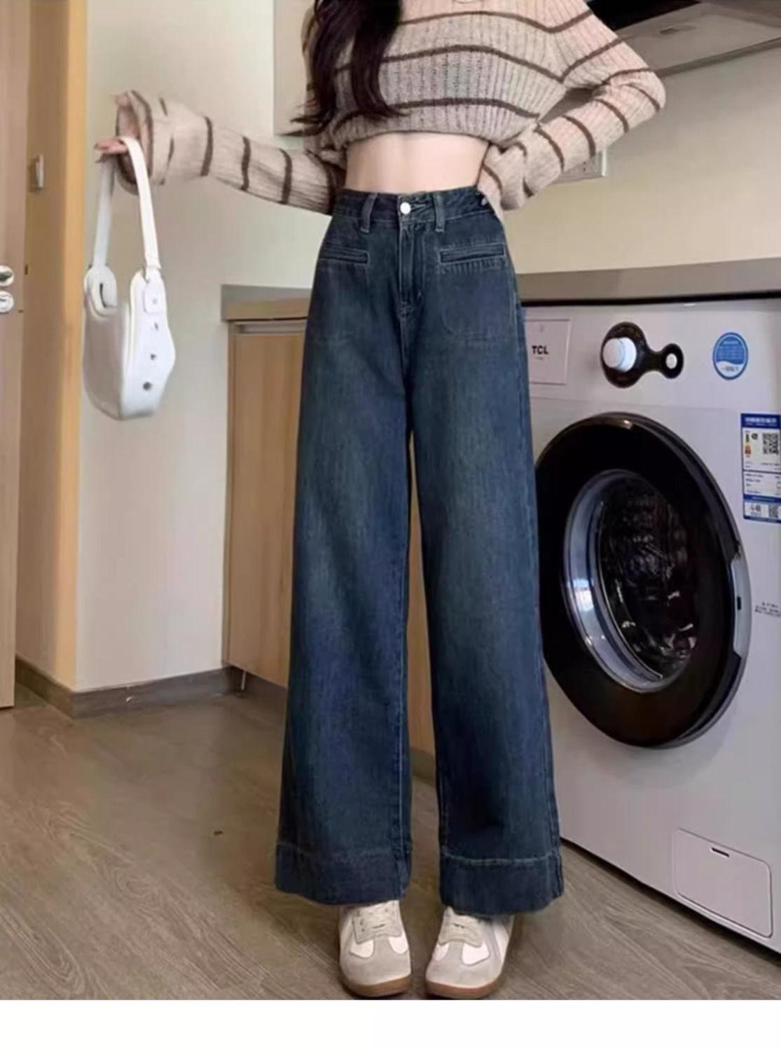 Jeans azul oscuro de talla grande para mujer 2025 Primavera Pierna Ancha Adelgazantes Cintura Alta Sueltos Pantalones Rectos Pequeños