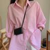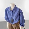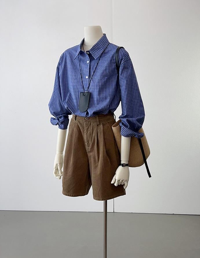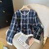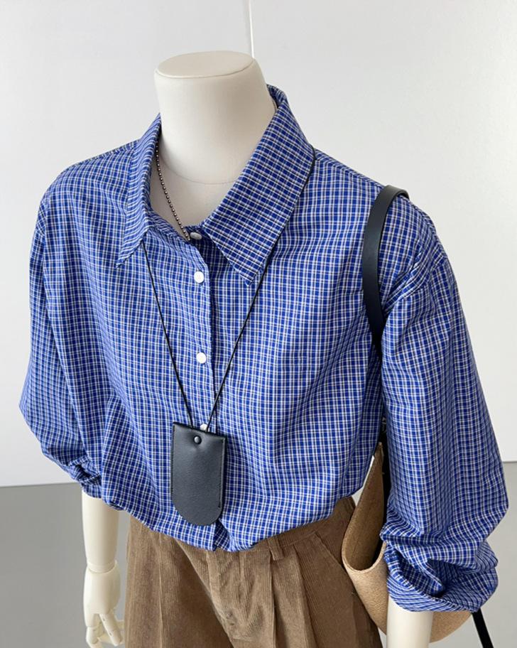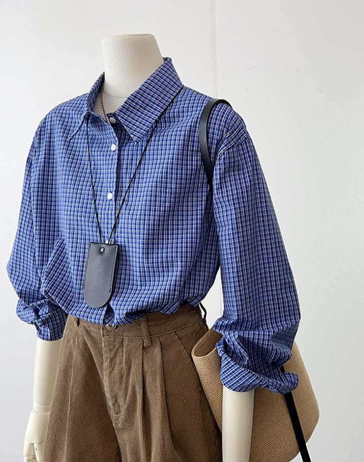 ¡La clase CHAO la recomiendo! Es realmente bonito ~ Camisa de cuadros azules versión coreana para mujer, camisa versátil suelta con solapa