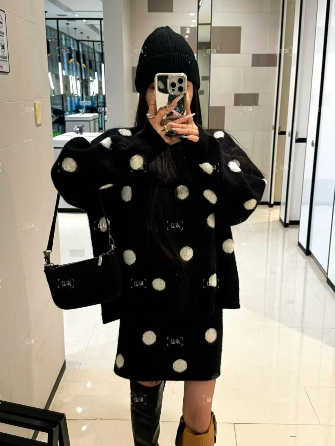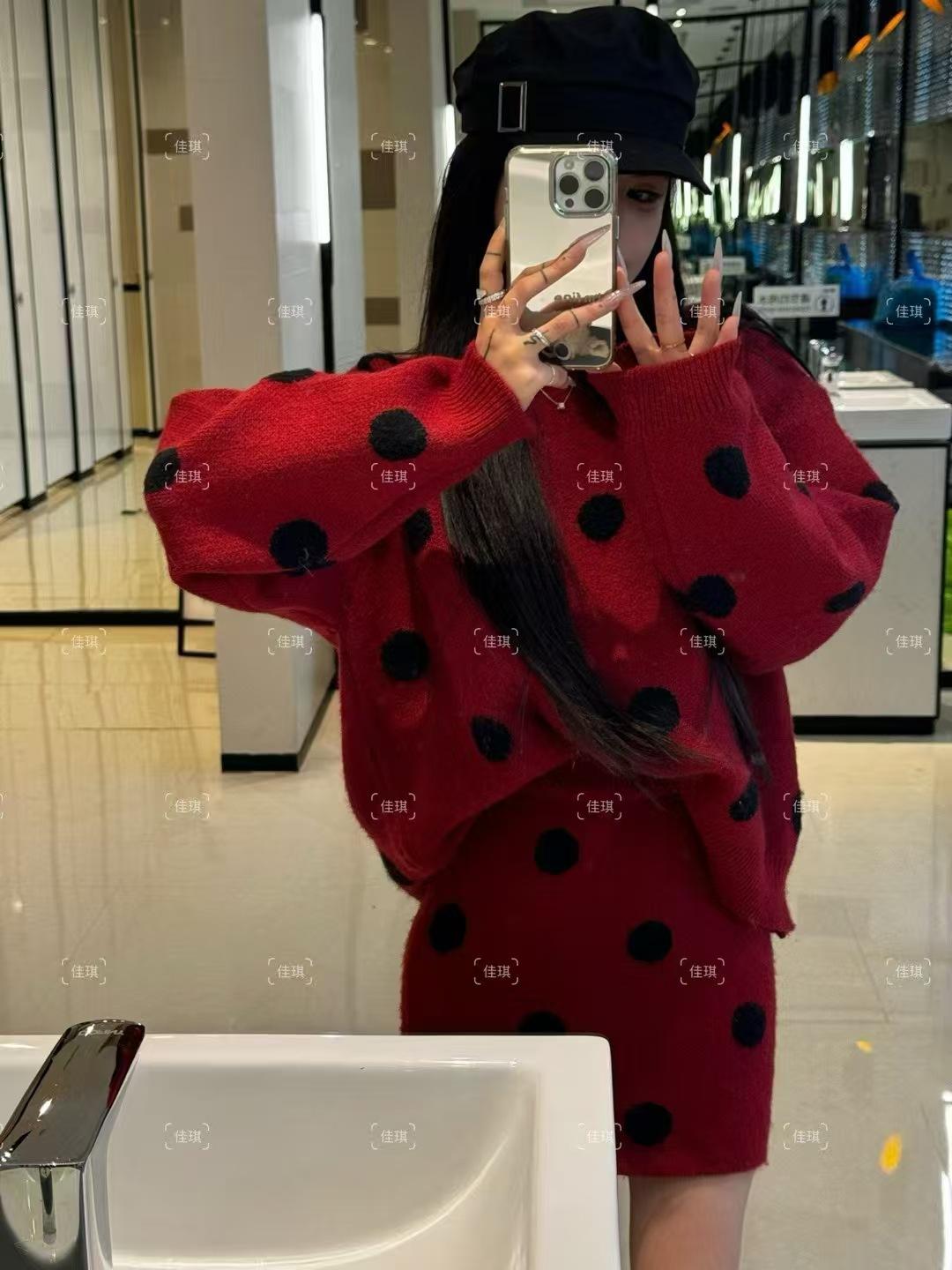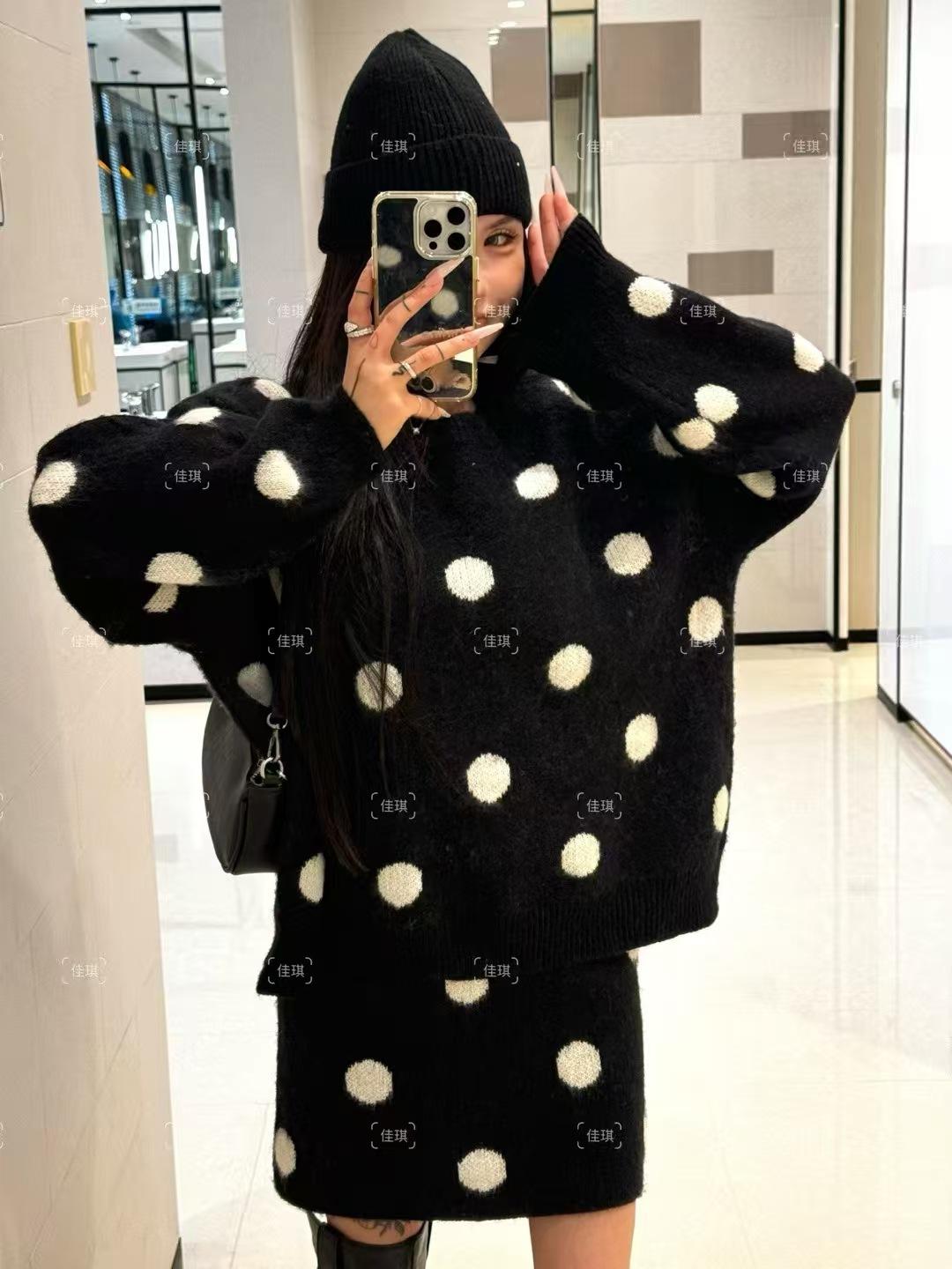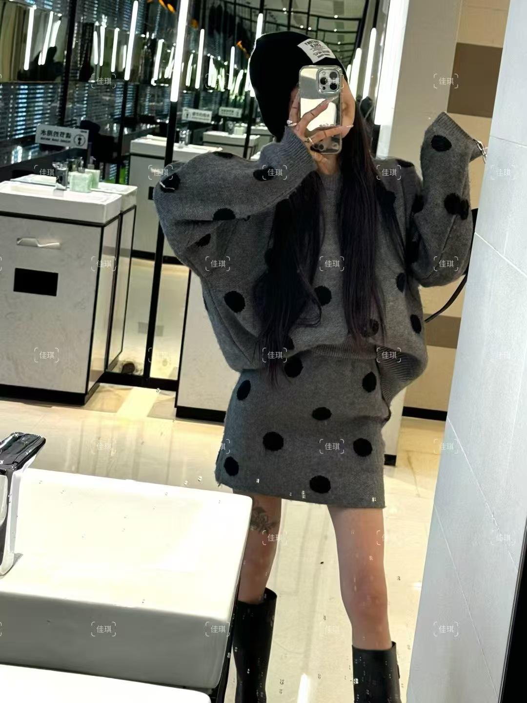 2025 Primavera y Otoño Nuevo Suéter Coreano de Contraste Tejido de Cuello Redondo Traje Diseño Nicho Falda Hippie Conjunto de Dos Piezas para Mujer