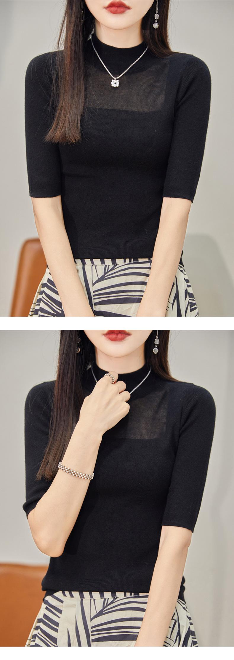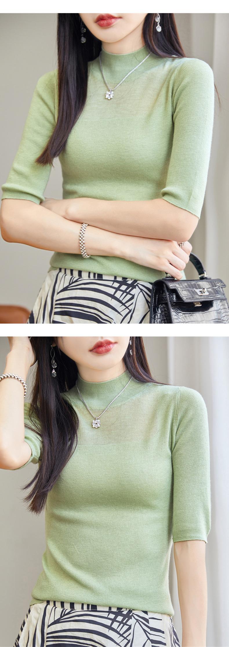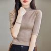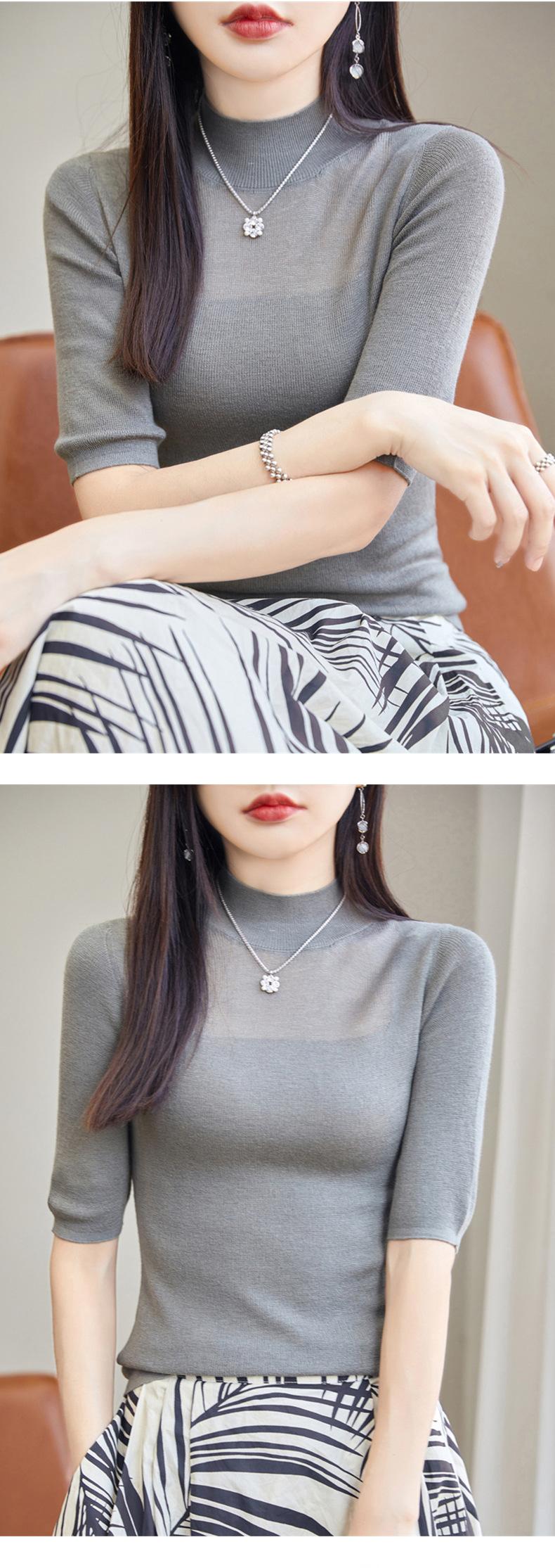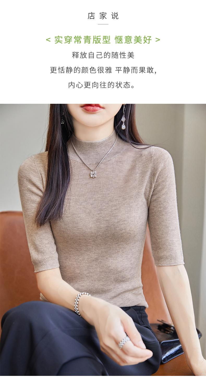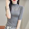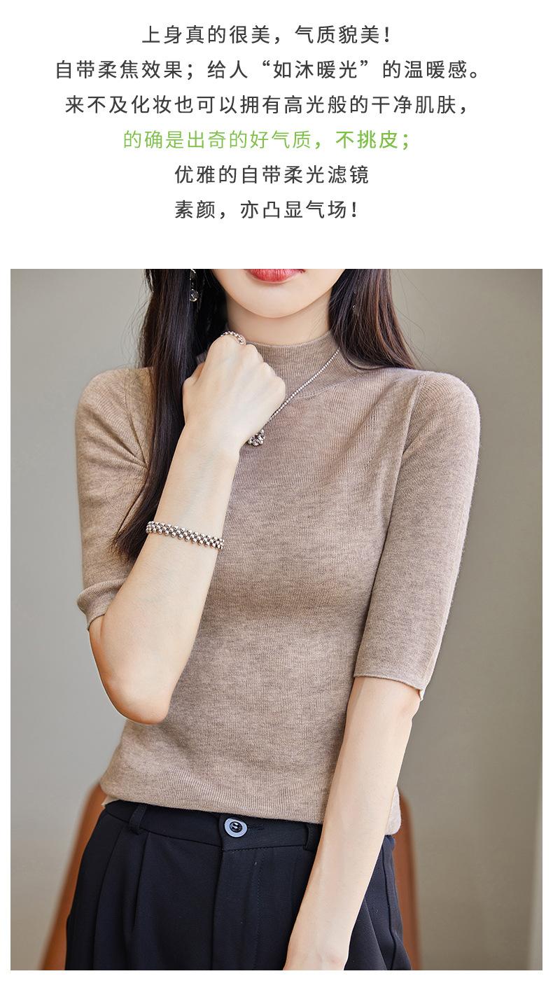 Jersey de punto de lana peinada con cuello alto para mujer, manga media, color liso, elegante, informal, sencillo, ajustado.