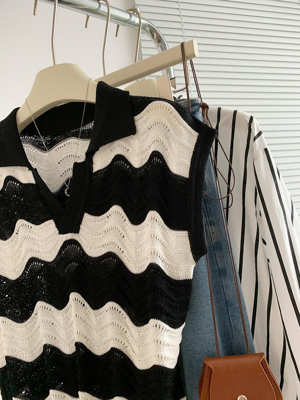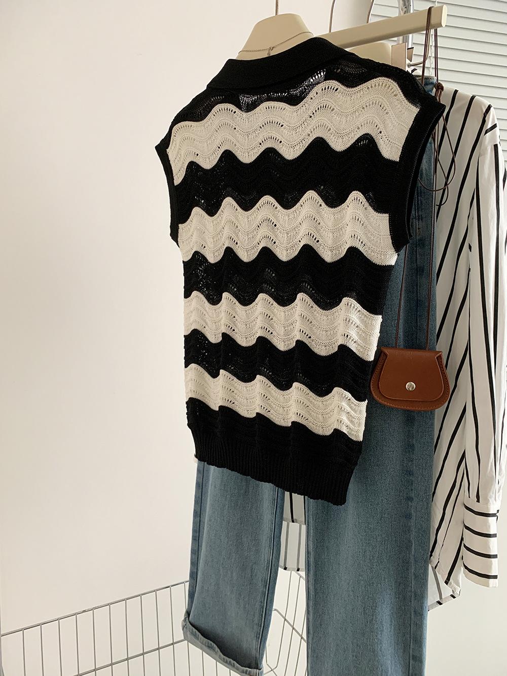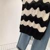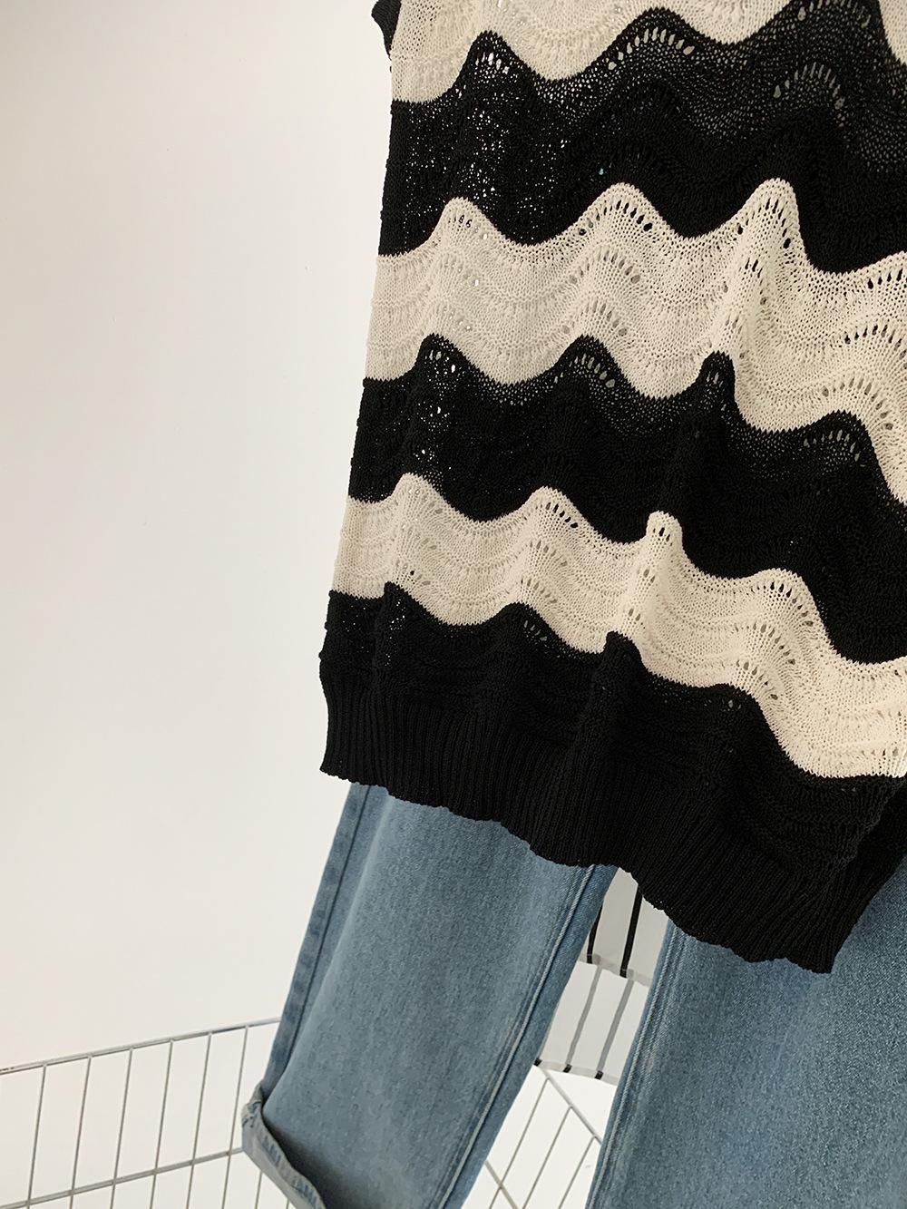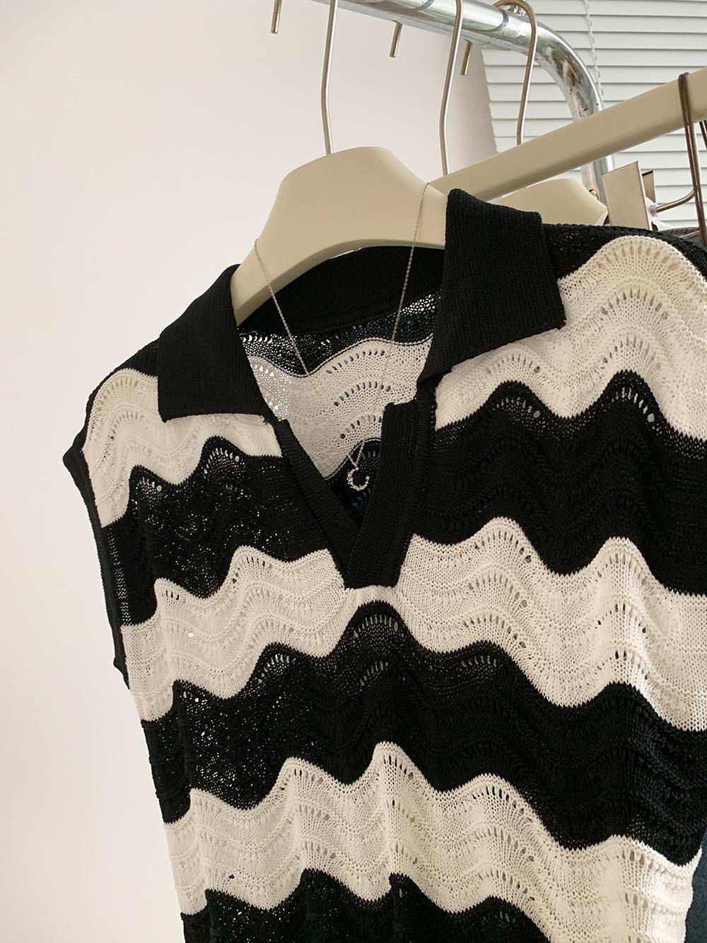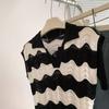 Foto Real Polo Cuello Diseño de Rayas Onduladas Blanco y Negro Nicho Tejido Camiseta de Manga Corta Moda de Mujer Look Holgado Adelgazante Verano