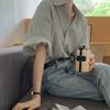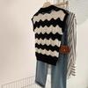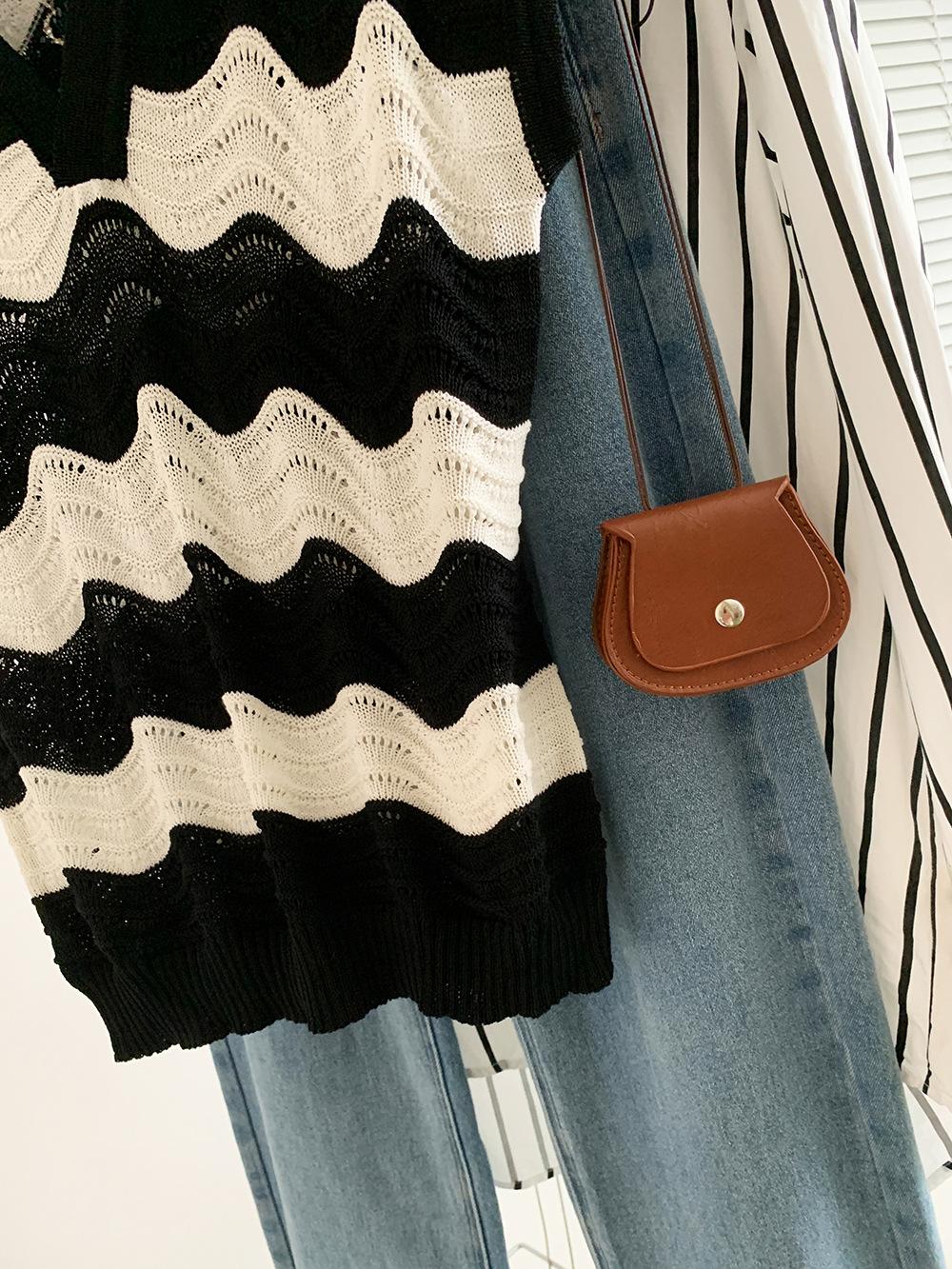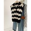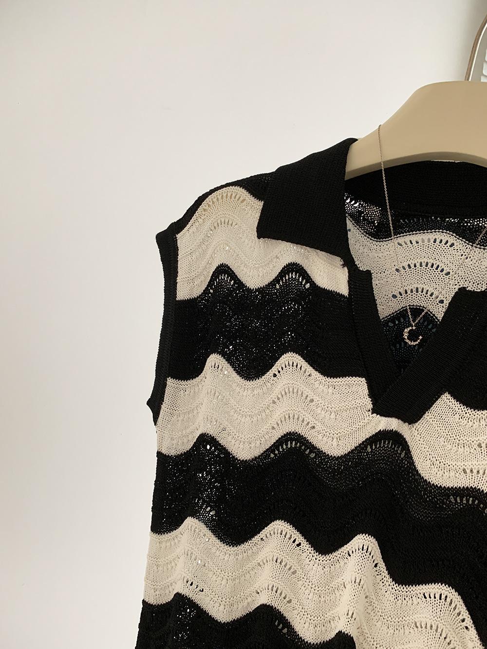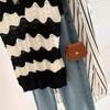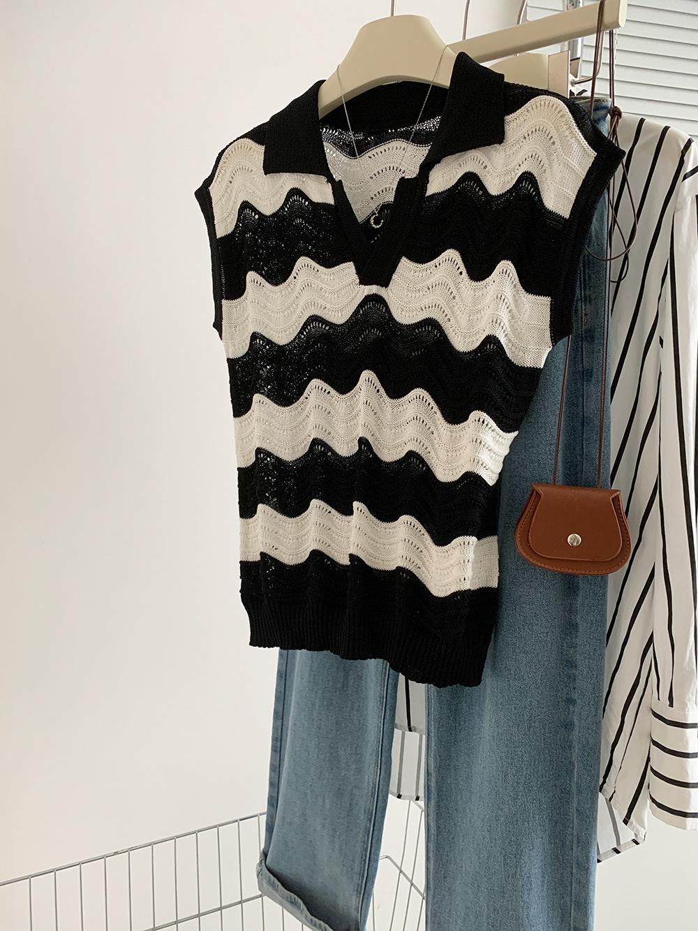 Foto Real Polo Cuello Diseño de Rayas Onduladas Blanco y Negro Nicho Tejido Camiseta de Manga Corta Moda de Mujer Look Holgado Adelgazante Verano