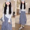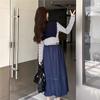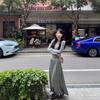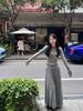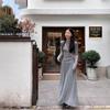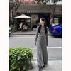 Traje gris Camiseta de manga larga para mujer Top Primavera Falda drapeada Falda larga línea A Conjunto casual de dos piezas