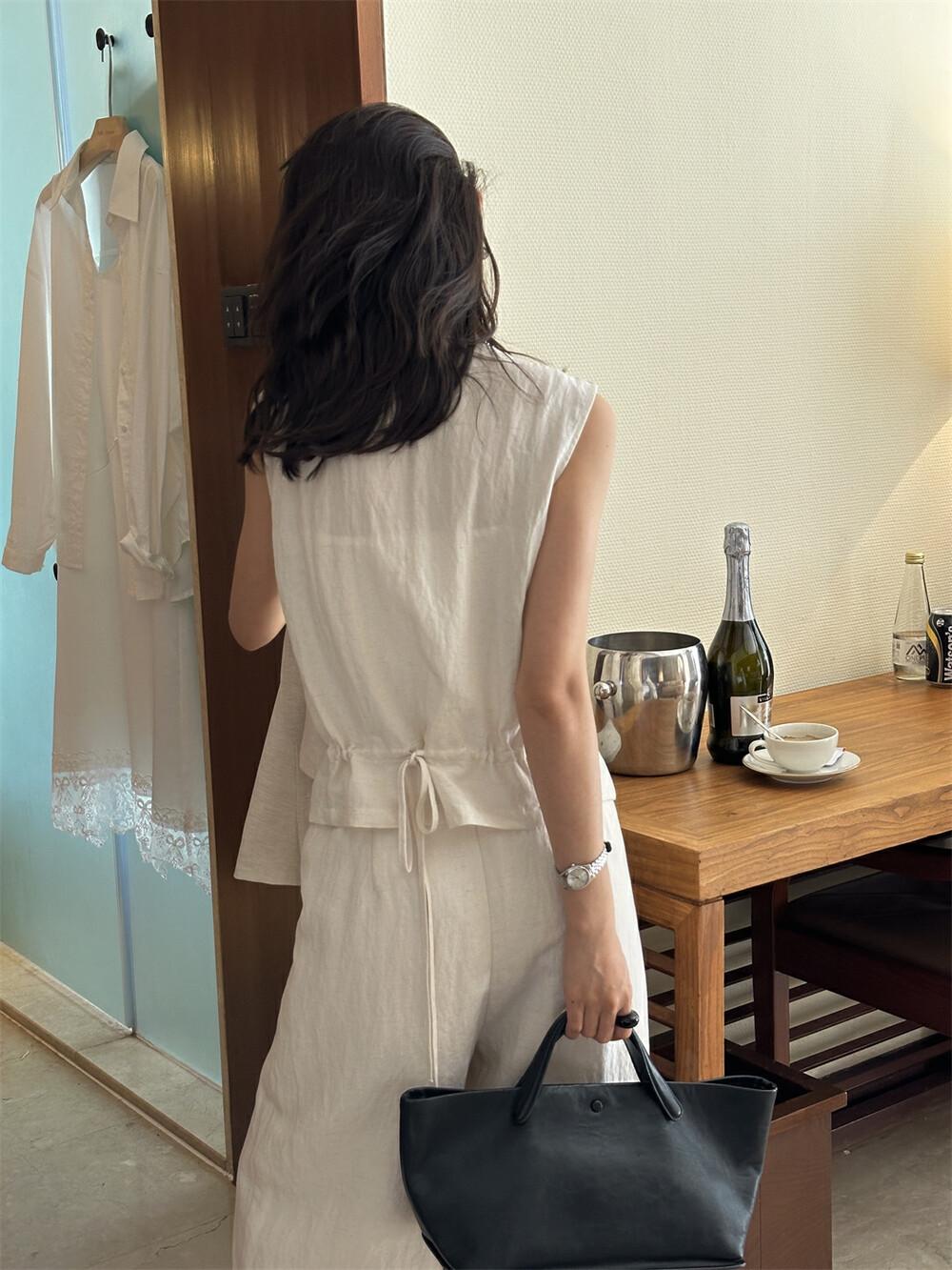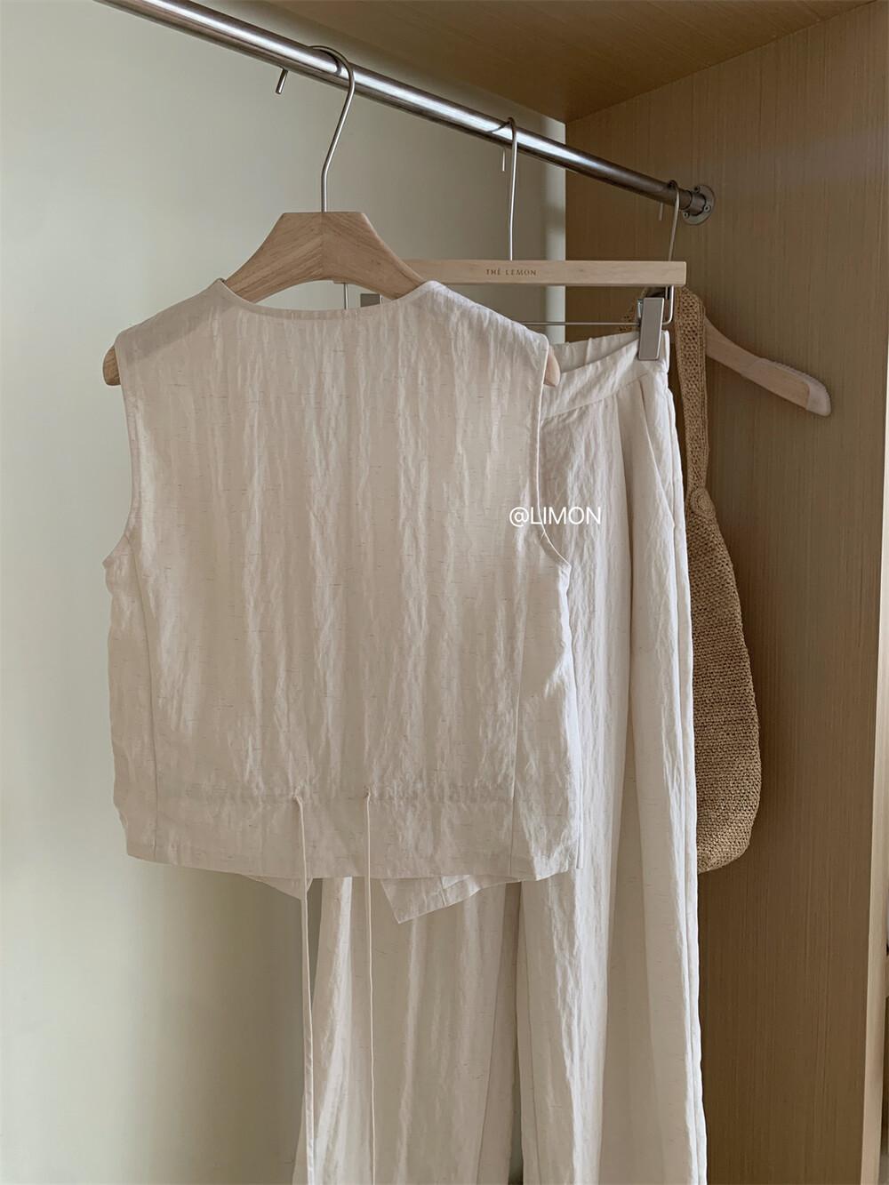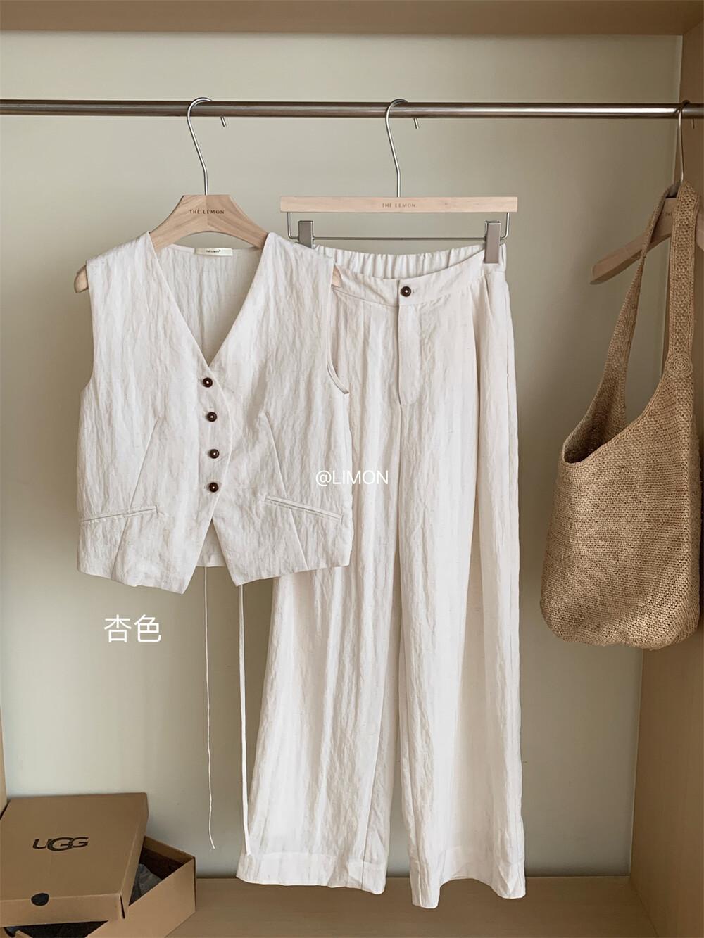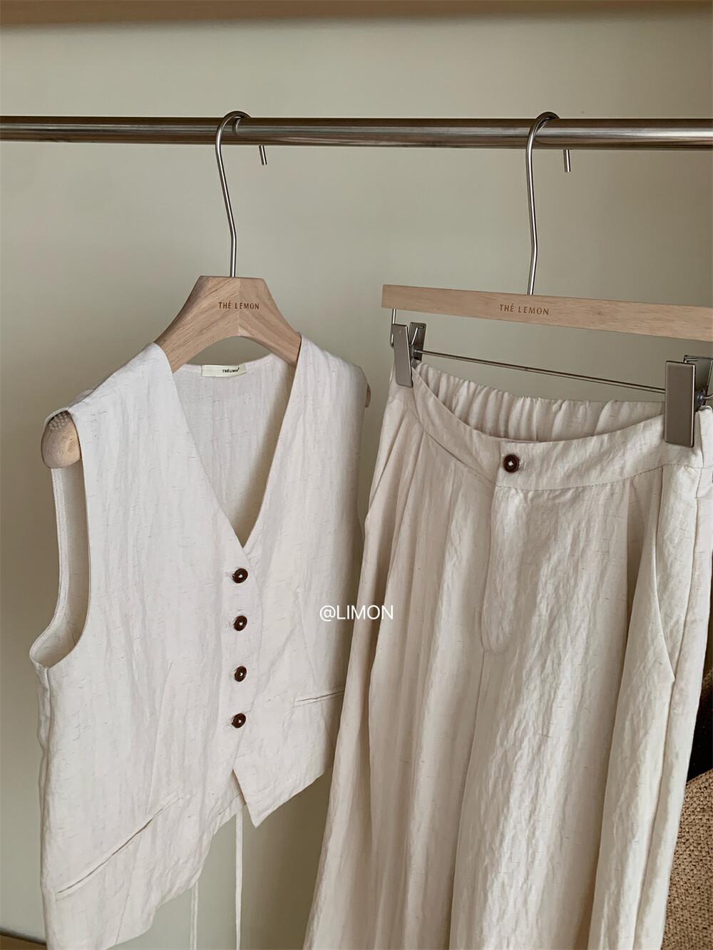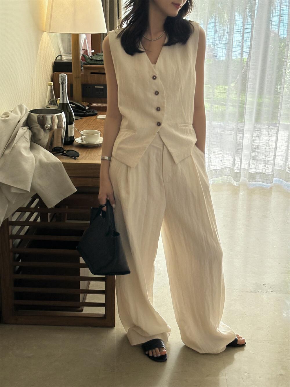 EL LIMON Té Verde de Limón Premium Sense Ajuste Slim Cuello en V Chaleco de Lino Pantalones de Pierna Ancha para Mujer Traje de Pantalón Casual Verano
