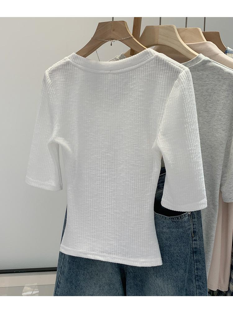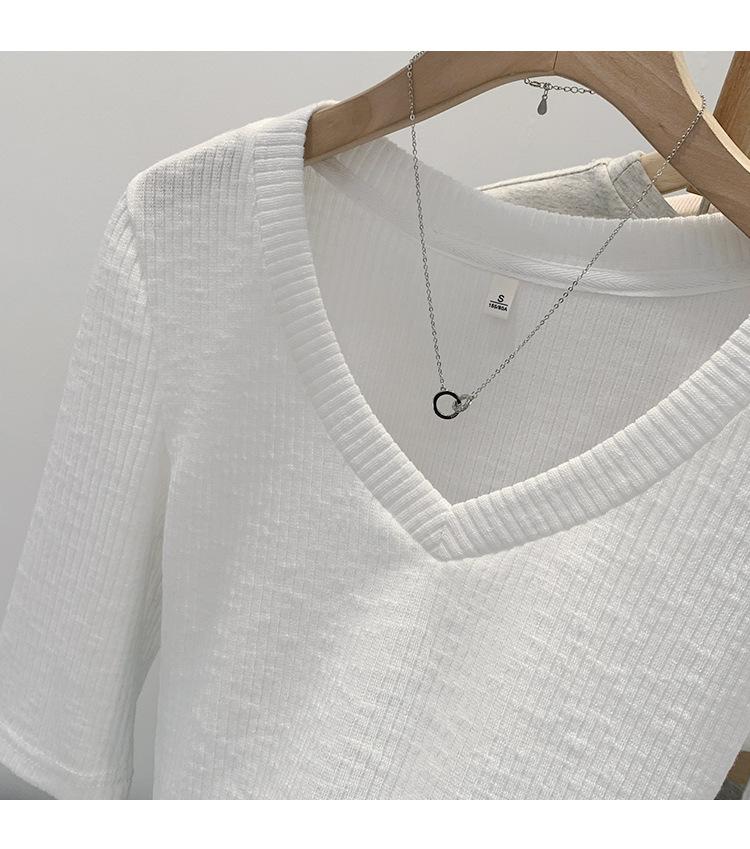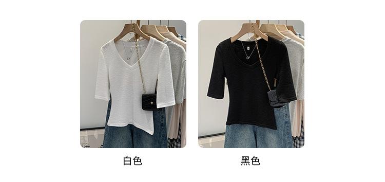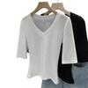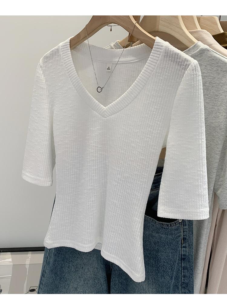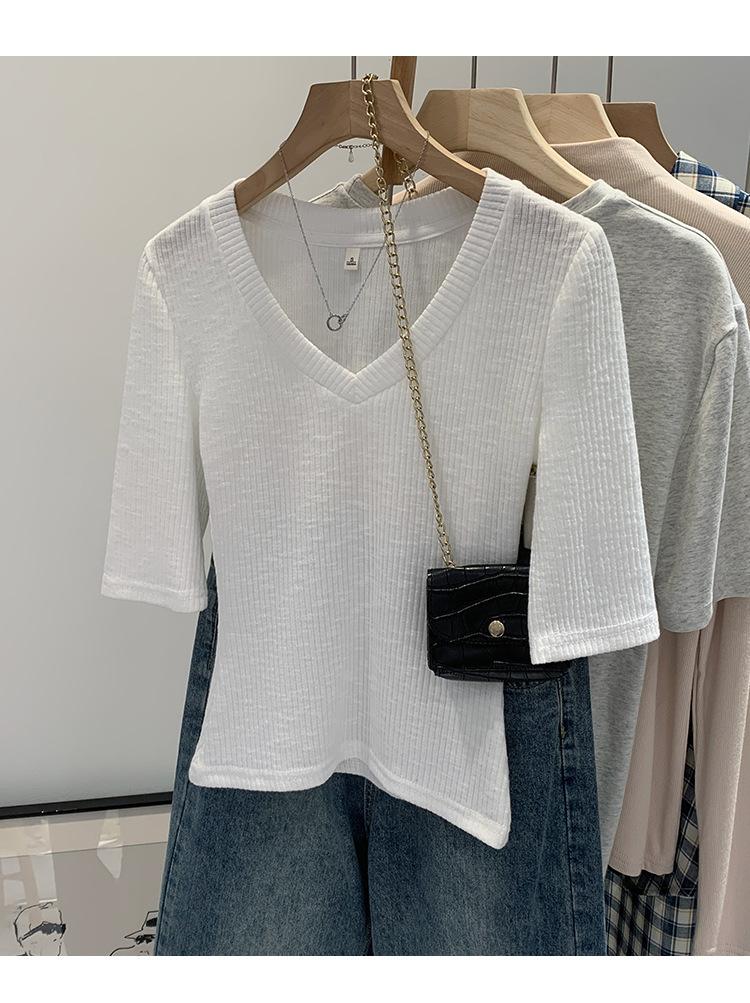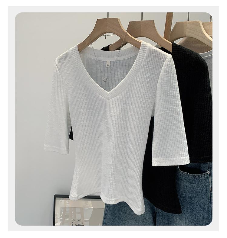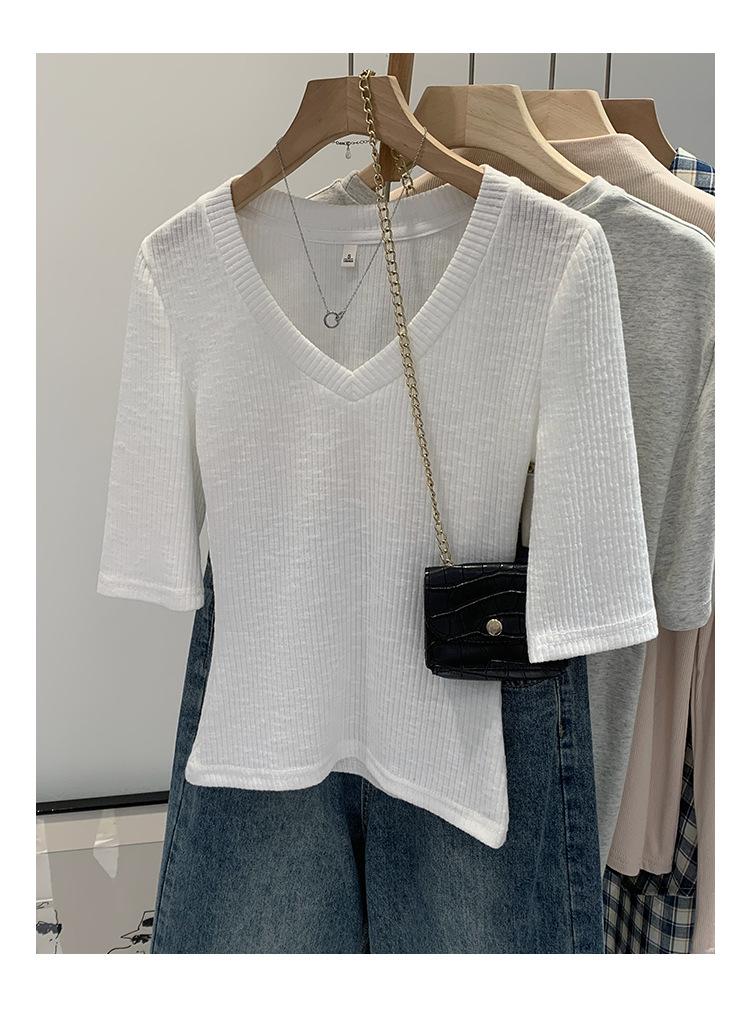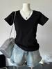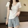 Playera Blanca de Manga Corta con Cuello en V y Textura en el Hombro Derecho para Mujer, Tendencia 2025 Principios de Otoño Verano, Nueva Elegante Slim Top Corto