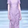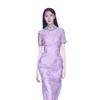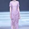 Nuevo cheongsam chino con estampado floral morado, primavera 2025, vestido formal francés único con cintura ajustada.